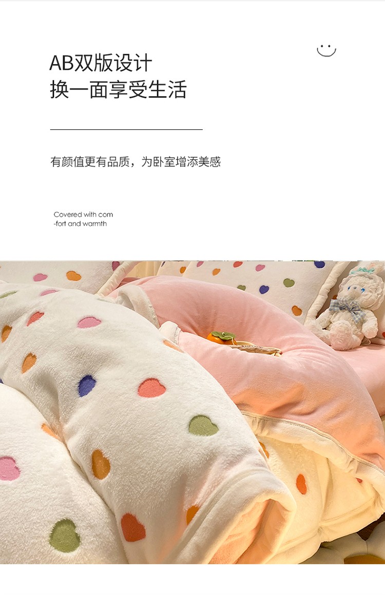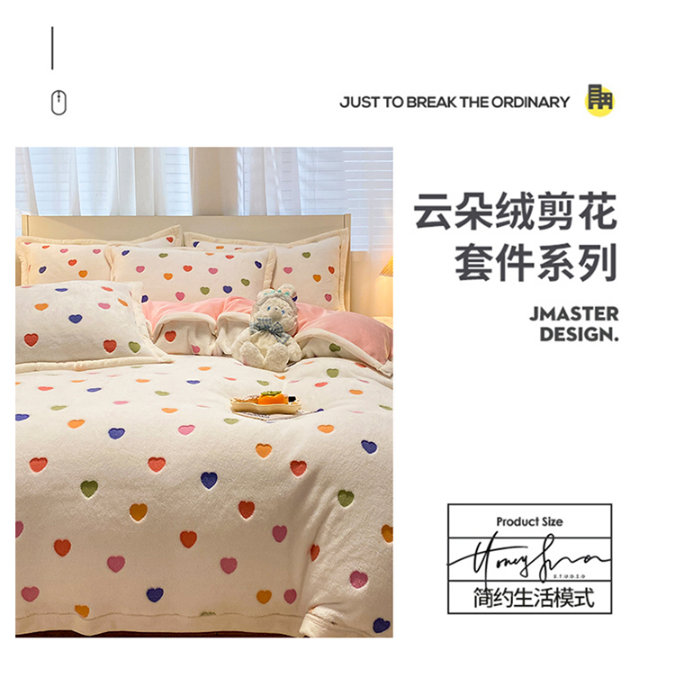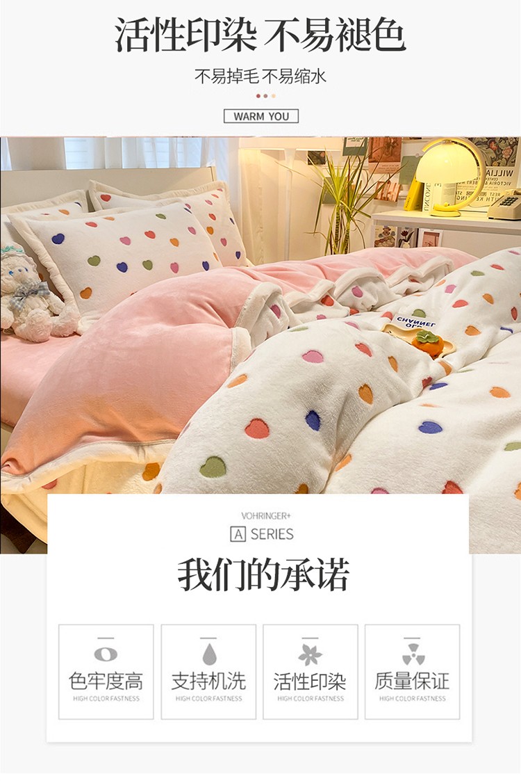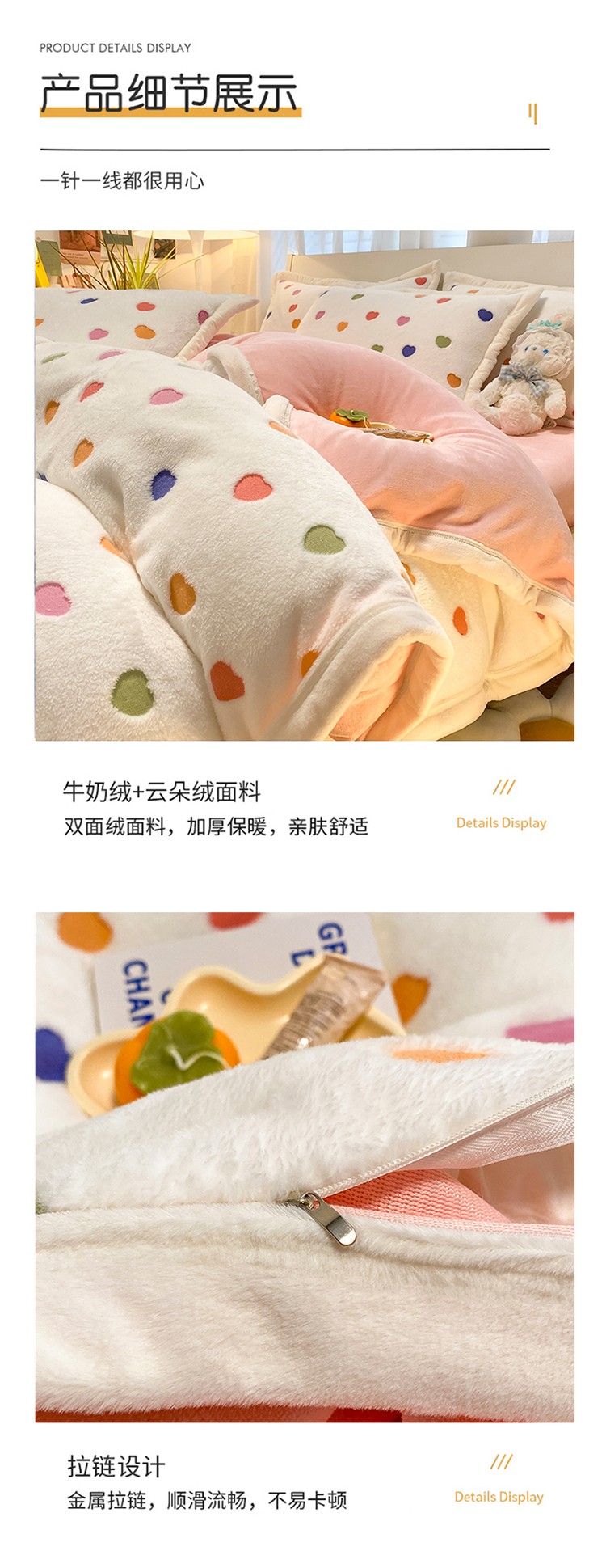 商品名称:川悦生活 2022小清新牛奶绒纯色印花云朵绒四件套 多彩心心