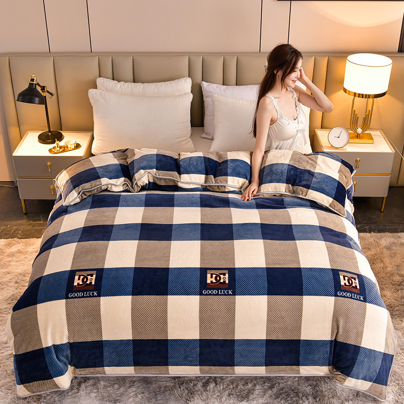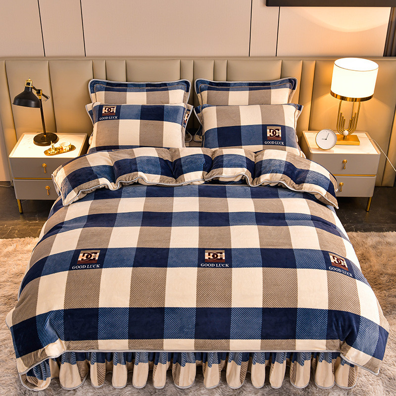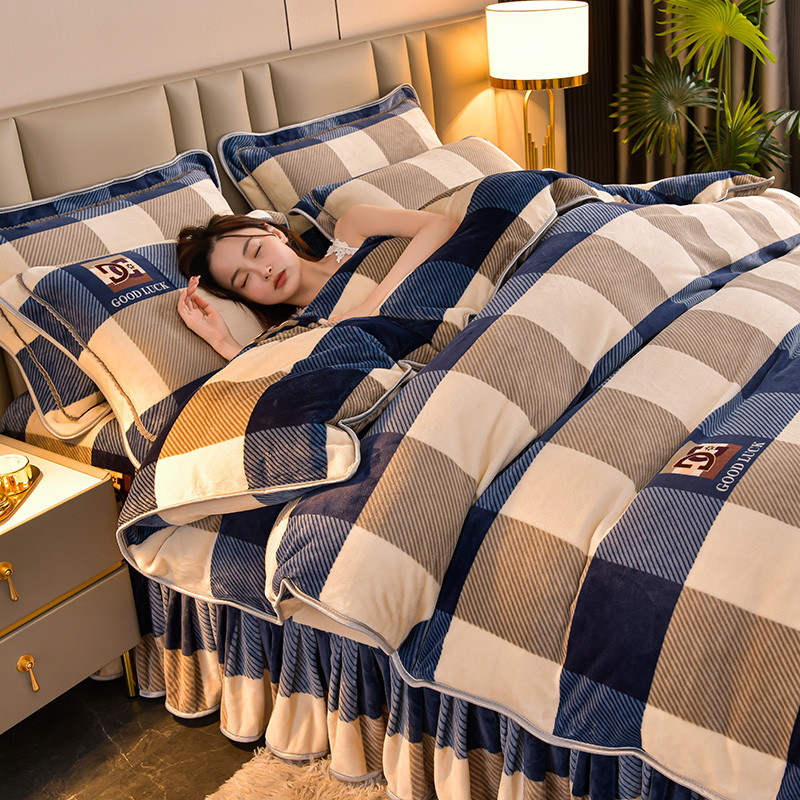 新8.5-9.5斤法莱绒四件套珊瑚牛奶金貂绒四件套床裙蓝大格