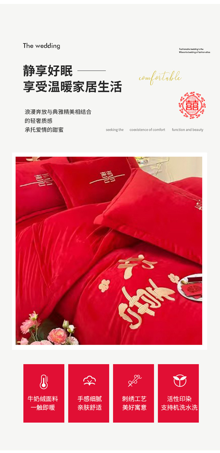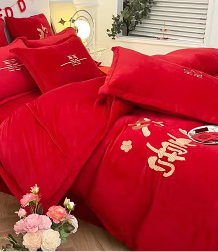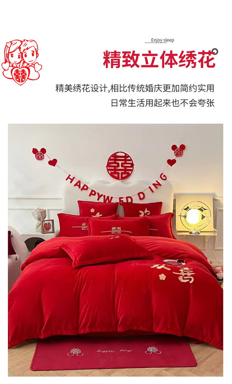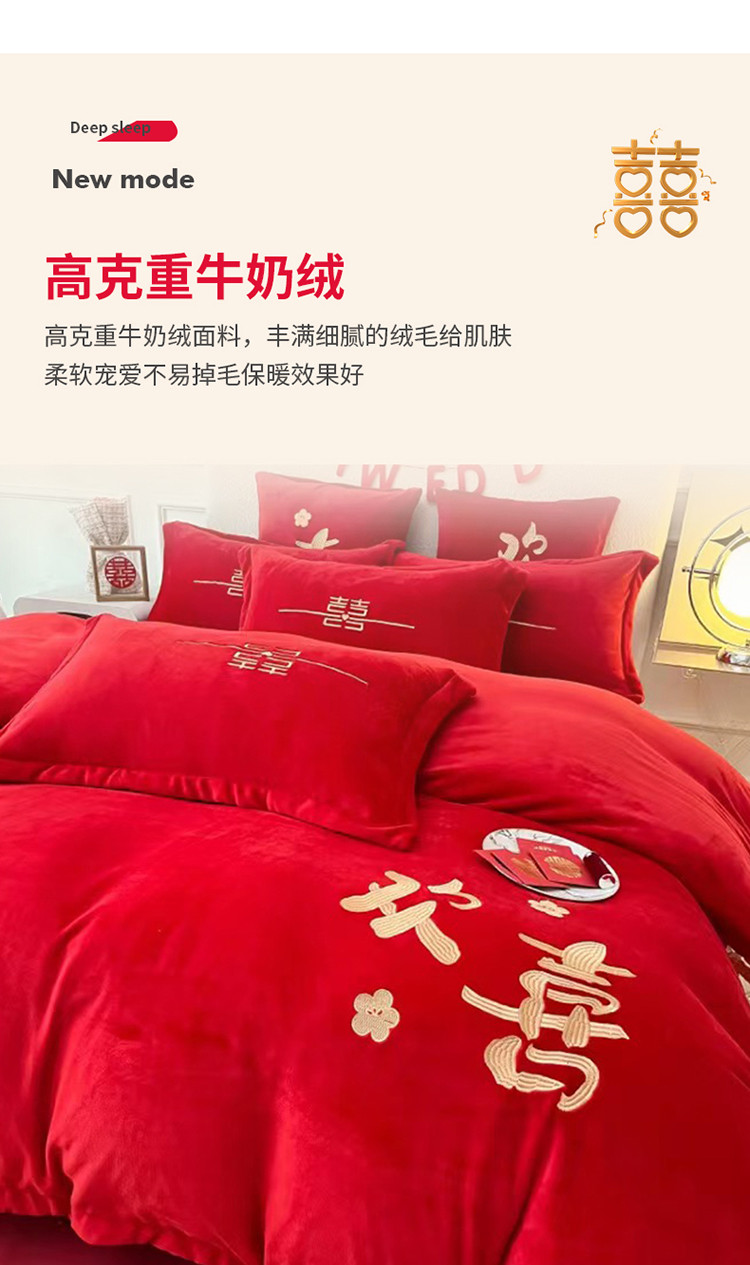 (总)千希家纺 2023新款欢喜系列婚庆220克牛奶绒大红四件套