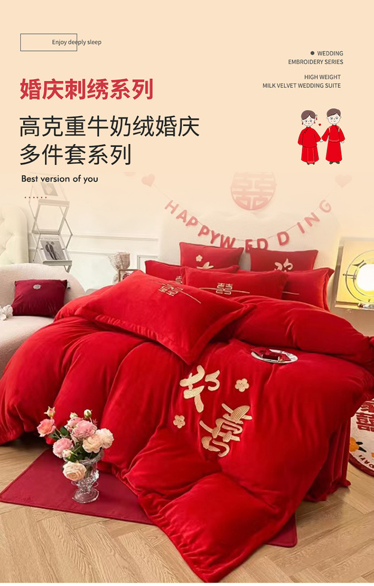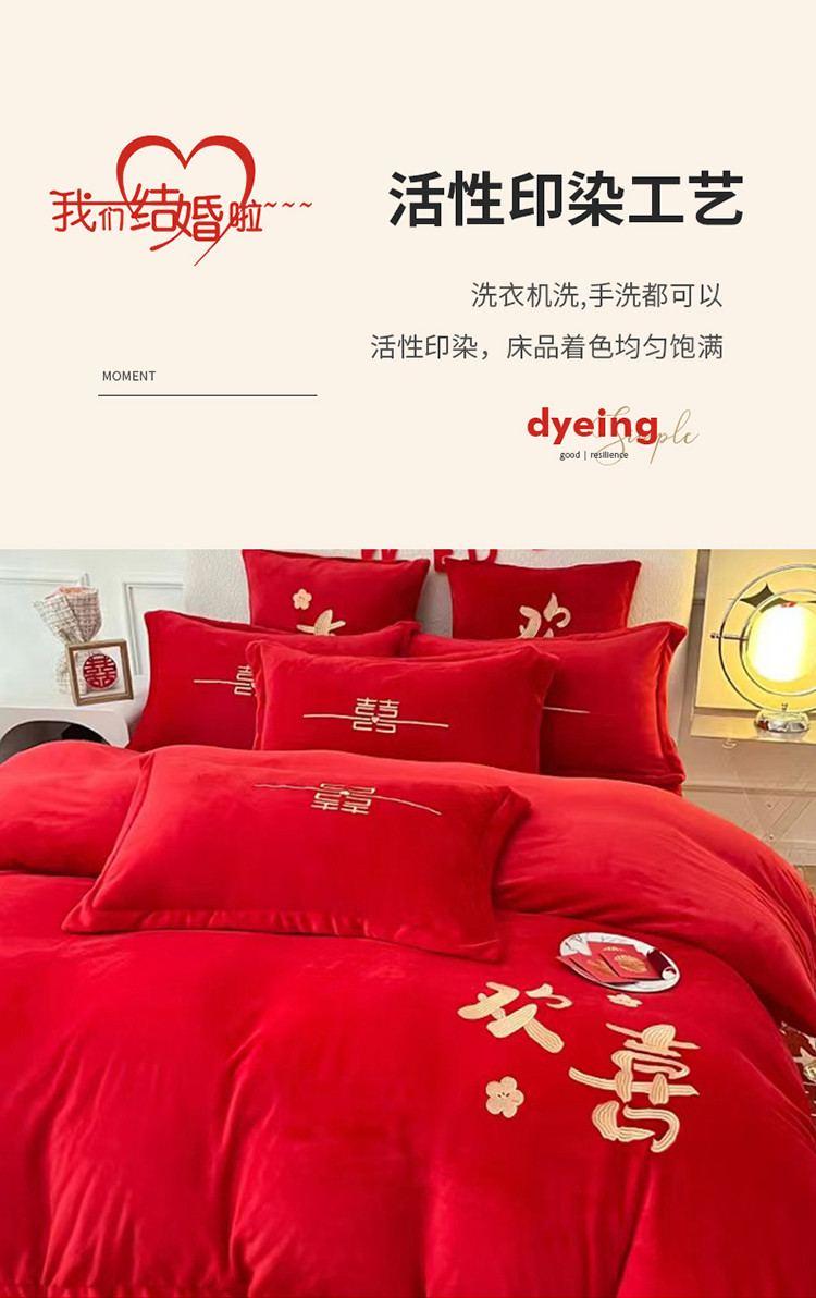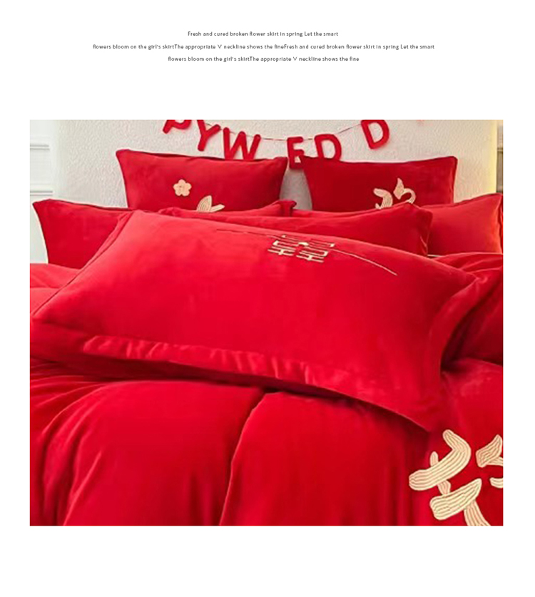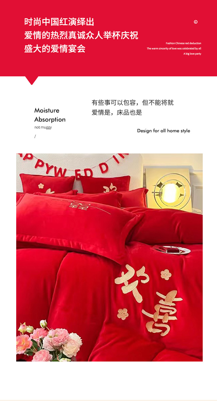 (总)千希家纺 2023新款欢喜系列婚庆220克牛奶绒大红四件套