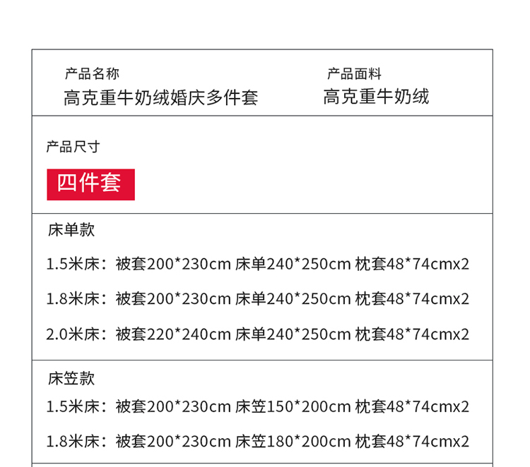 商品名称:(总)千希家纺 2023新款欢喜系列婚庆220克牛奶绒大红四件套