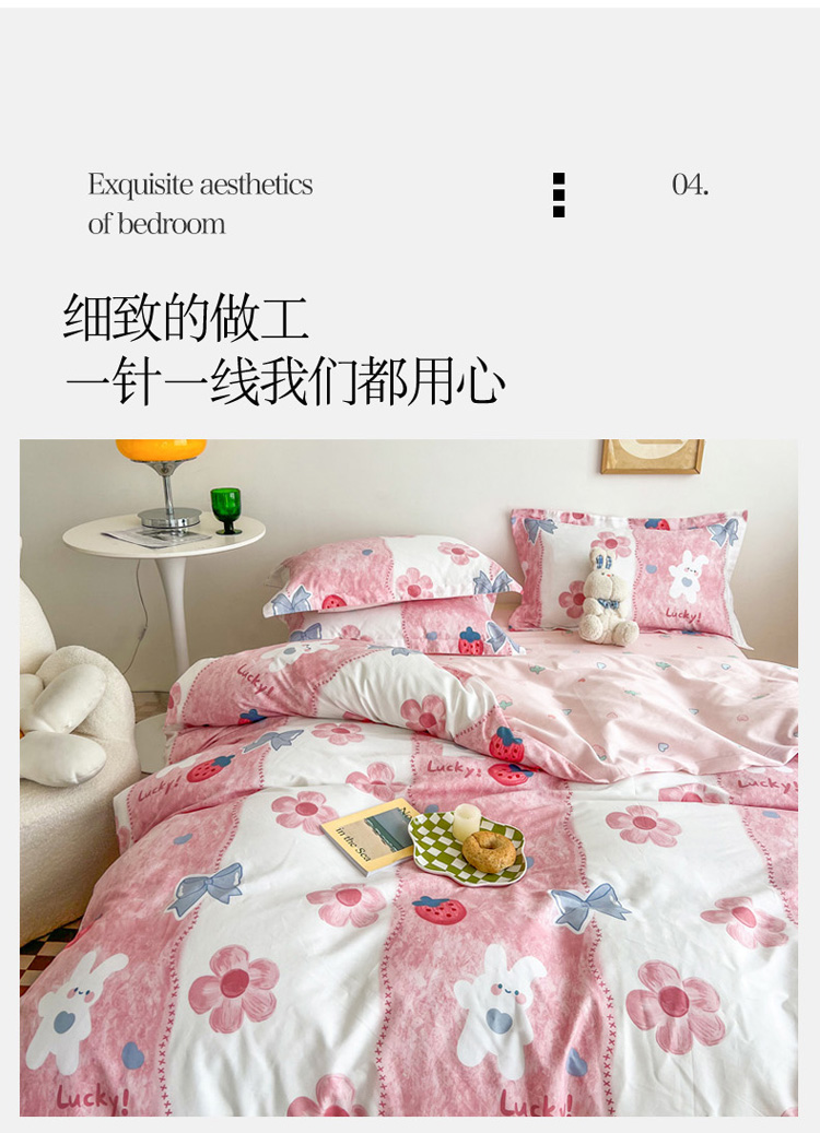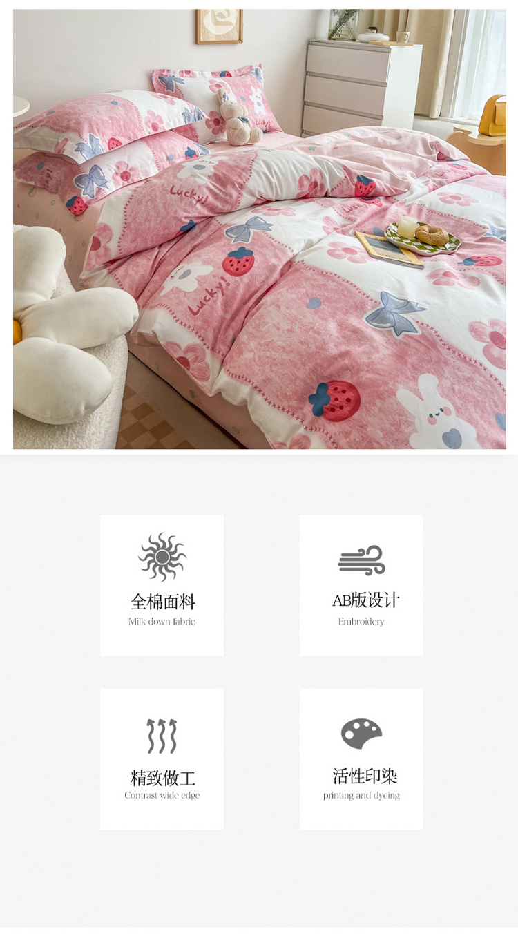 盛馨家纺 全棉ins北欧风高支高密全棉喷气小清新纯棉四件套 草莓兔