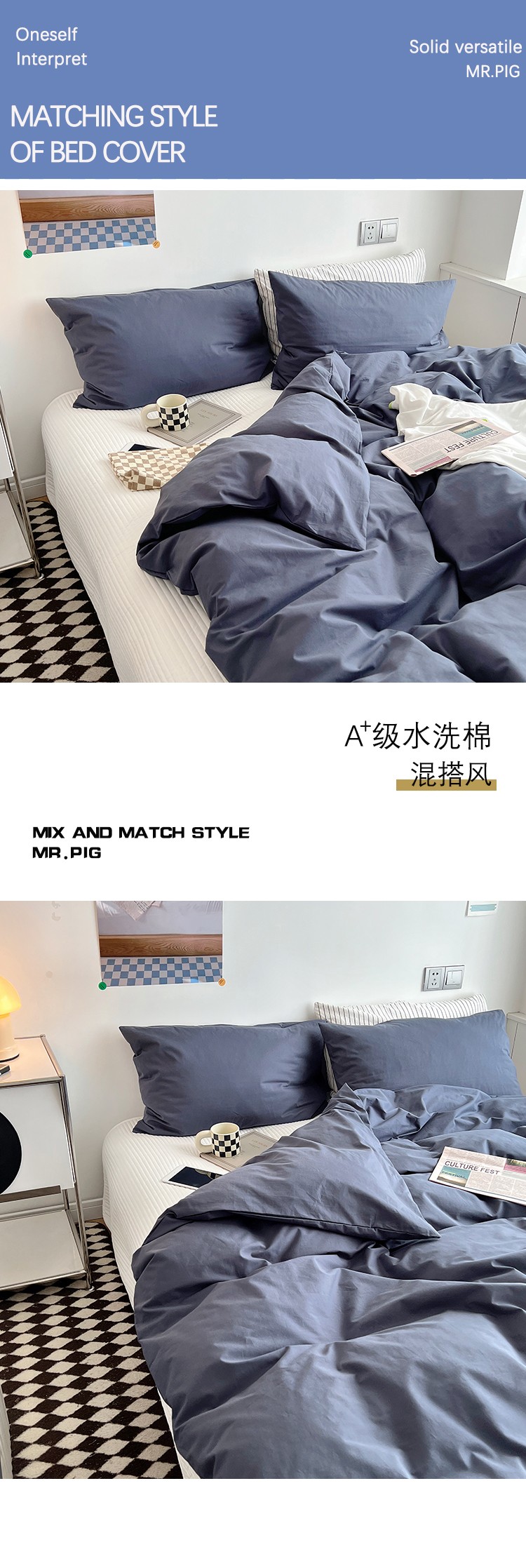 商品名称:猪先生 2022新款极简风纯棉床盖床笠四件套 藏青+极简白