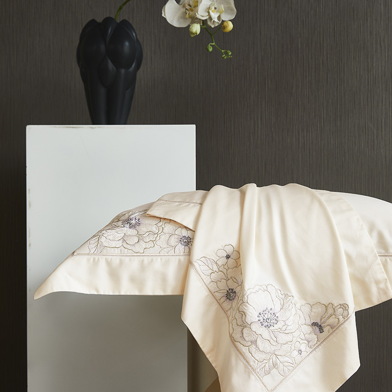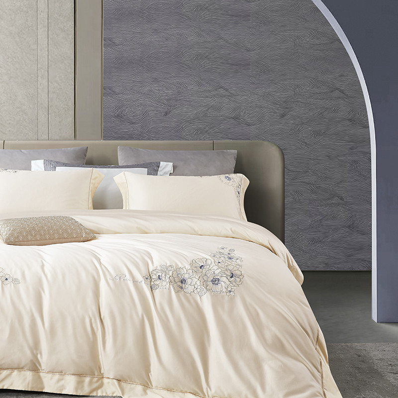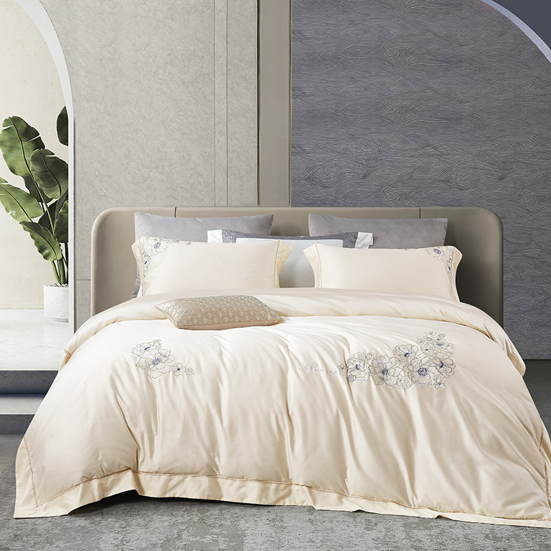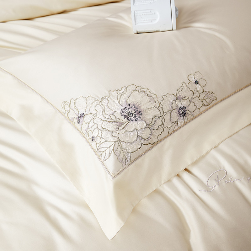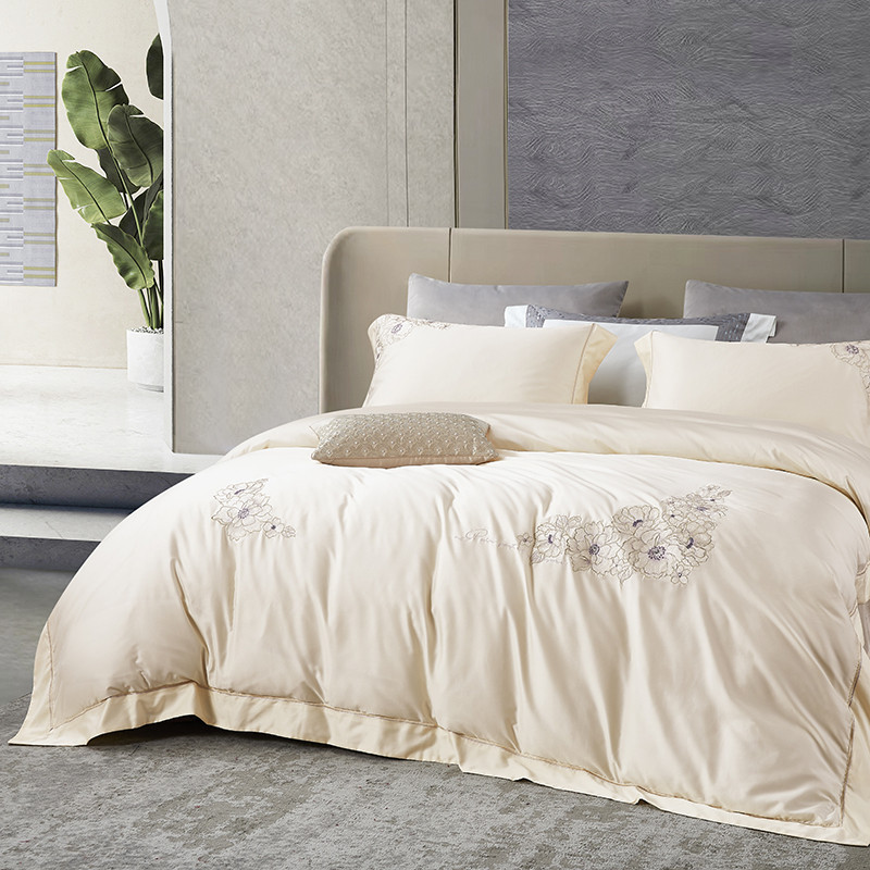 商品名称:爱情故事 2025新款居家140支轻奢贡缎长绒棉刺绣四件套 初夏(米白)