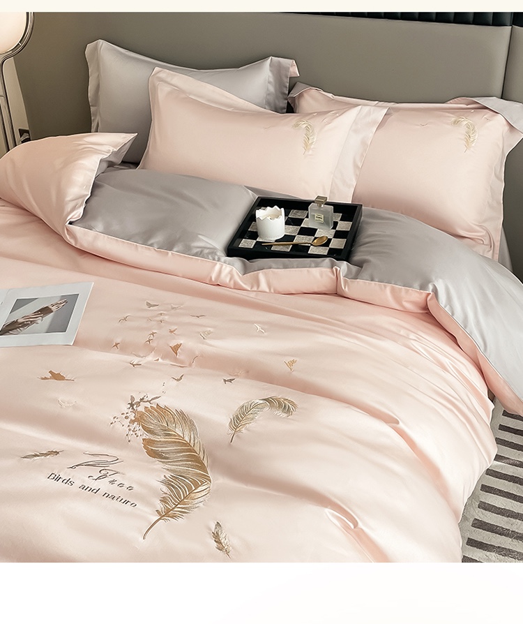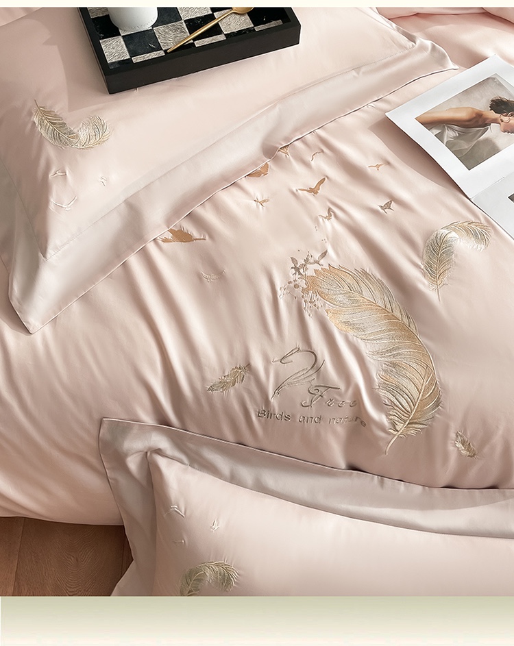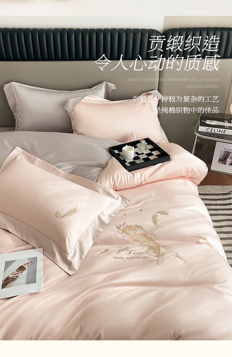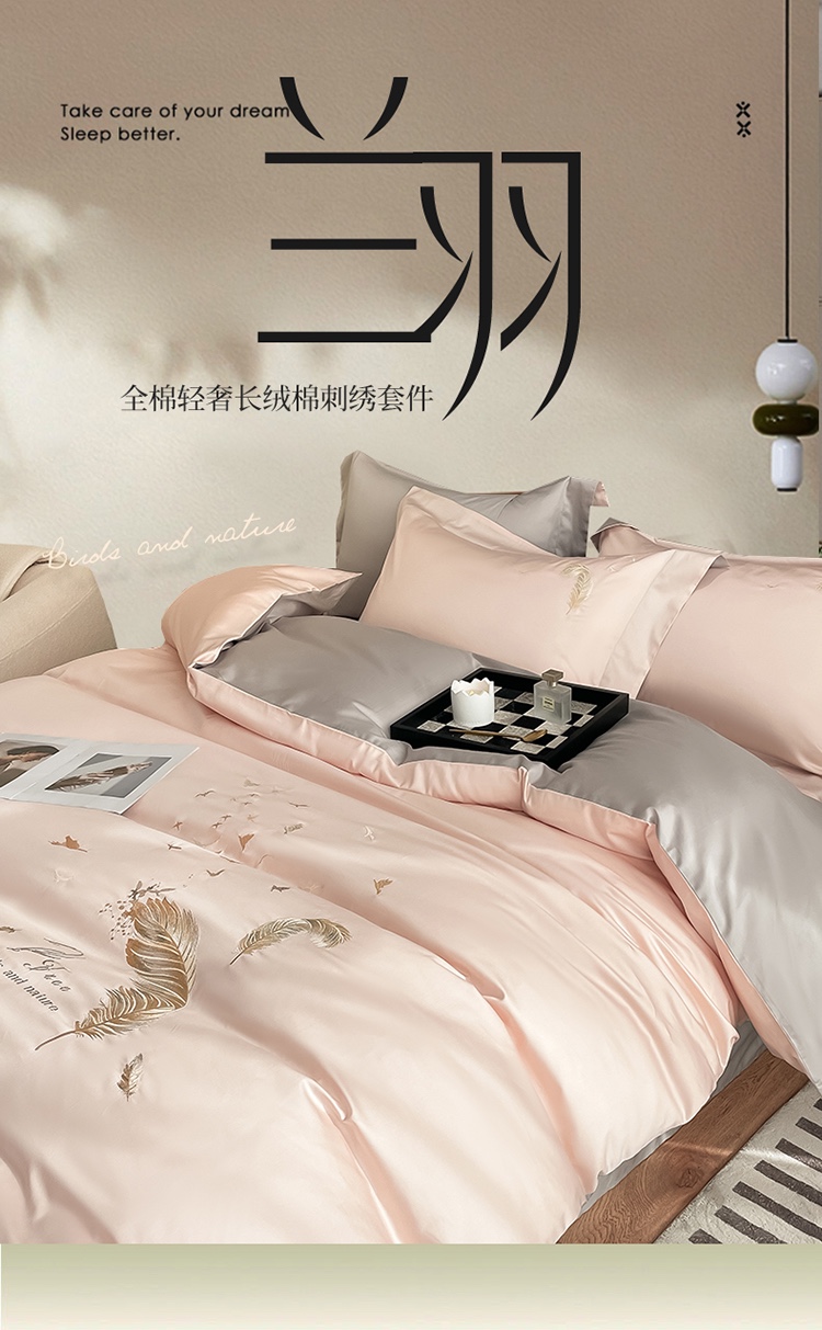 商品名称:蓝米卡夫 2024全棉高级感长绒棉刺绣兰羽系列-单被套 兰羽-粉芋山灰
