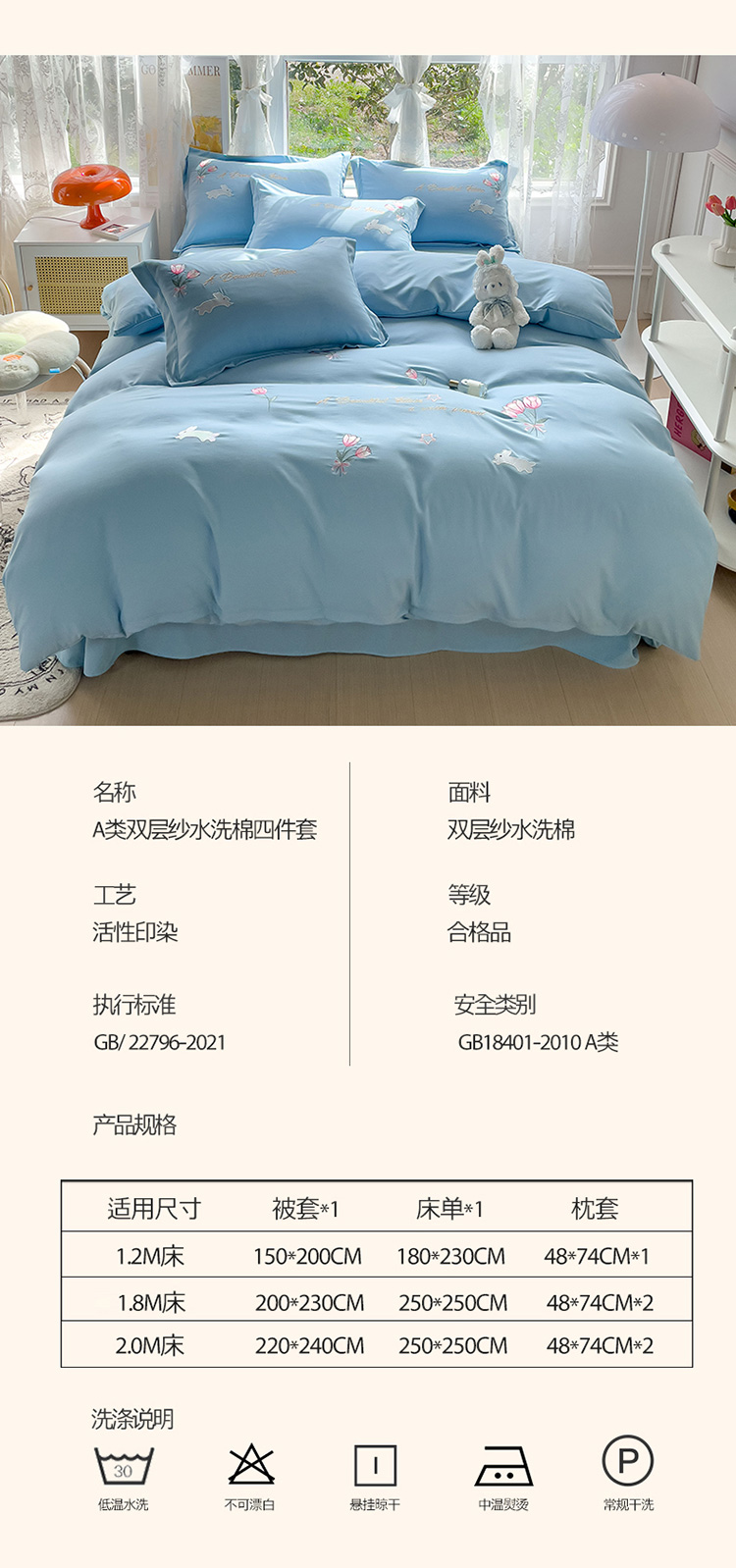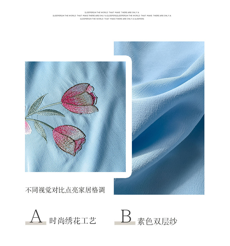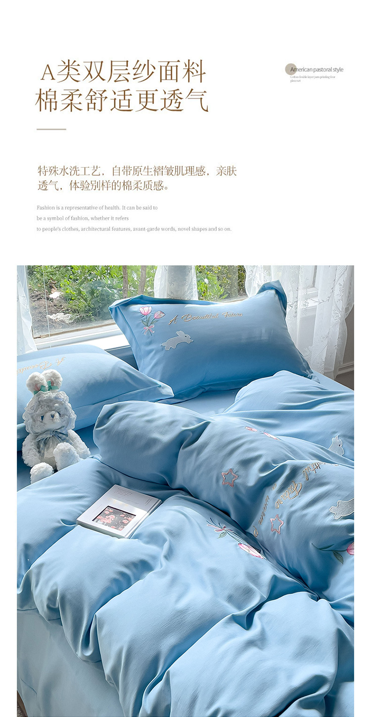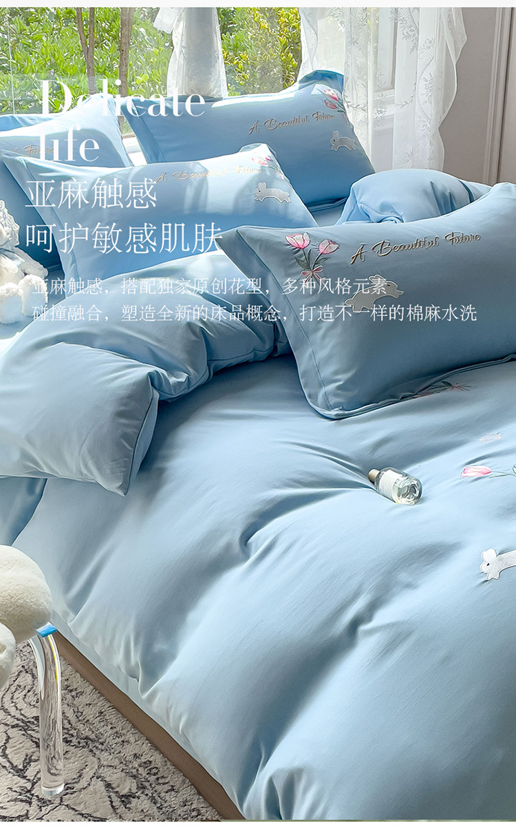商品名称:2023春夏新品A类双层纱水洗棉麻四件套-郁金香系列 郁金香-星光蓝
