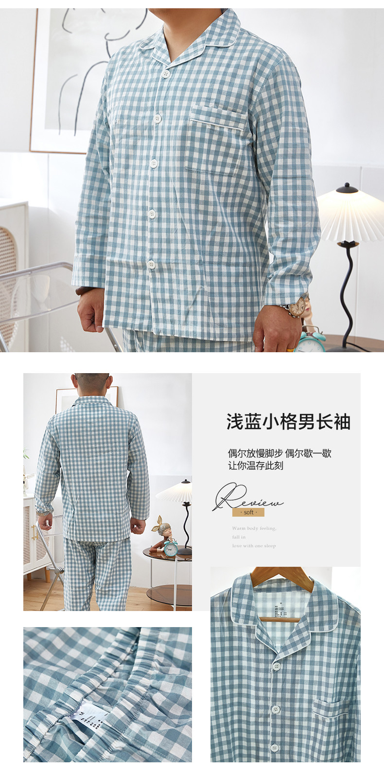 商品名称:玖弘 2023新款水洗棉长袖家居服 浅蓝小格男长袖