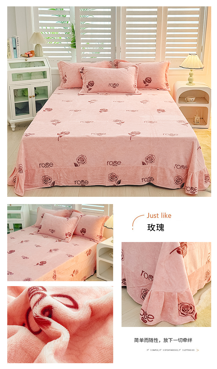 商品名称:新款230克印花牛奶绒床单定制定做尺寸 玫瑰