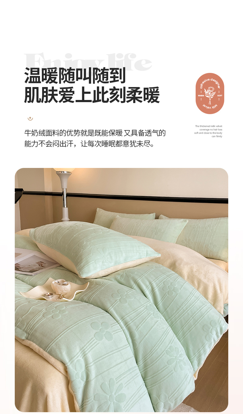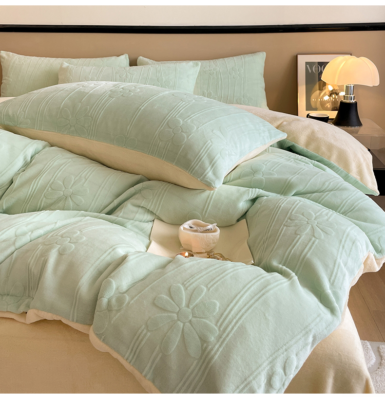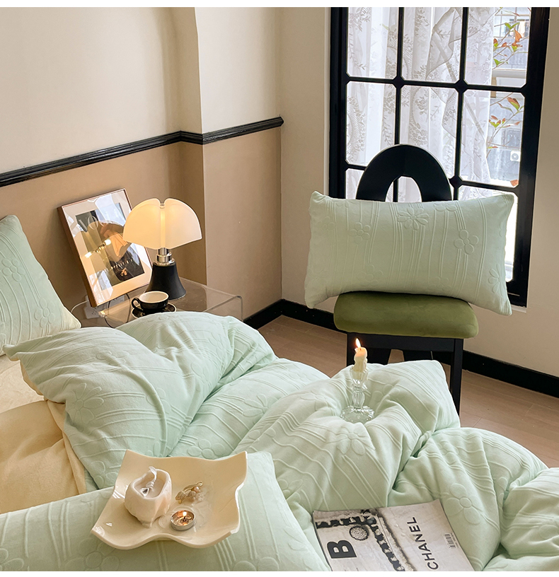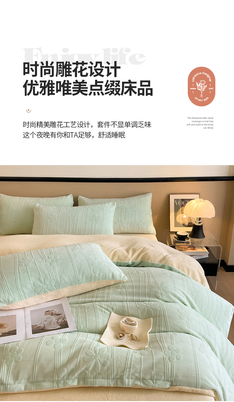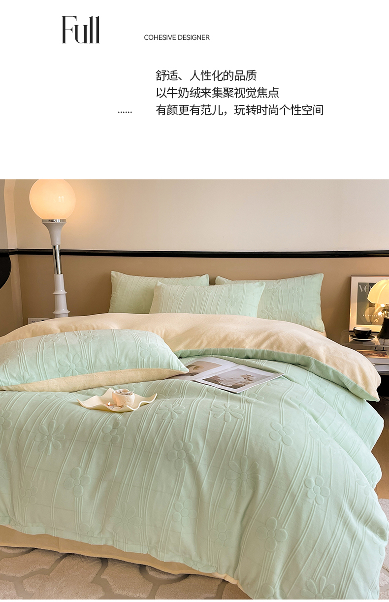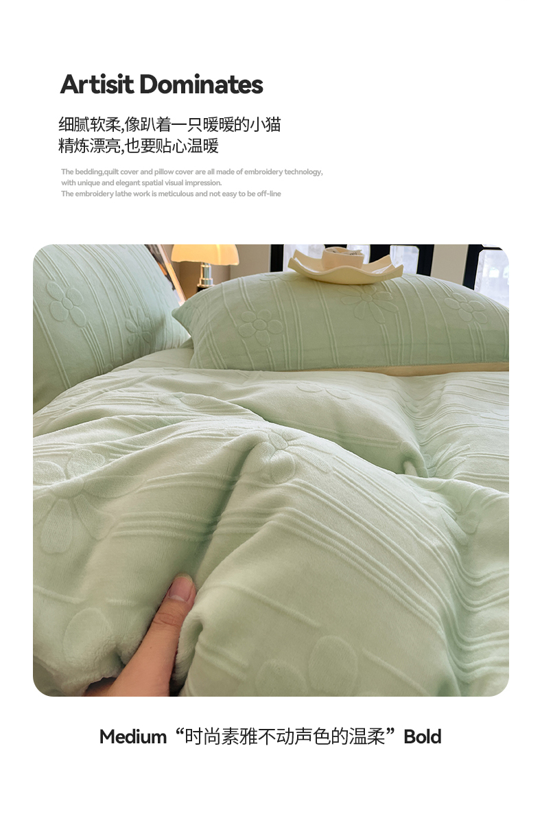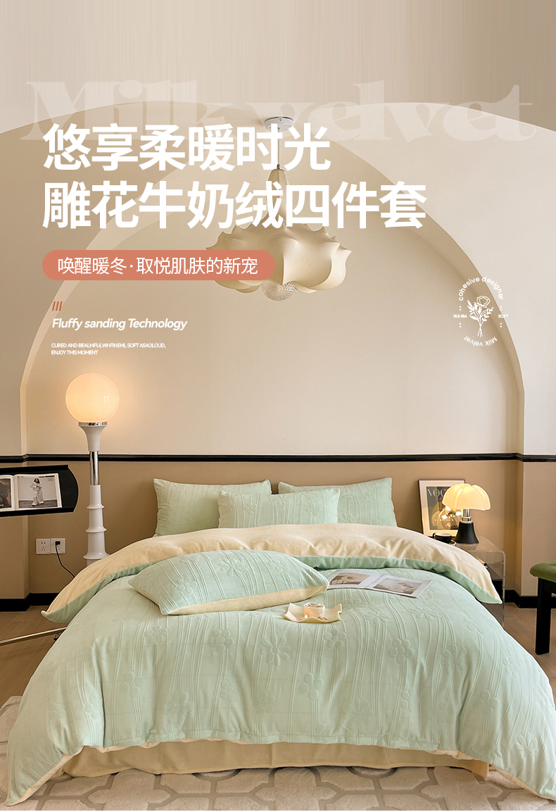 商品名称:澳梵 2023新款雕花牛奶绒四件套 冬日花信-嫩绿
