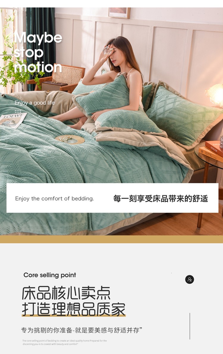 商品名称:欧冠 2023秋冬新款唯爱雕花A版260克牛奶绒四件套-相机款 唯爱-艾绿