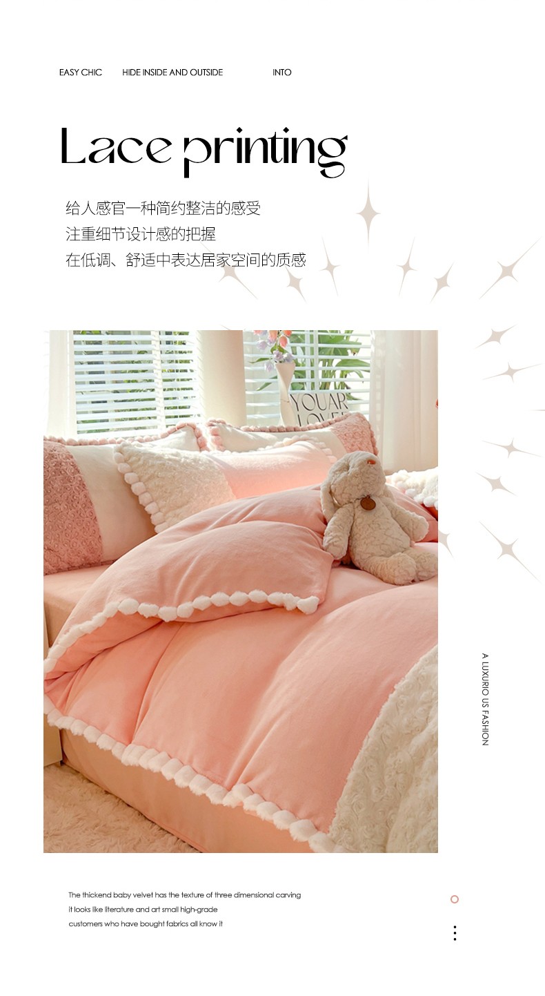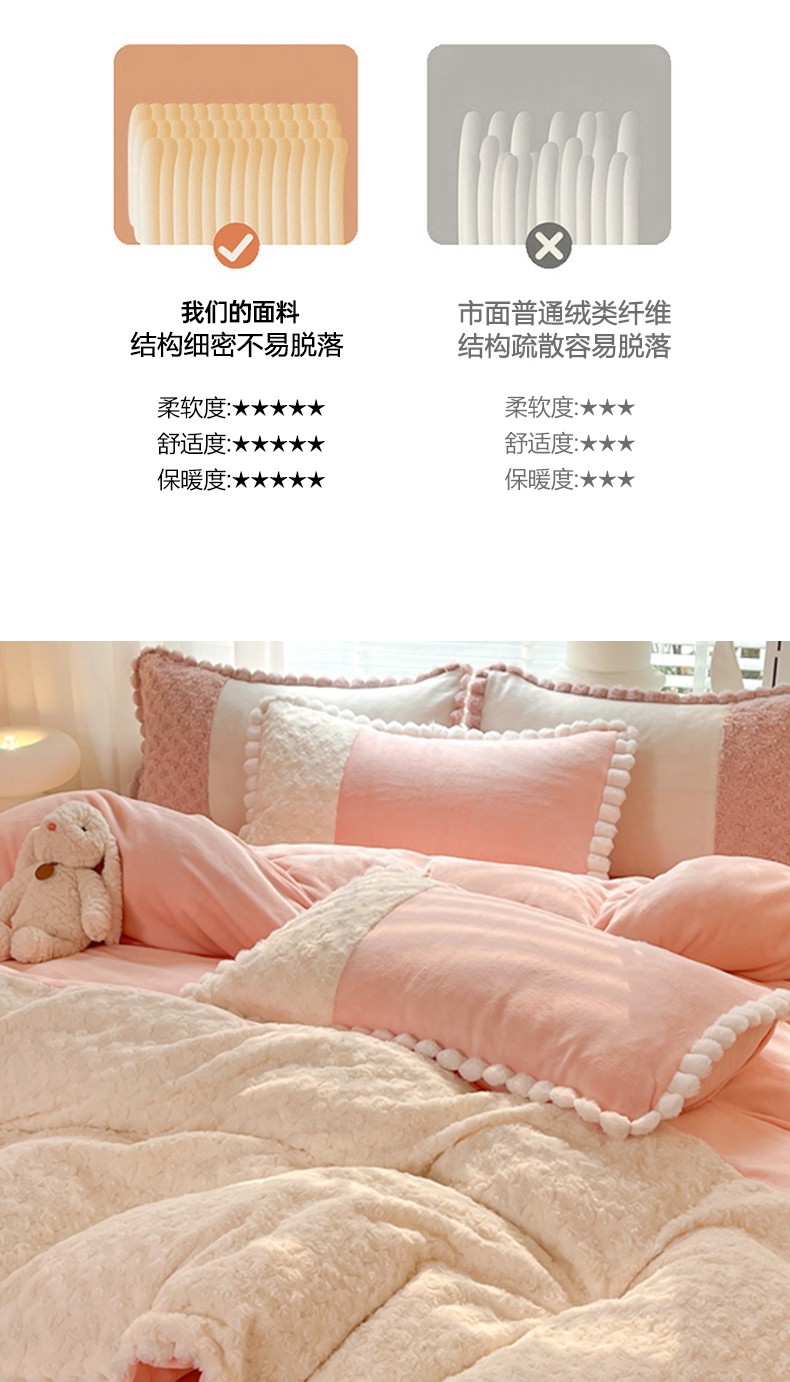 (总)艾米家居 2025秋冬新款浮雕牛奶绒花边四件套,白色,豆沙,粉色