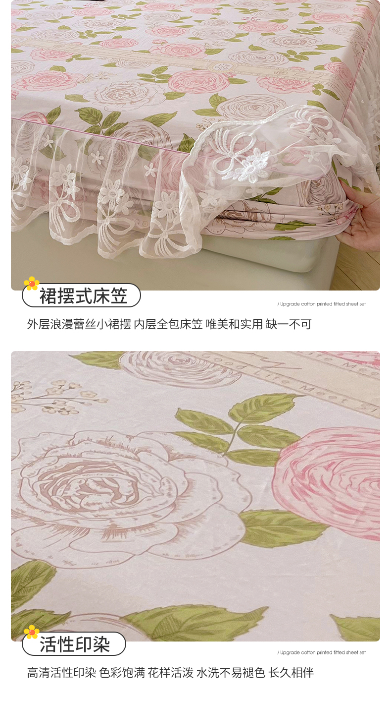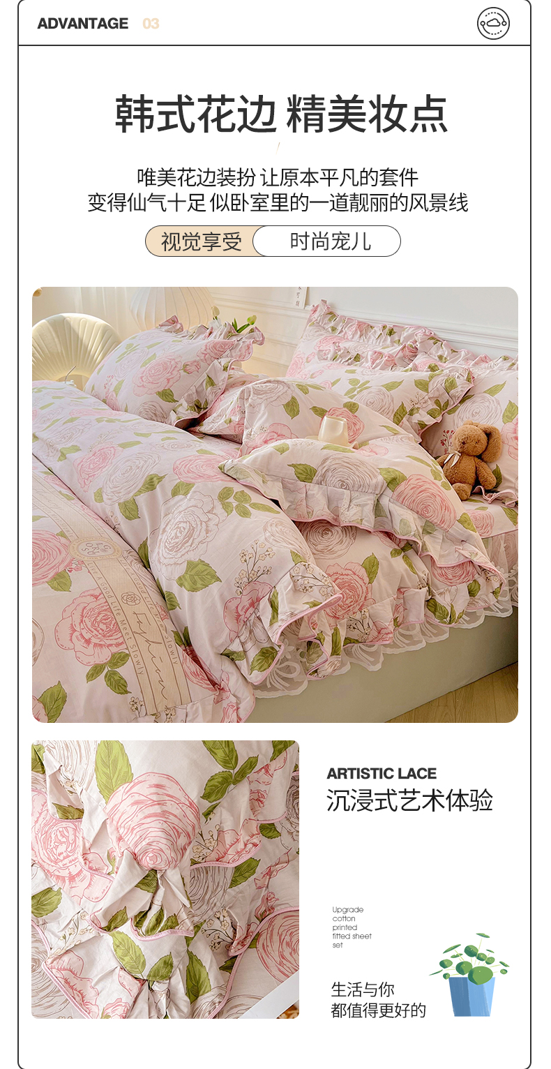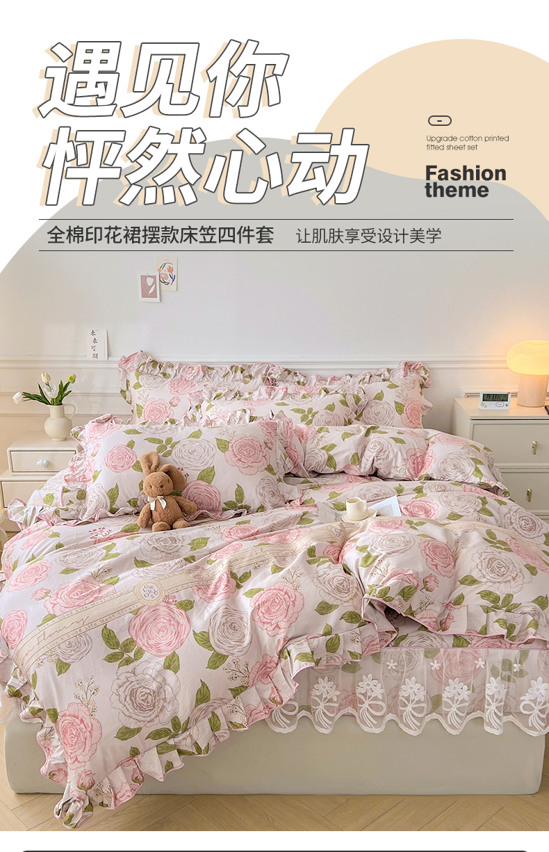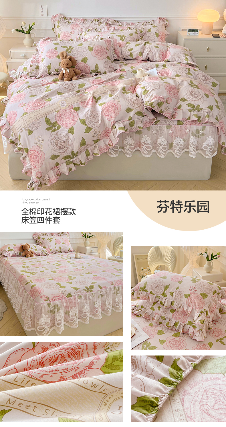 当前位置: 91家纺网 > 商品网购 > 床品套件 > 四件套 > 全棉普通四件套 > 宜凡家纺 2023款全棉花边裙摆款床笠四件套 芬特乐园