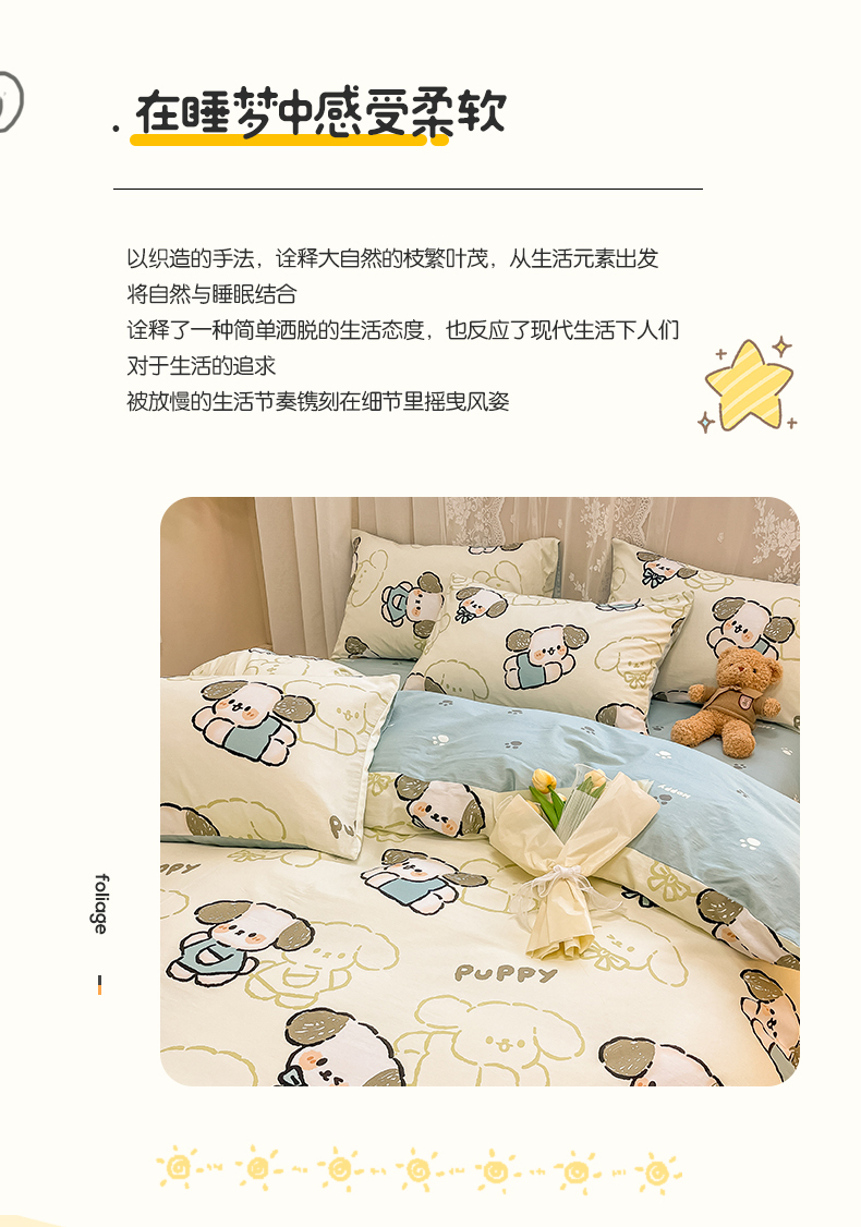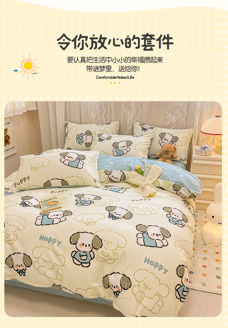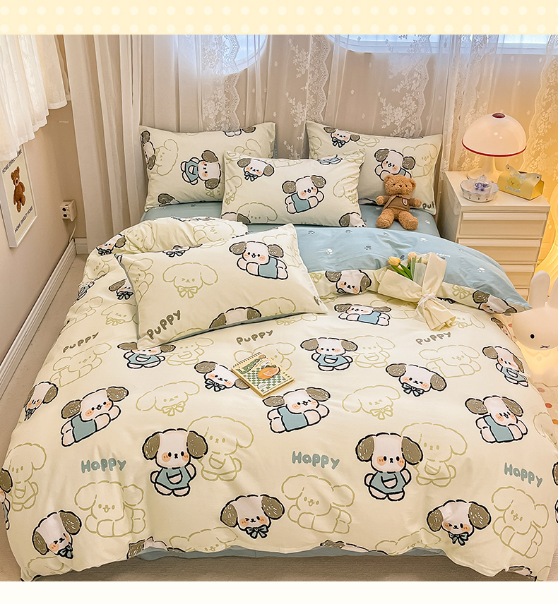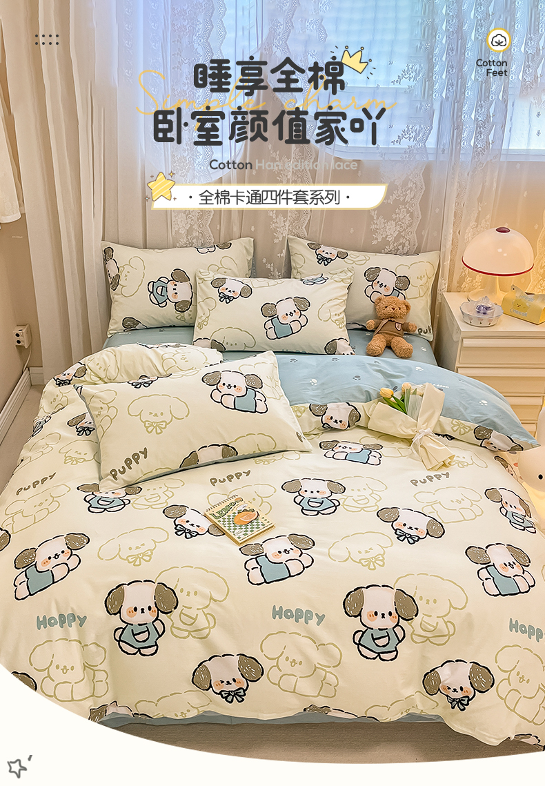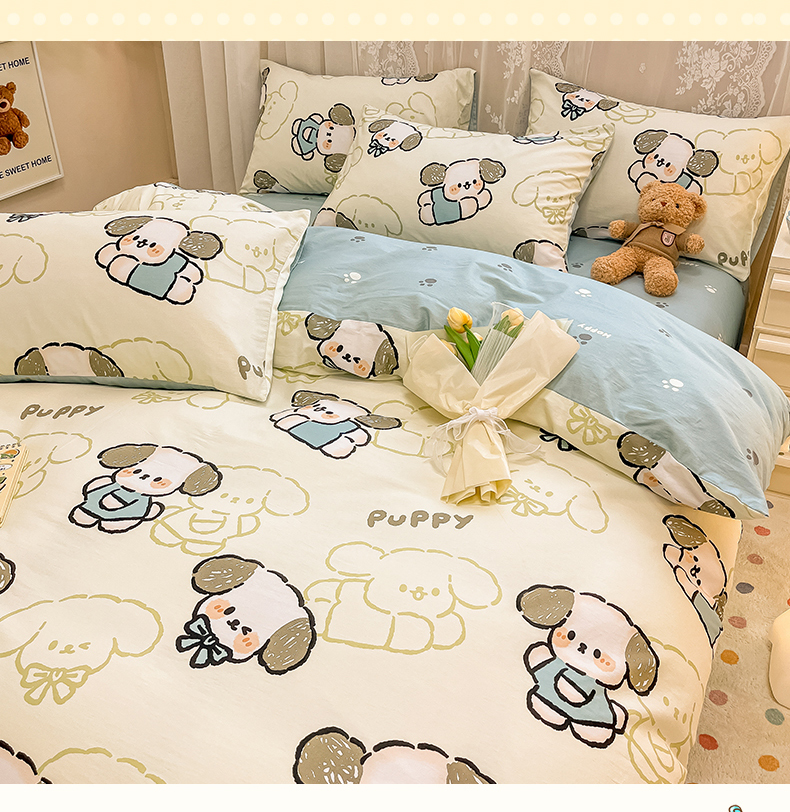 当前位置: 91家纺网 > 商品网购 > 床品套件 > 四件套 > 全棉普通四件套 > 小懒猪 2024春夏新款全棉卡通印花四件套 班尼狗