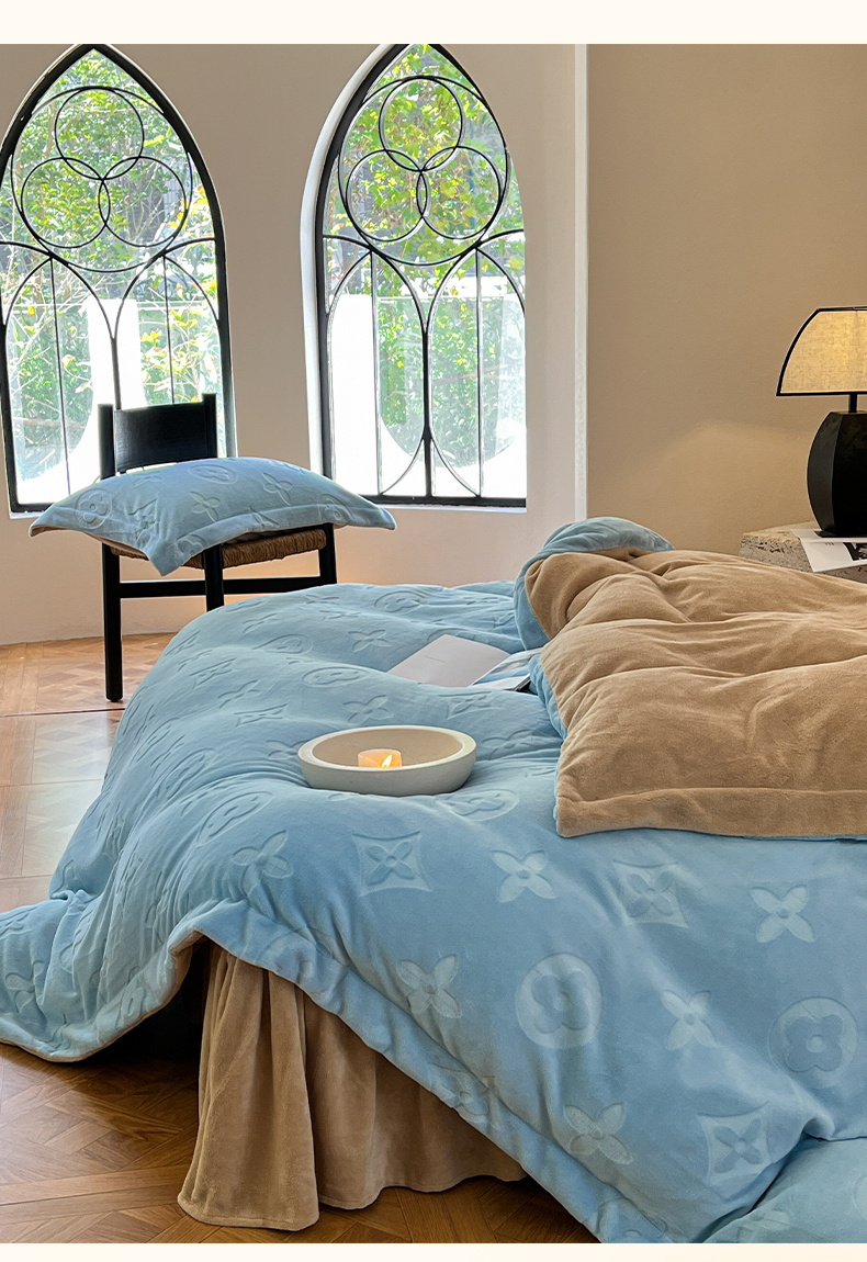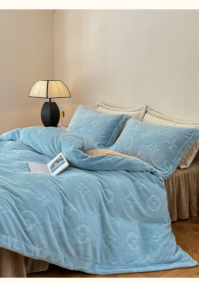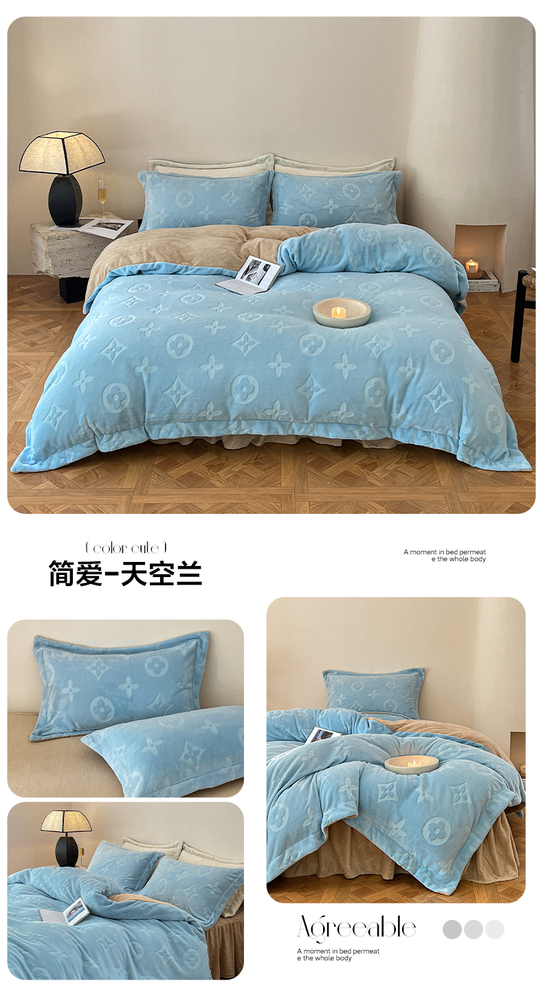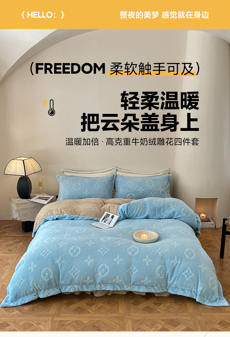 当前位置: 91家纺网 > 商品网购 > 床品套件 > 四件套 > 牛奶绒四件套 > 金麦家纺 2023新款230g高克重牛奶绒雕花四件套 简爱-天空兰