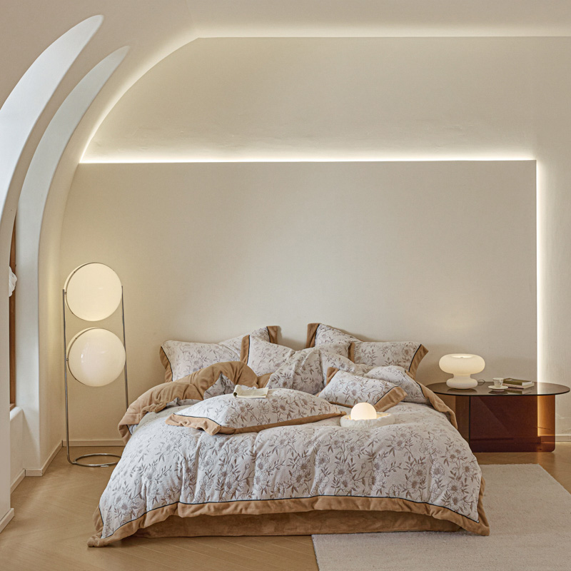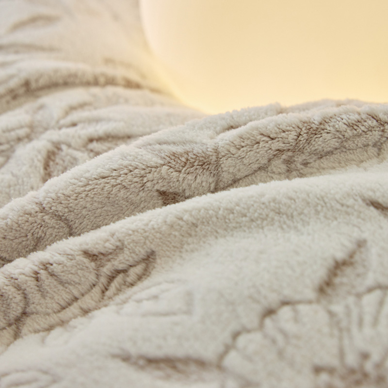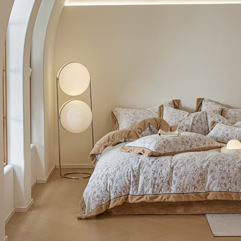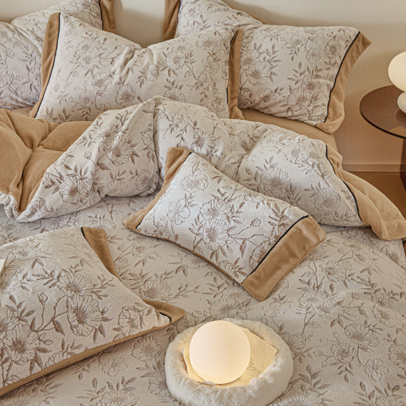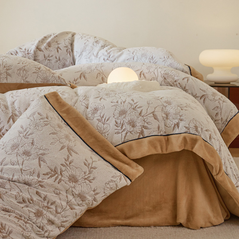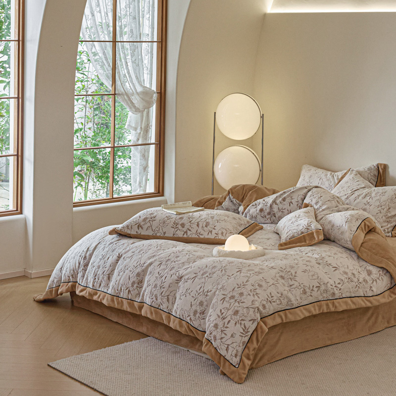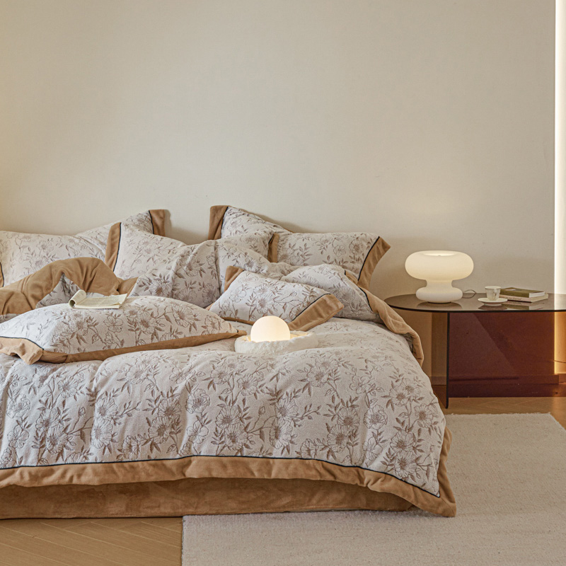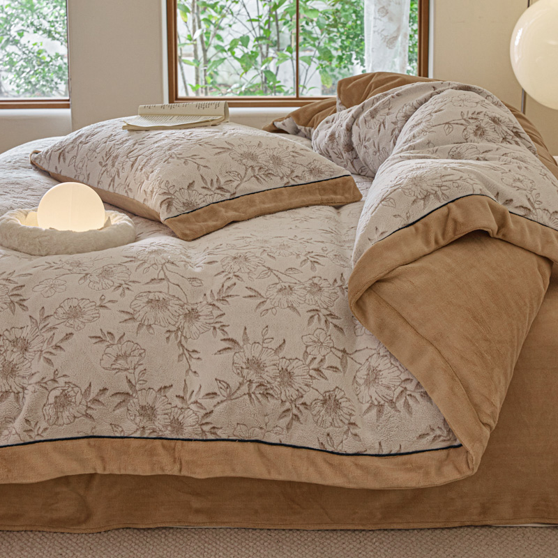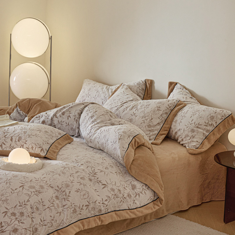 漫调家纺 2023新款230克全消光着色印花立体浮雕牛奶绒四件套 场景二 暖秋咖