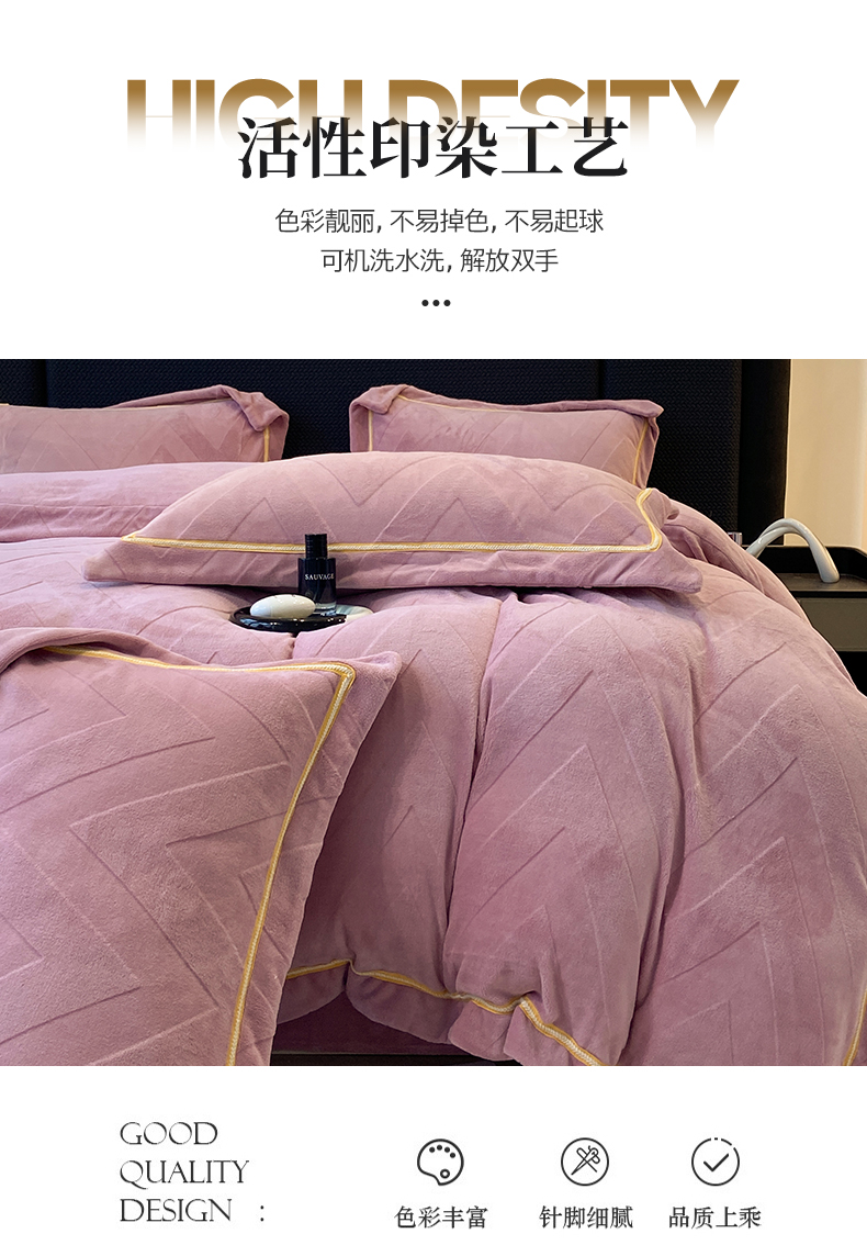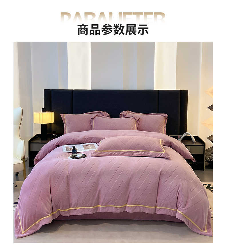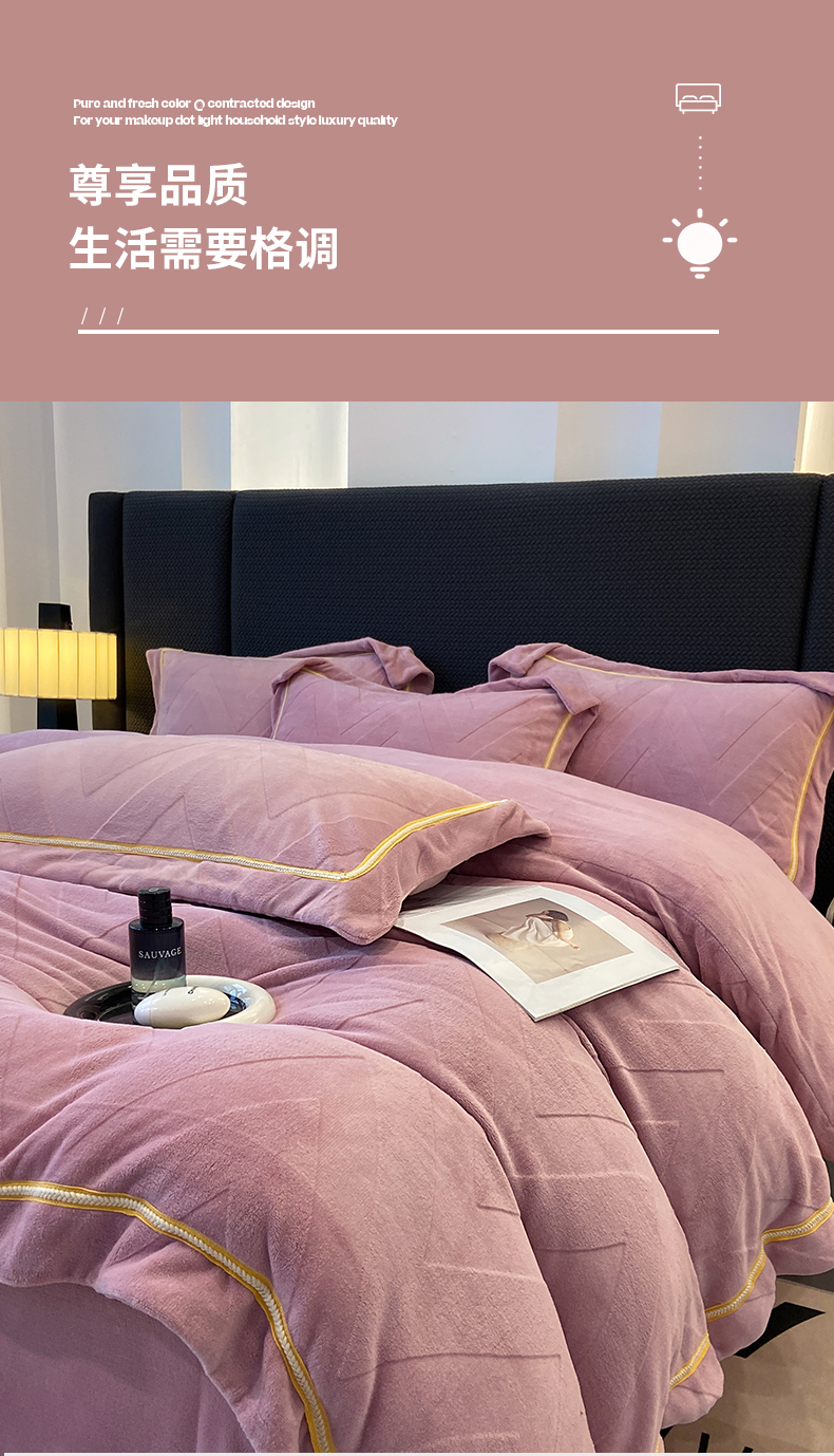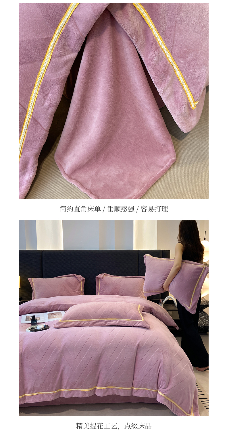 商品名称:家居1号 2024新款冬季高端剪花230克全消光工艺牛奶绒宝宝绒珊瑚绒婴儿绒刺绣轻奢四件套床单被套-简尚 简尚-藕紫