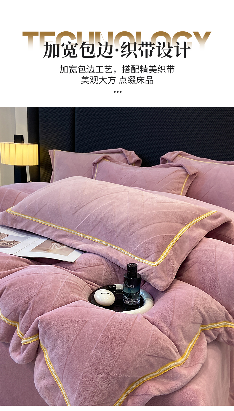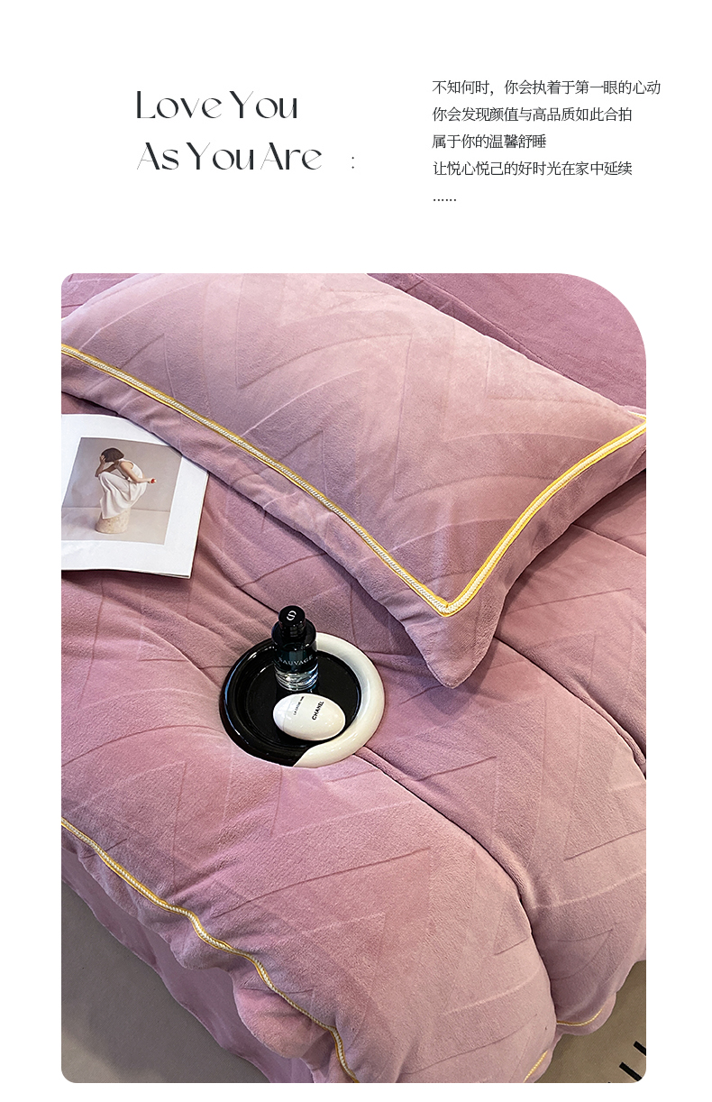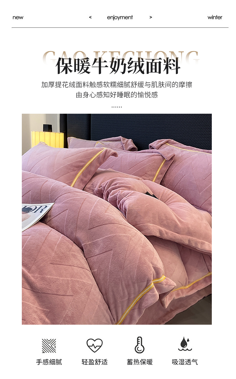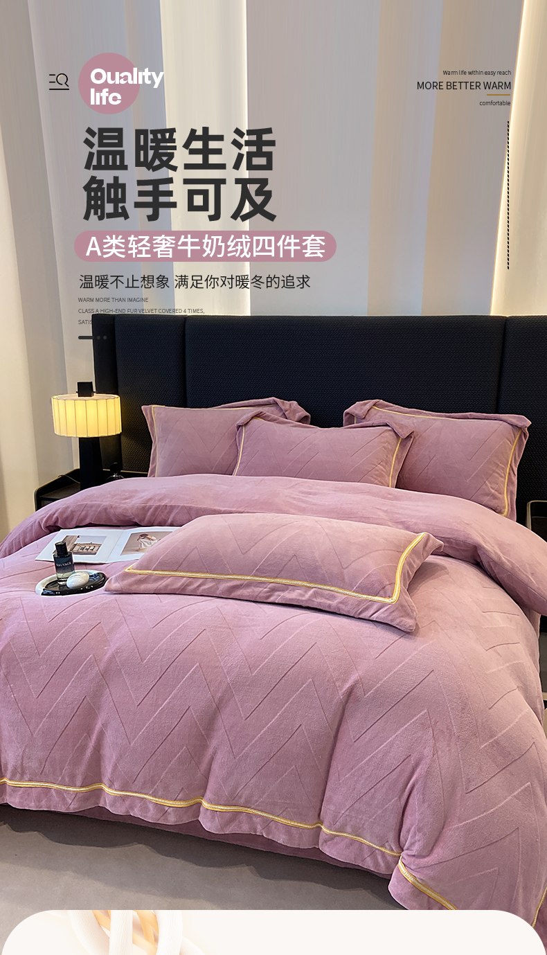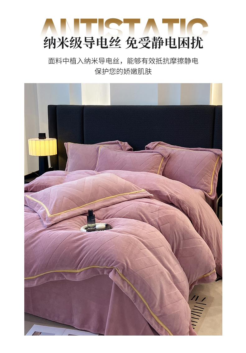 商品名称:家居1号 2024新款冬季高端剪花230克全消光工艺牛奶绒宝宝绒珊瑚绒婴儿绒刺绣轻奢四件套床单被套-简尚 简尚-藕紫