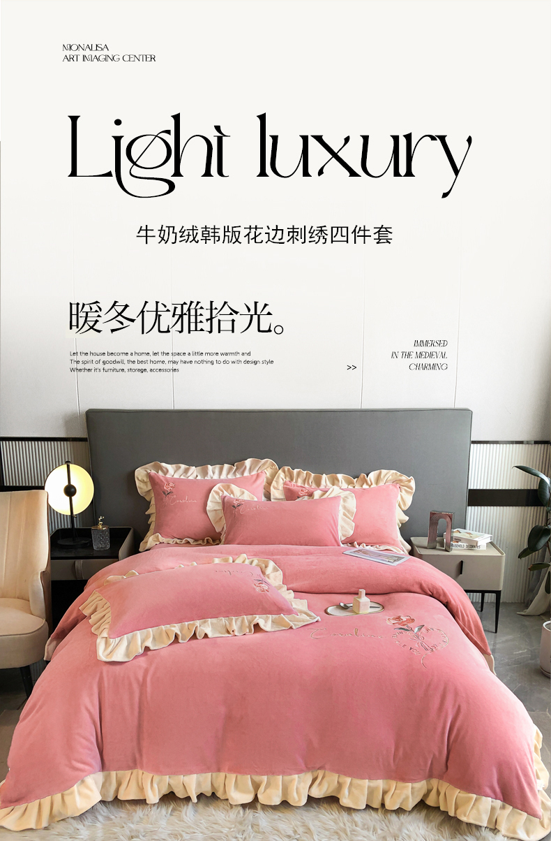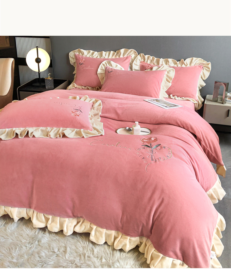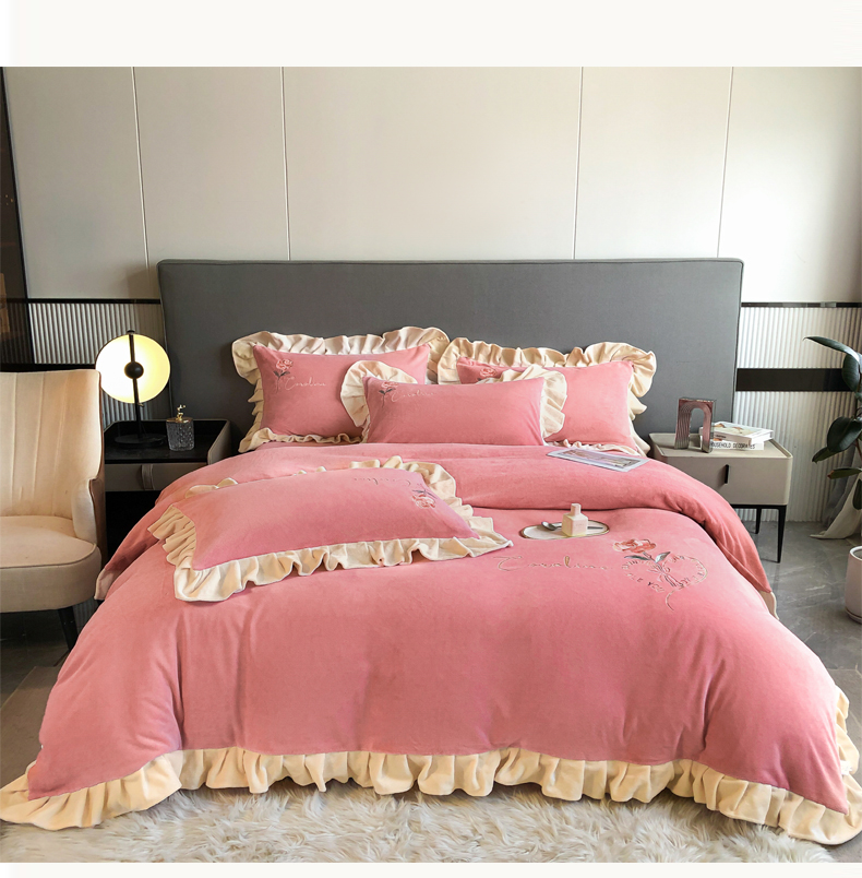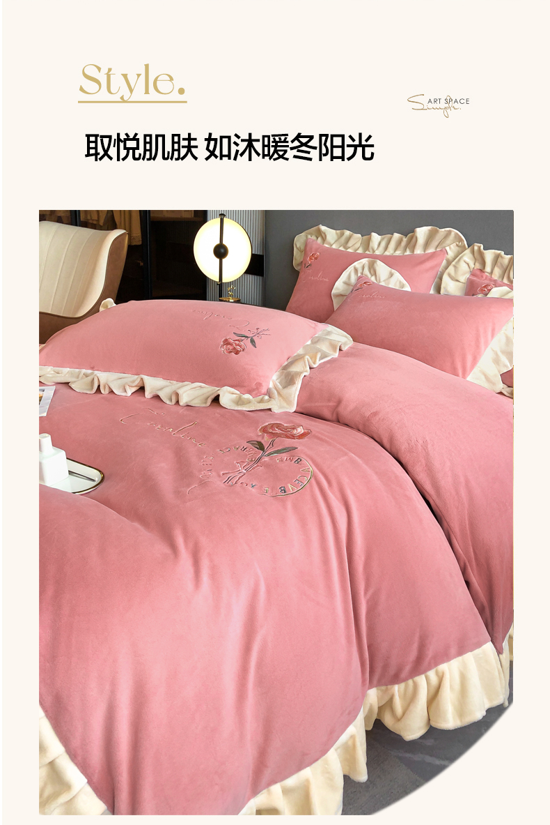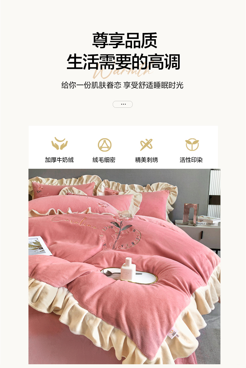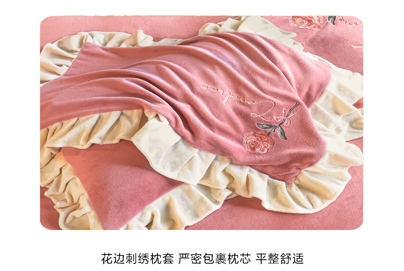 当前位置: 91家纺网 > 商品网购 > 床品套件 > 四件套 > 牛奶绒四件套 > 7V 2024新款韩版花边牛奶绒刺绣四件套8斤多加厚牛奶绒面料法兰绒宝宝绒 偏爱-浅粉