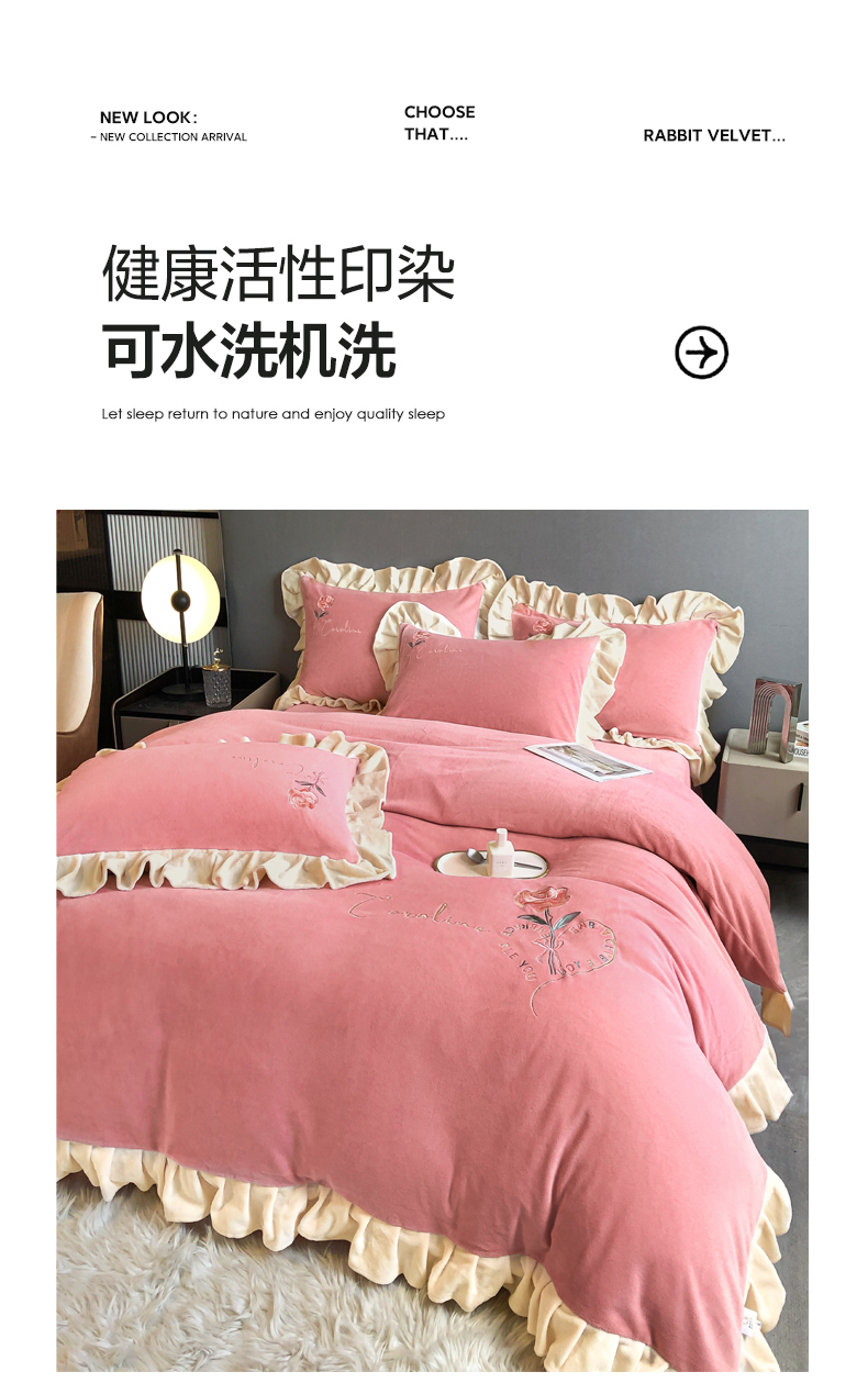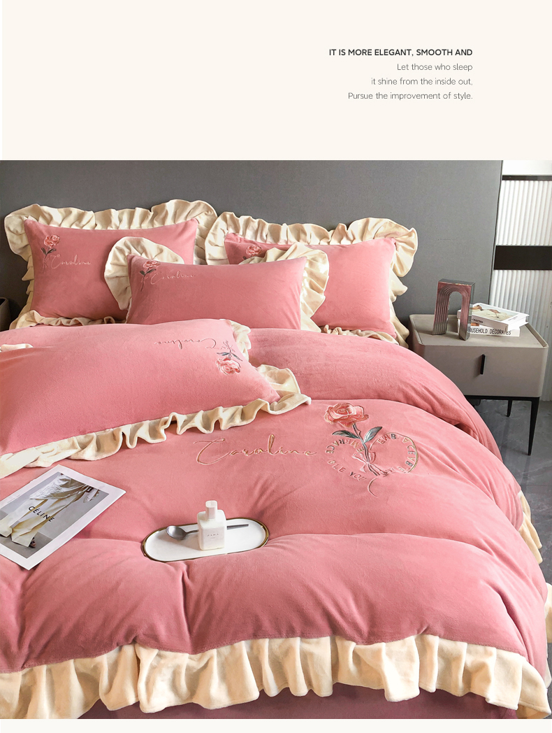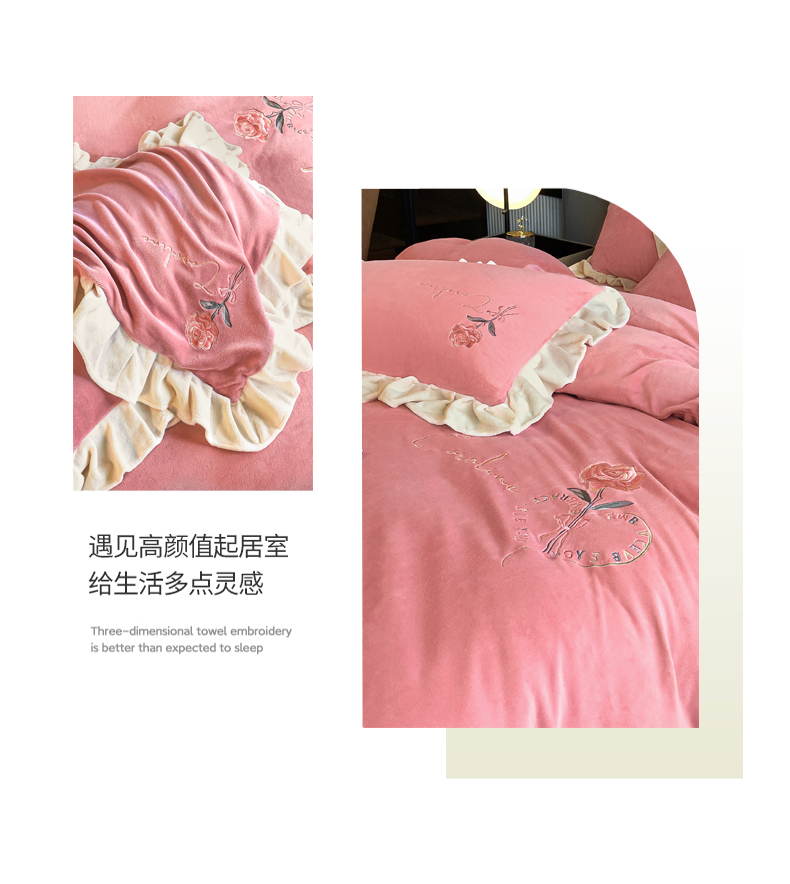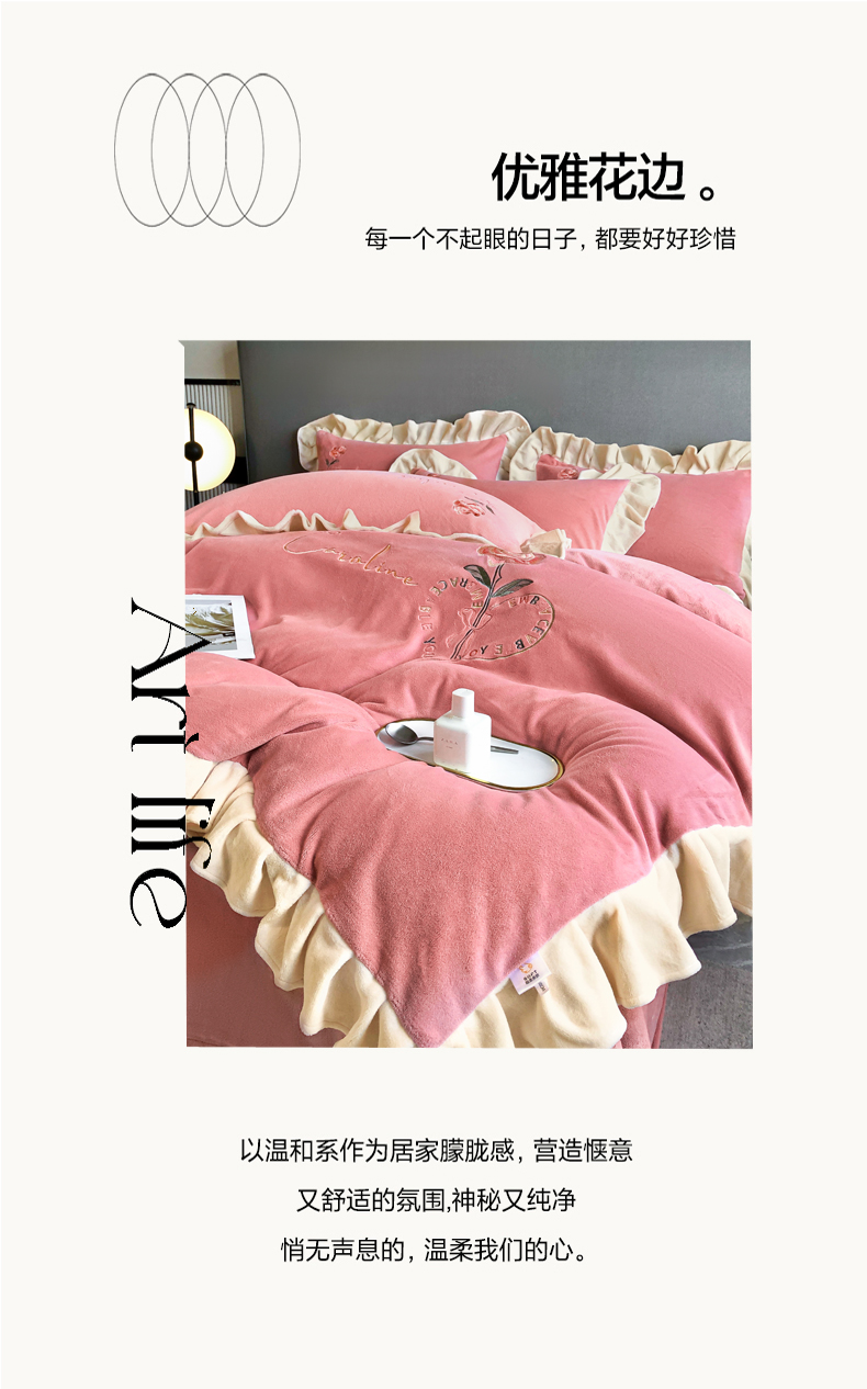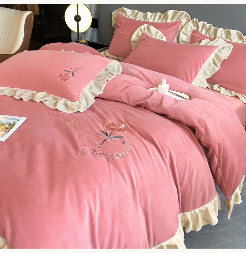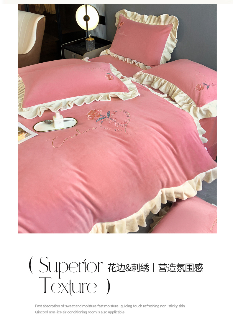 当前位置: 91家纺网 > 商品网购 > 床品套件 > 四件套 > 牛奶绒四件套 > 7V 2024新款韩版花边牛奶绒刺绣四件套8斤多加厚牛奶绒面料法兰绒宝宝绒 偏爱-浅粉