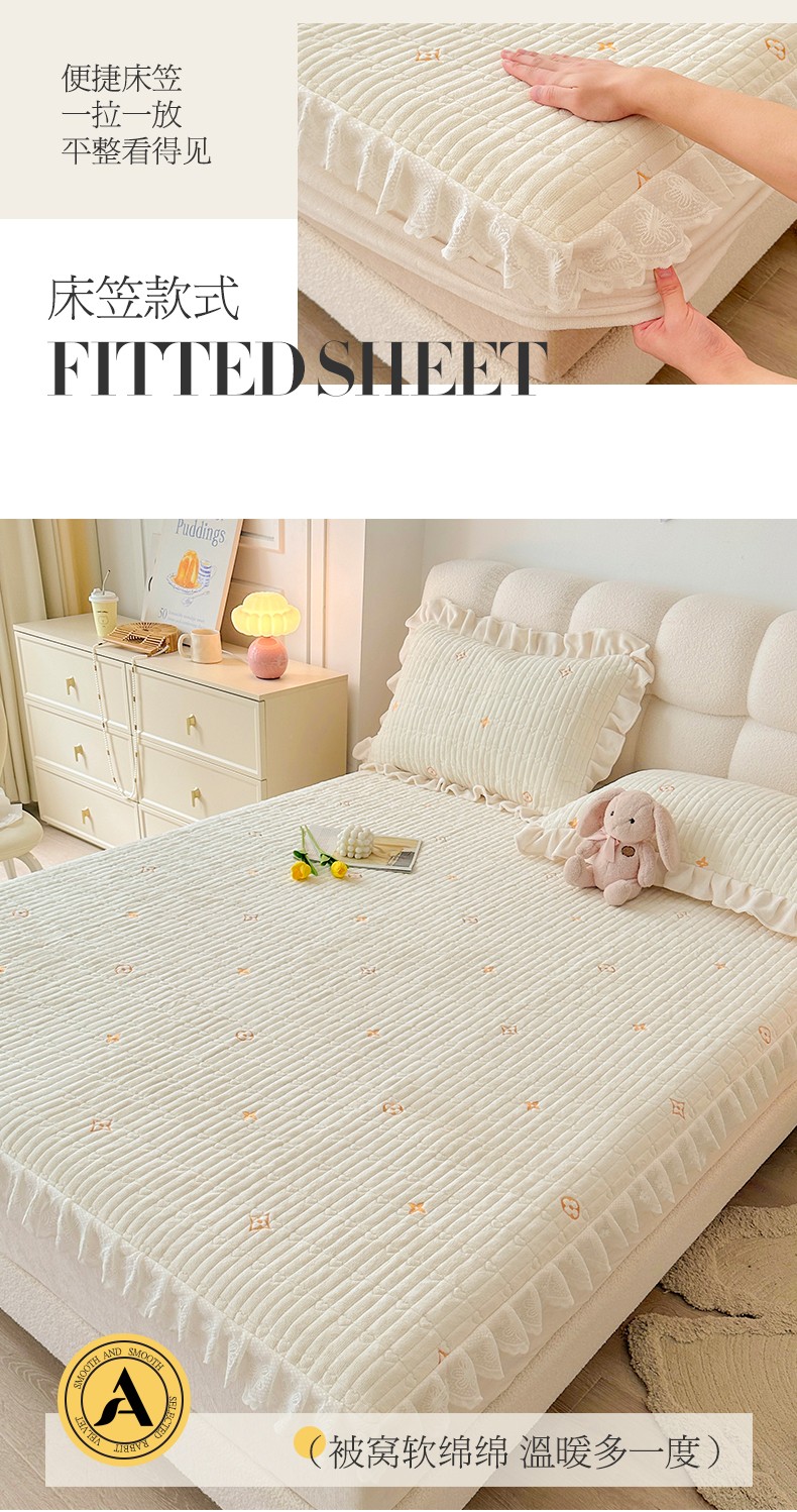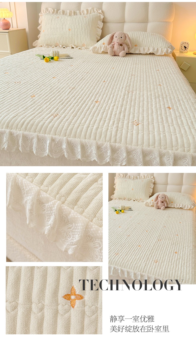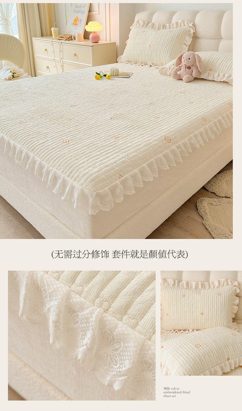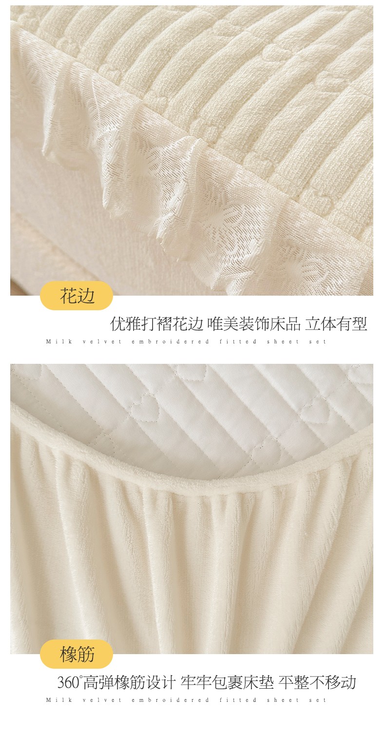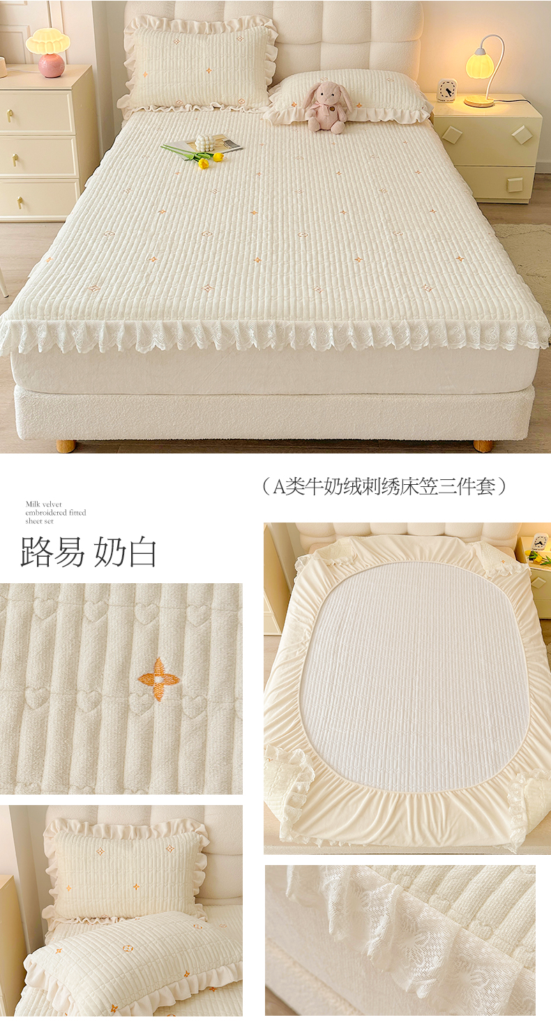 宜凡 2023新款牛奶绒夹棉绗缝绣花床笠三件套 路易-奶白