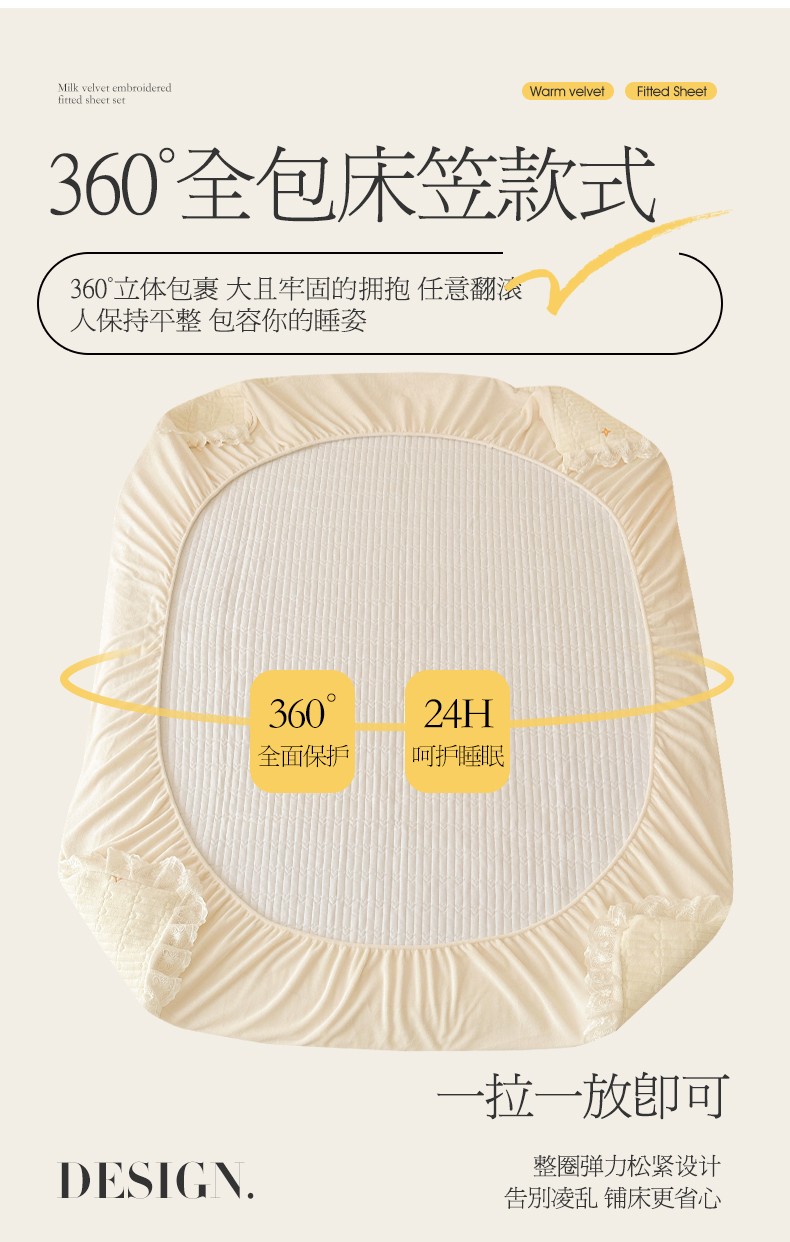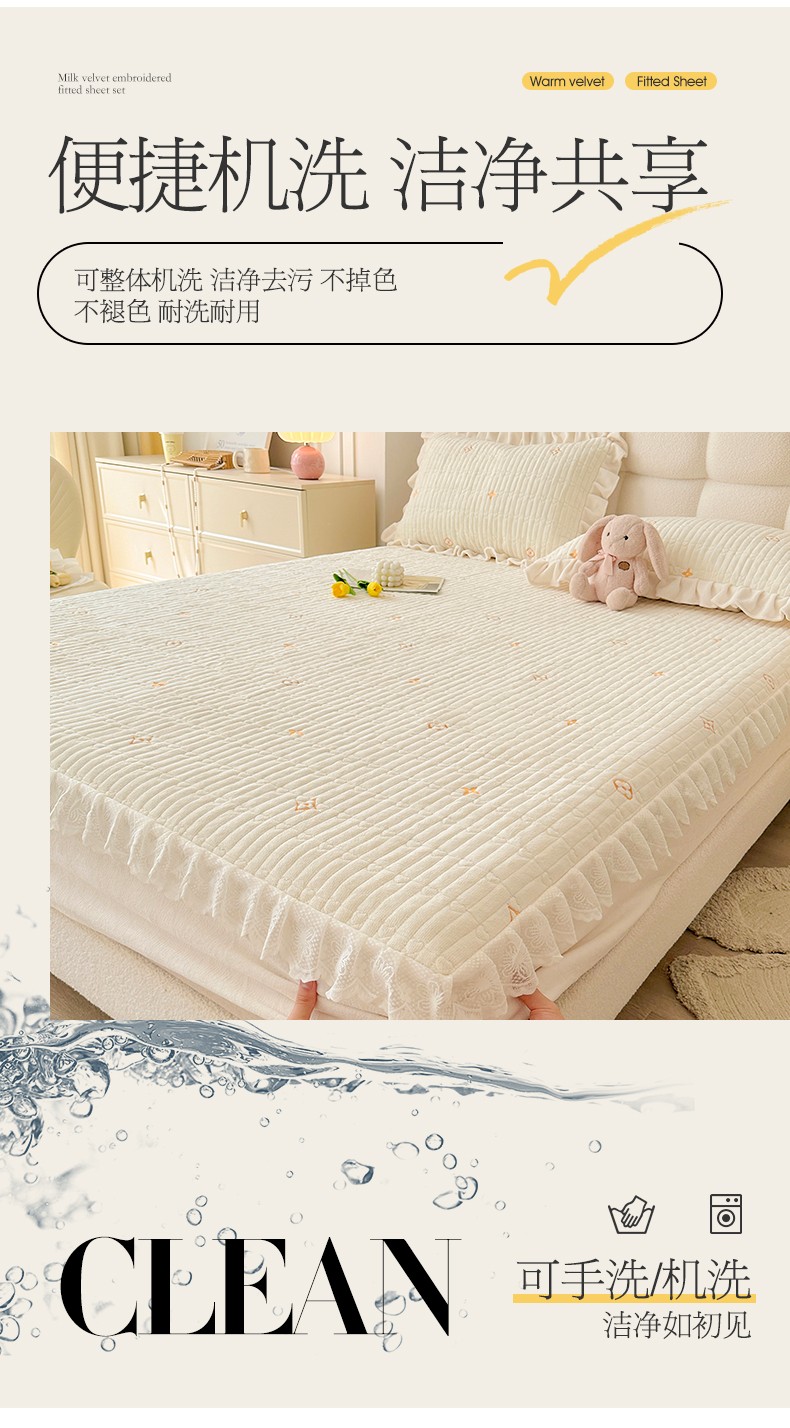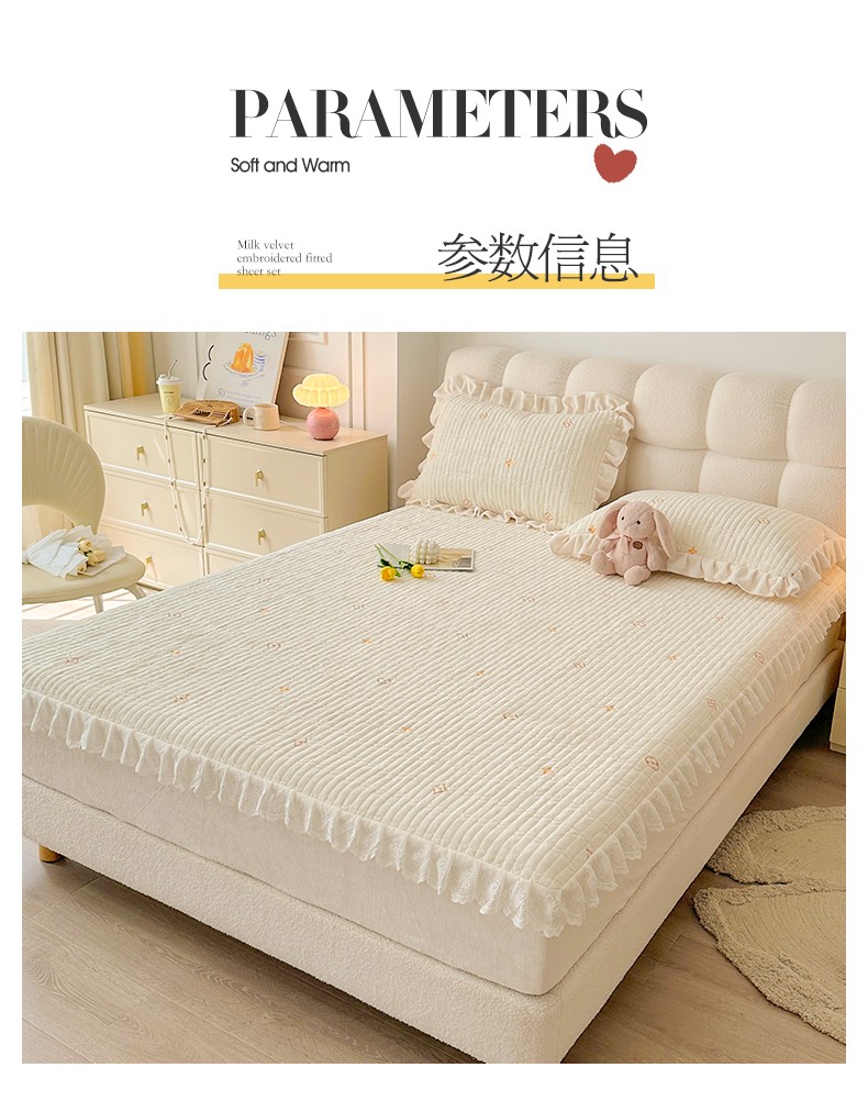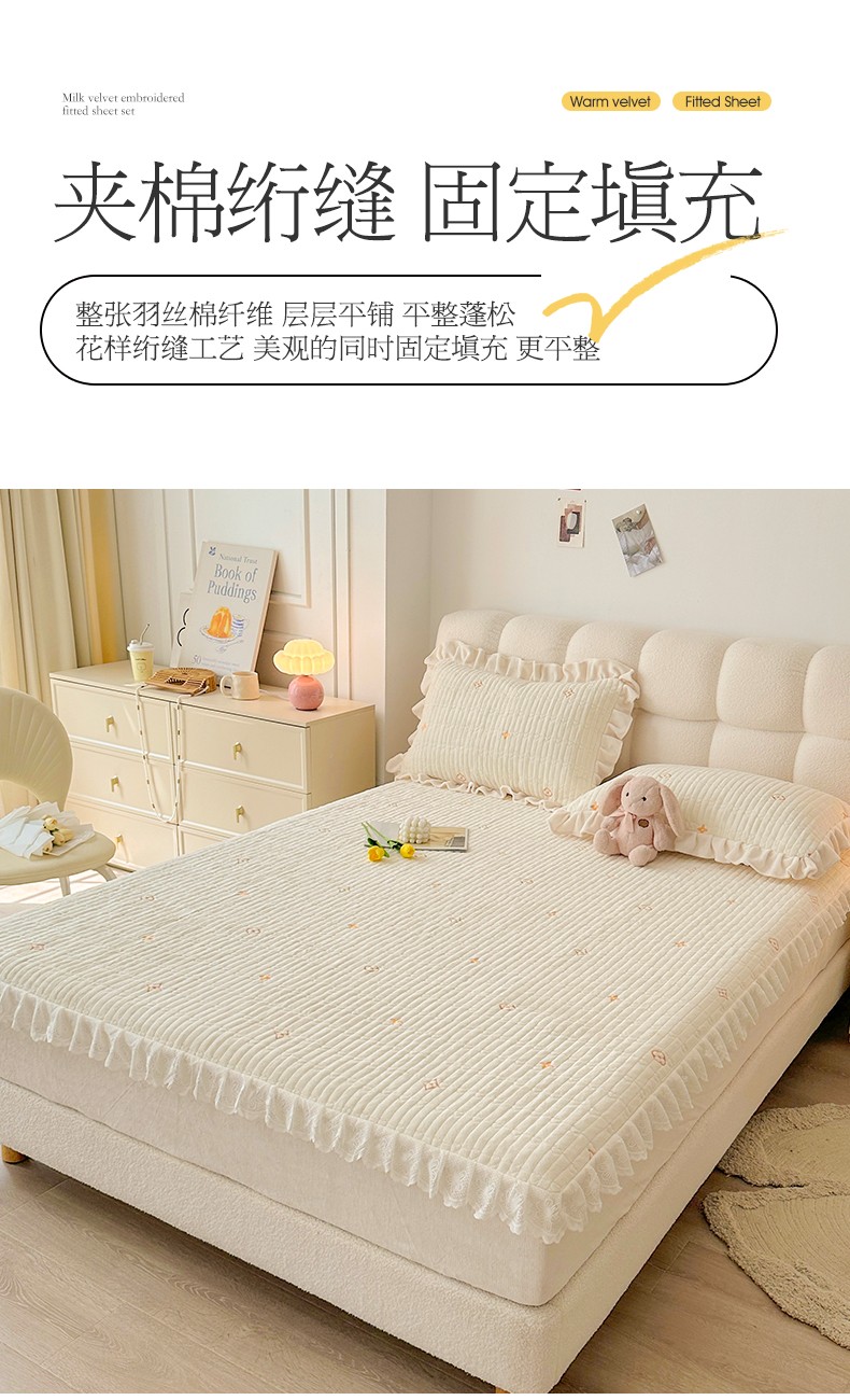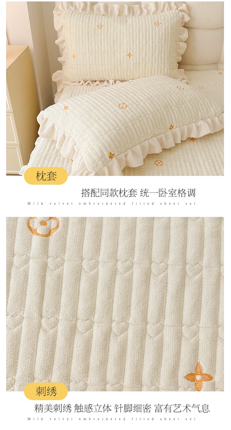 宜凡 2023新款牛奶绒夹棉绗缝绣花床笠三件套 路易-奶白