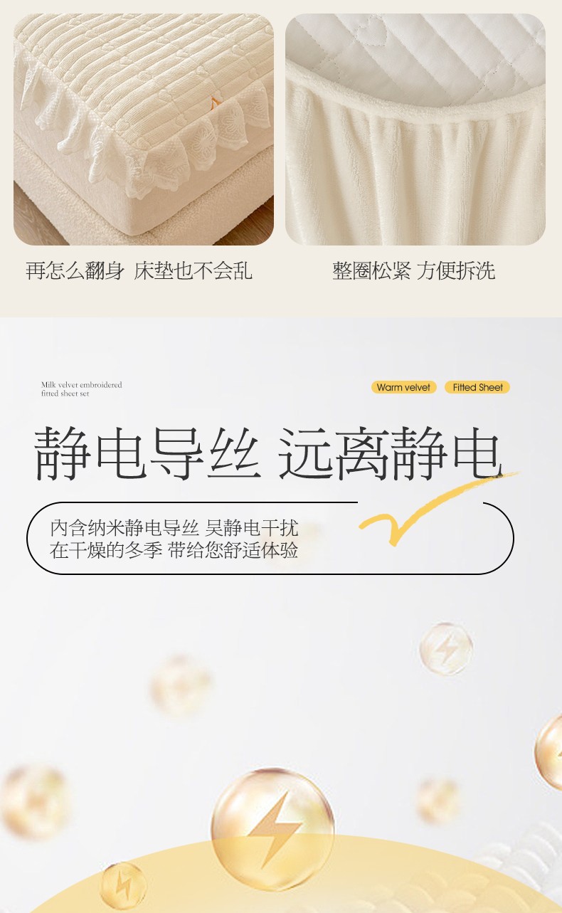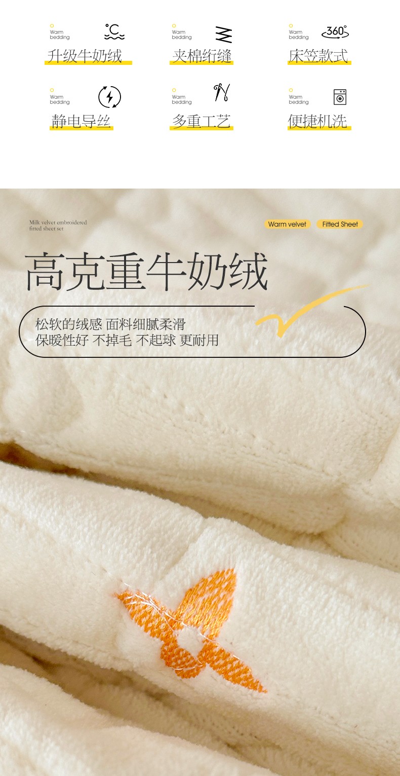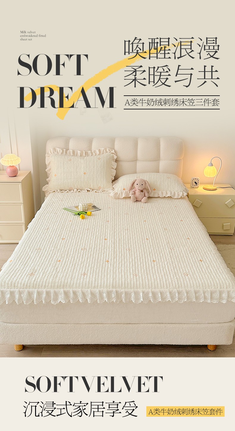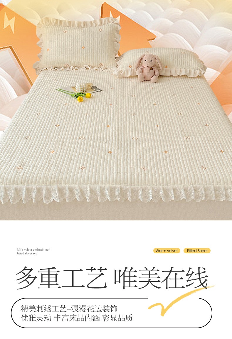 • 91家纺网 家纺一手货源 找家纺 宜凡 2023新款牛奶绒夹棉绗缝绣花床笠三件套 路易-奶白
