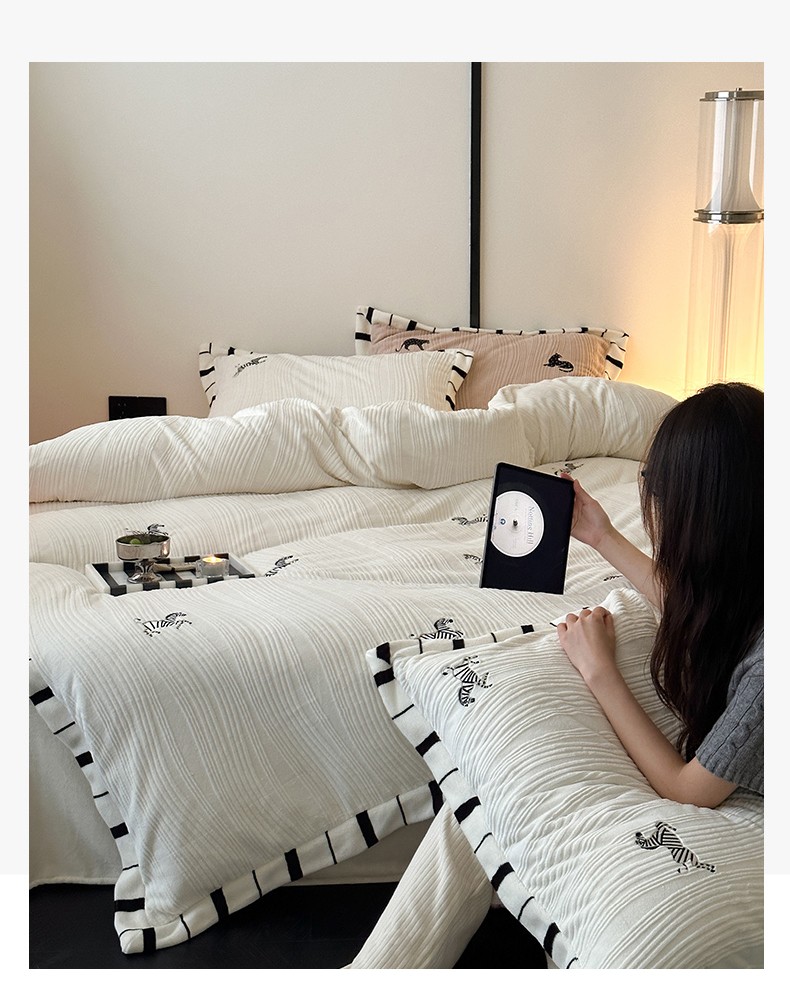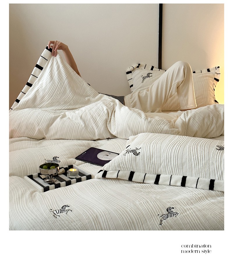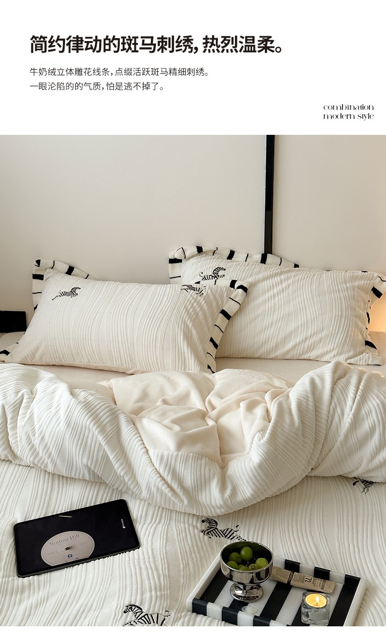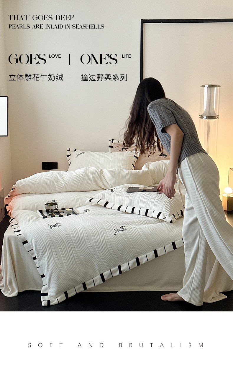 总安莱生活2023年新品专版撞色宽边刺绣牛奶绒230克四件套-野柔系列