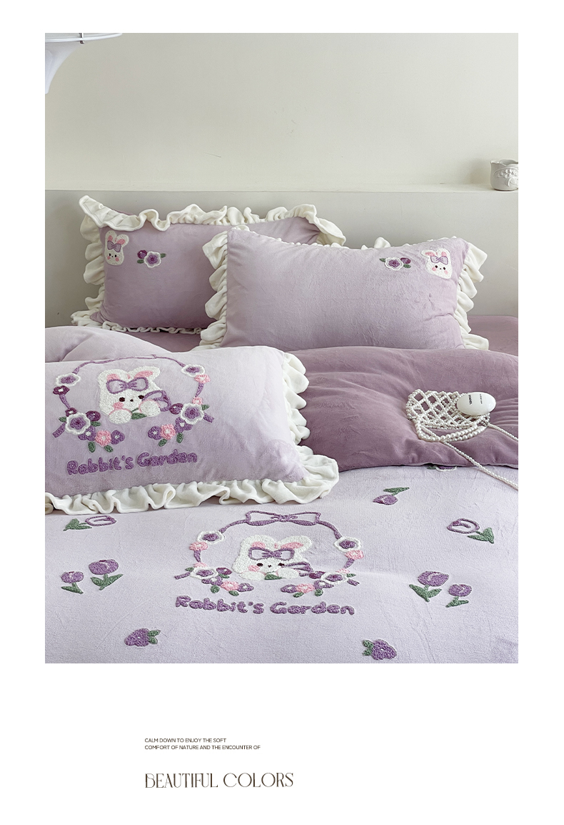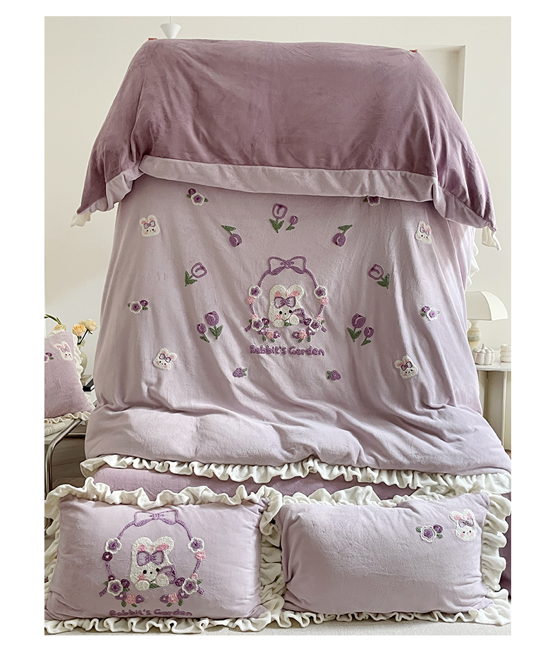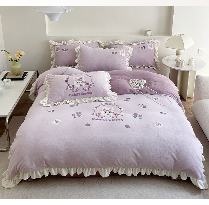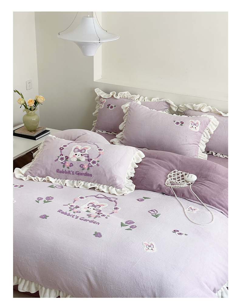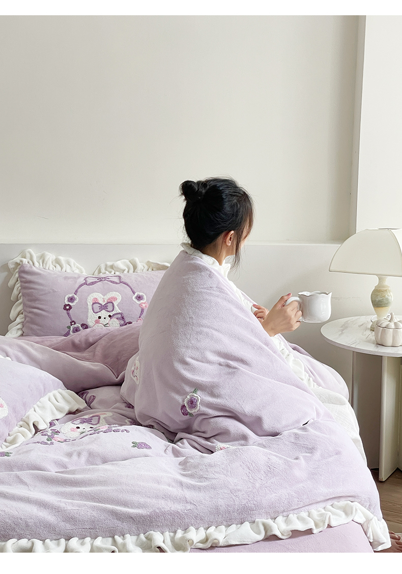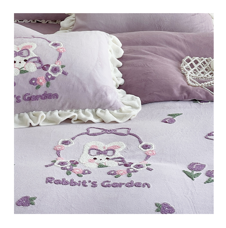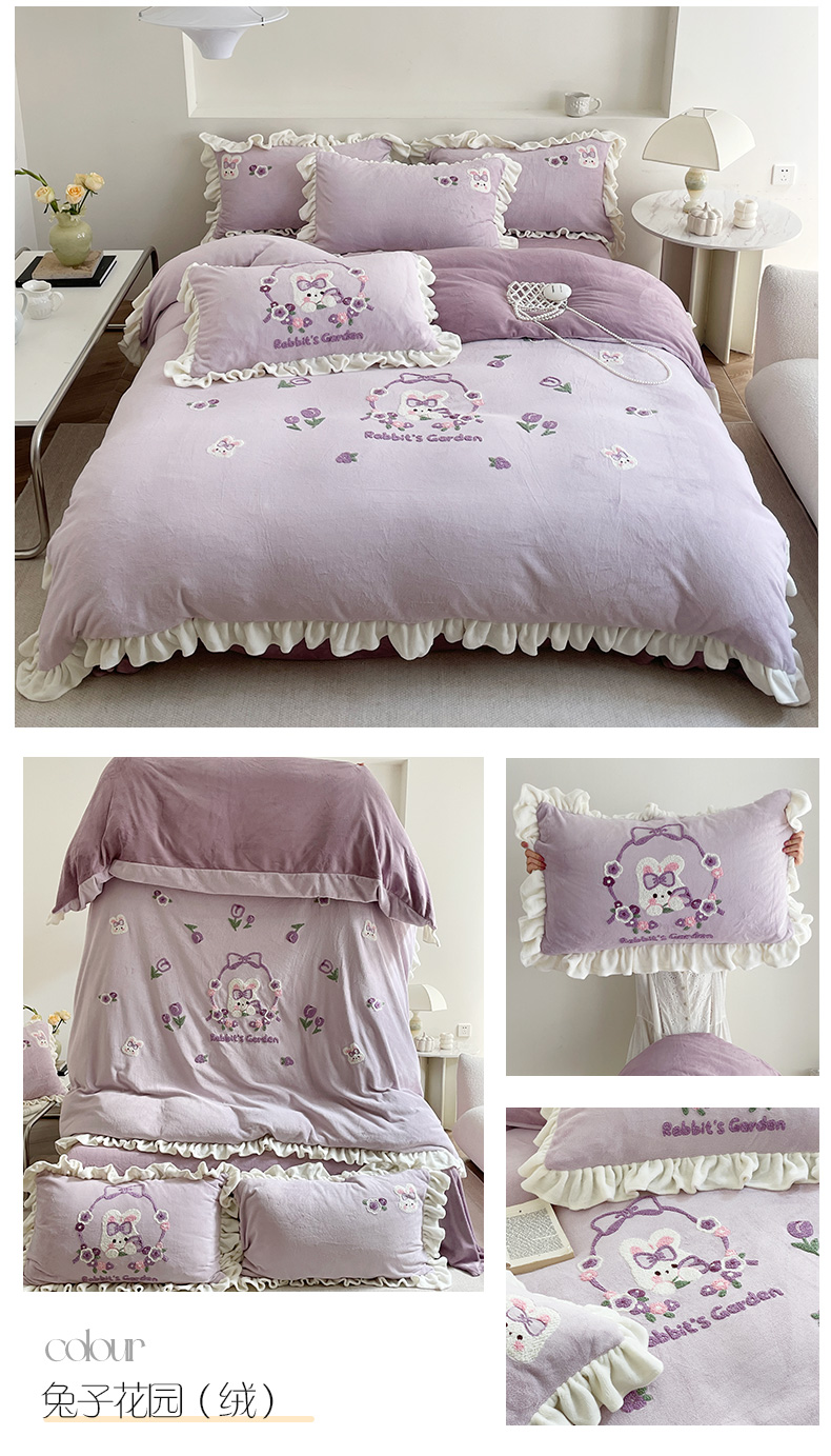 当前位置: 91家纺网 > 商品网购 > 床品套件 > 四件套 > 牛奶绒四件套 > 眠屿家纺 2023新款加厚高克重牛奶绒花边四件套 花边兔子花园-紫
