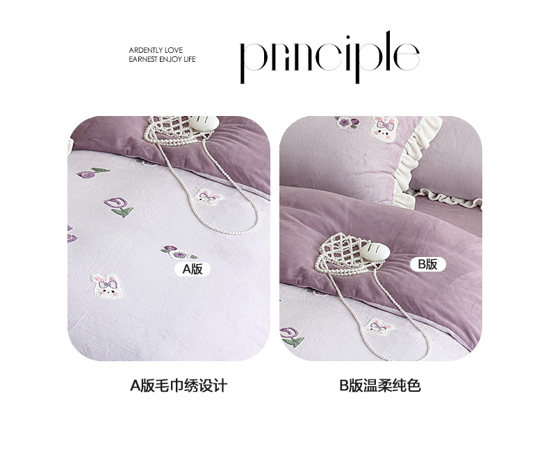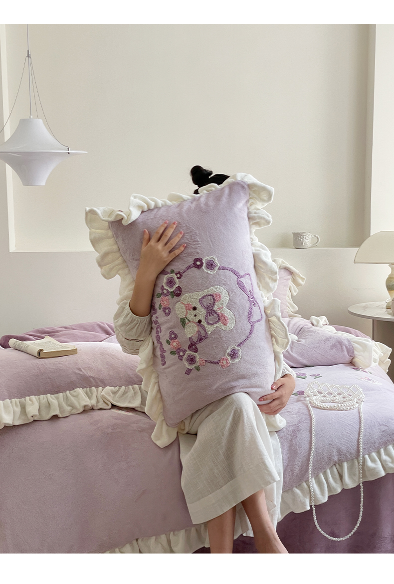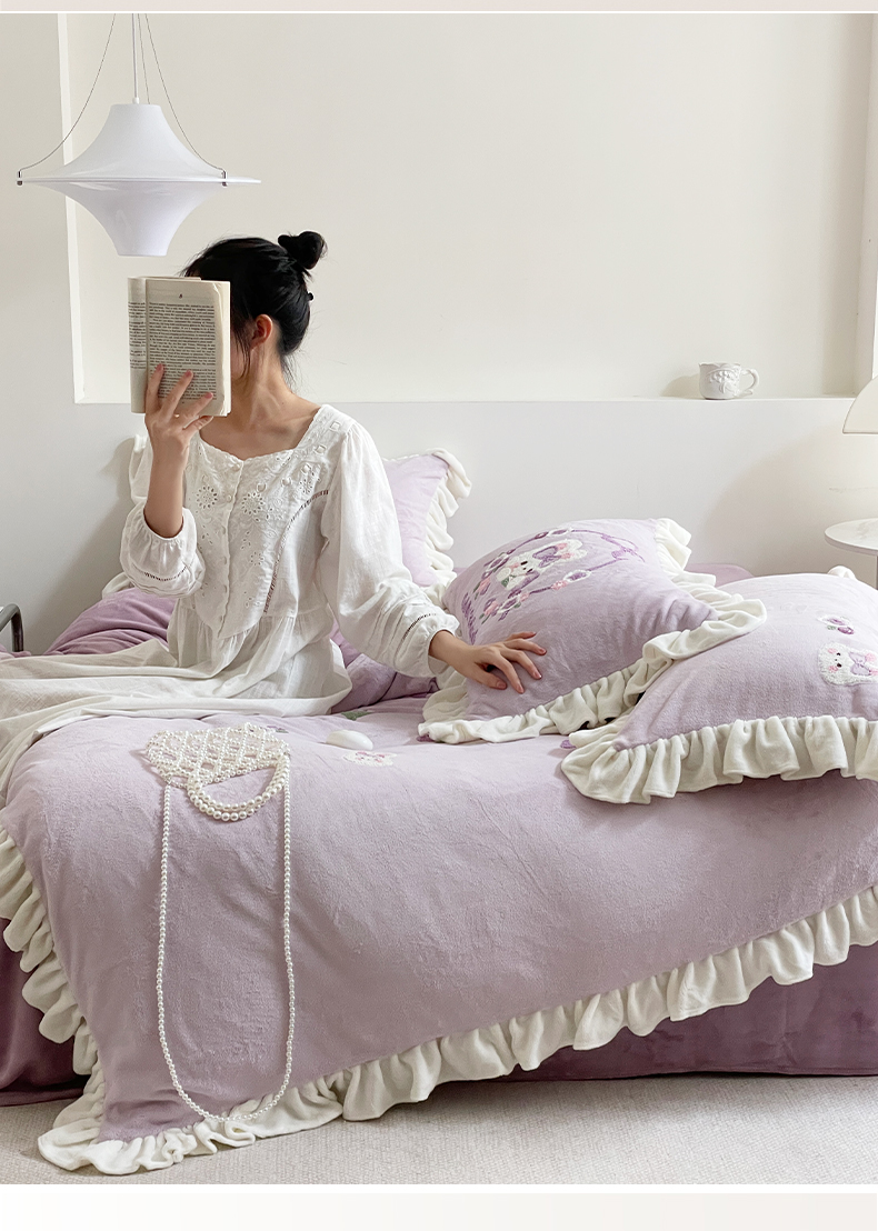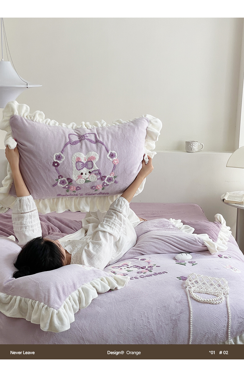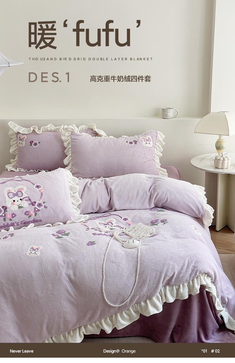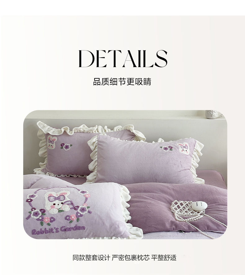 当前位置: 91家纺网 > 商品网购 > 床品套件 > 四件套 > 牛奶绒四件套 > 眠屿家纺 2023新款加厚高克重牛奶绒花边四件套 花边兔子花园-紫
