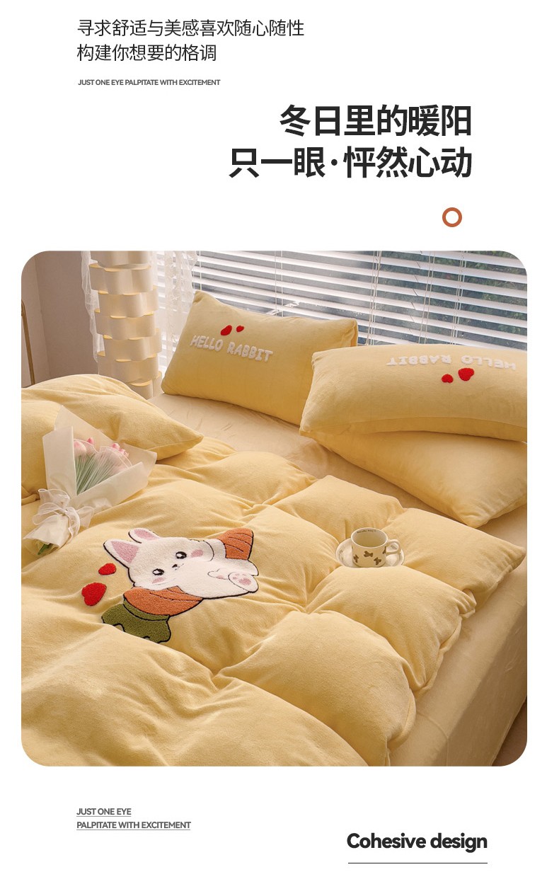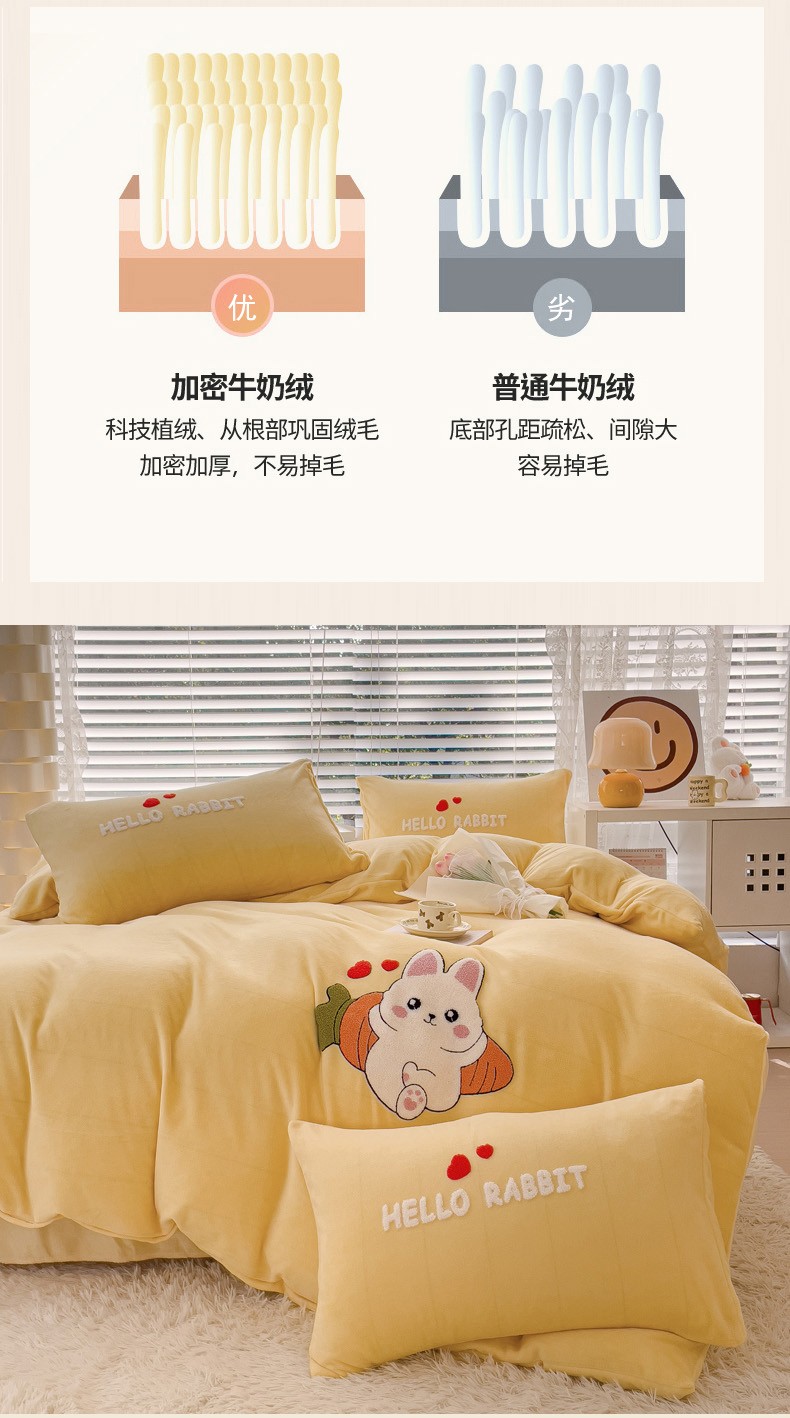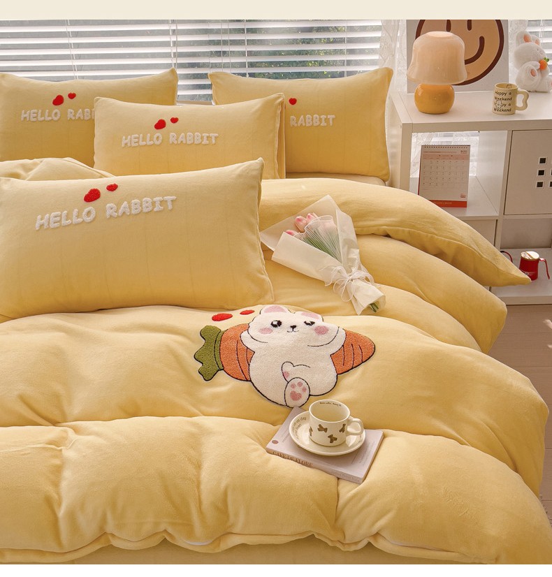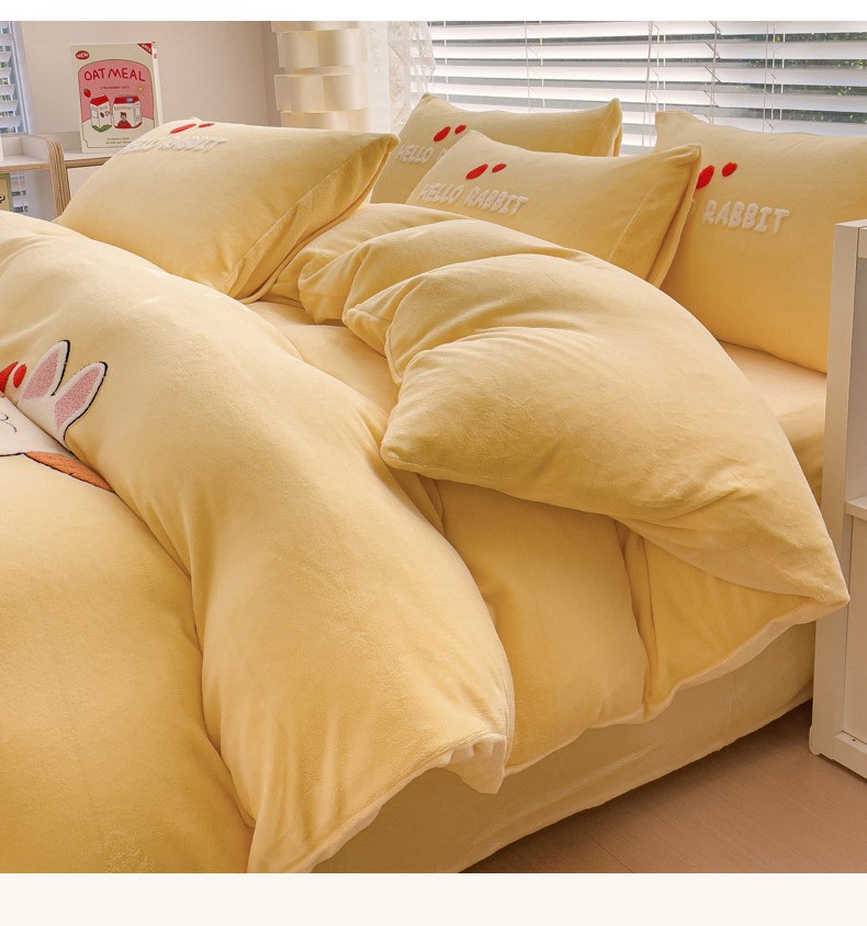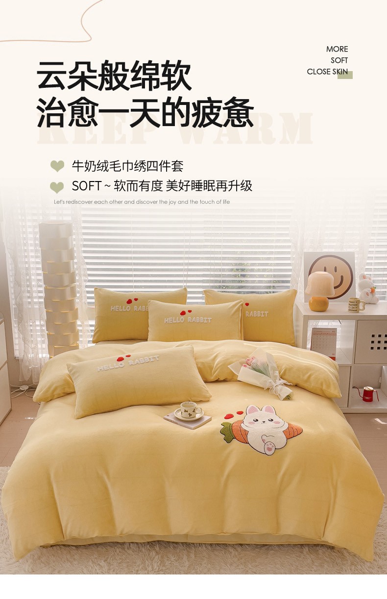 商品名称:菲儿家纺 2023新款牛奶绒毛巾绣四件套 可爱兔-黄