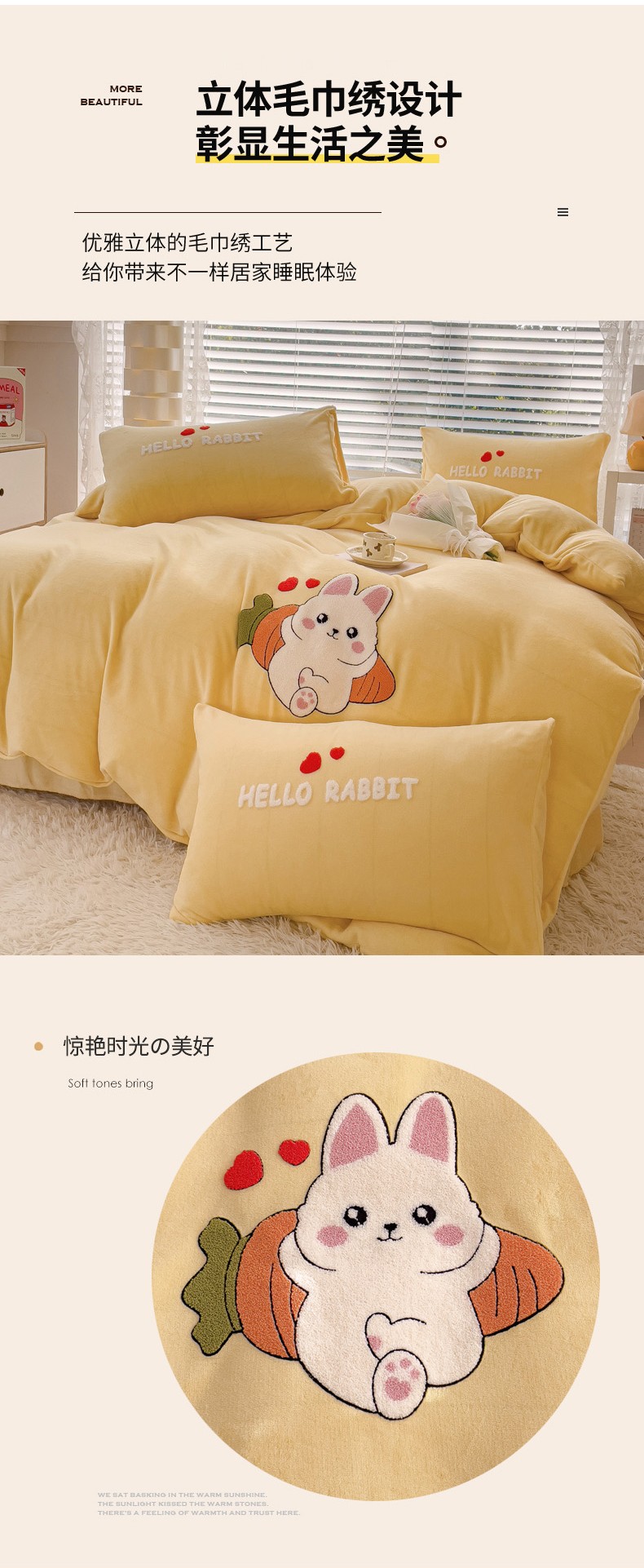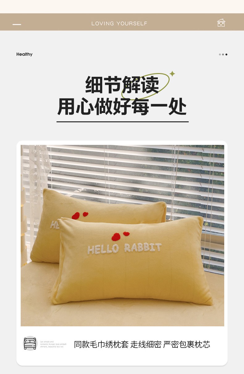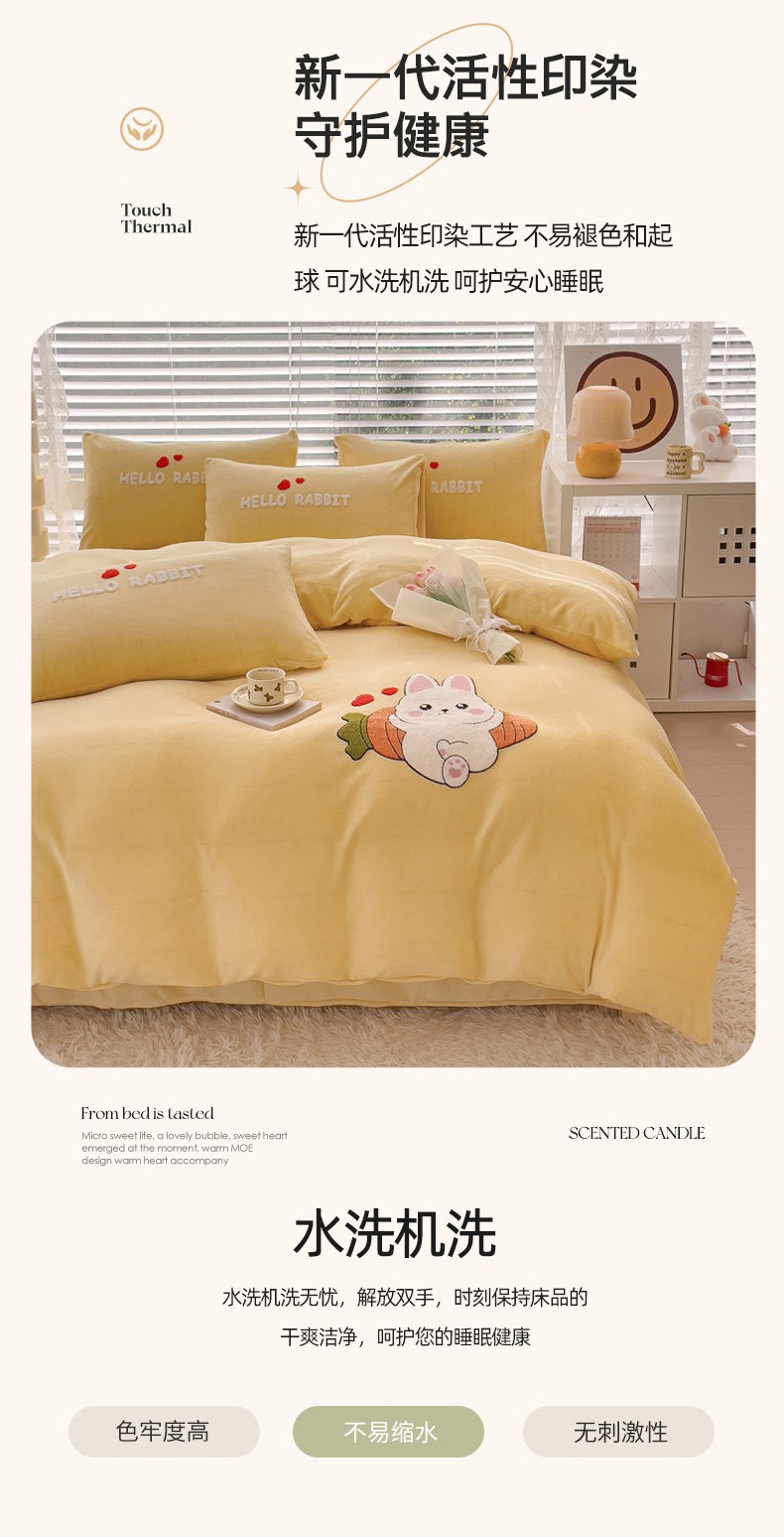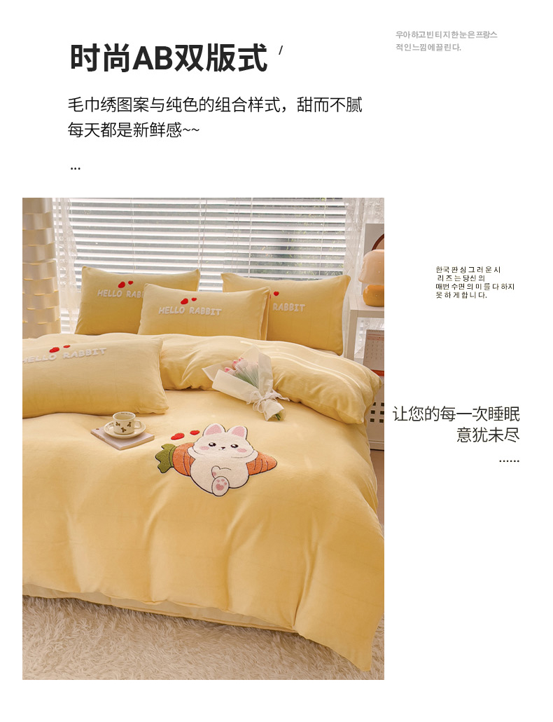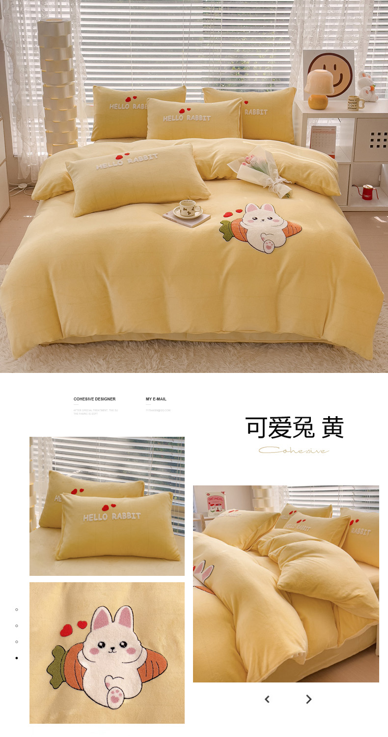 商品名称:菲儿家纺 2023新款牛奶绒毛巾绣四件套 可爱兔-黄