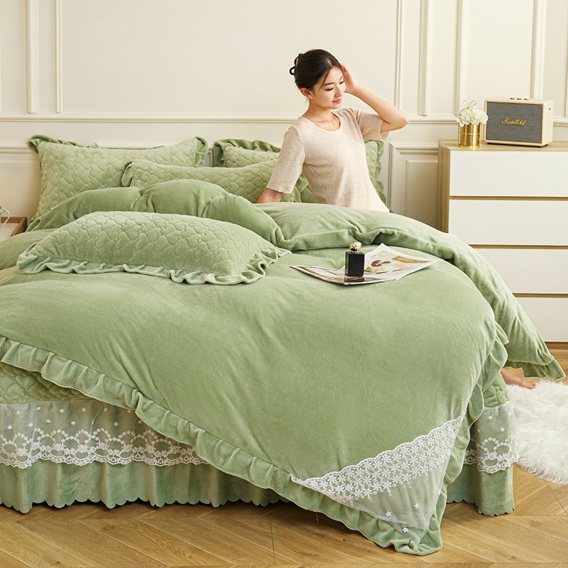 漫布云2025秋冬新款11斤230g全消光牛奶绒夹棉床盖款四件套纯色蕾丝花边刺绣床裙款床盖,蝶恋花-梦幻紫, 蝶恋花-嫩黄 ,蝶恋花-新芽绿, 蝶恋花-婴儿蓝, 蝶恋花-樱花粉
