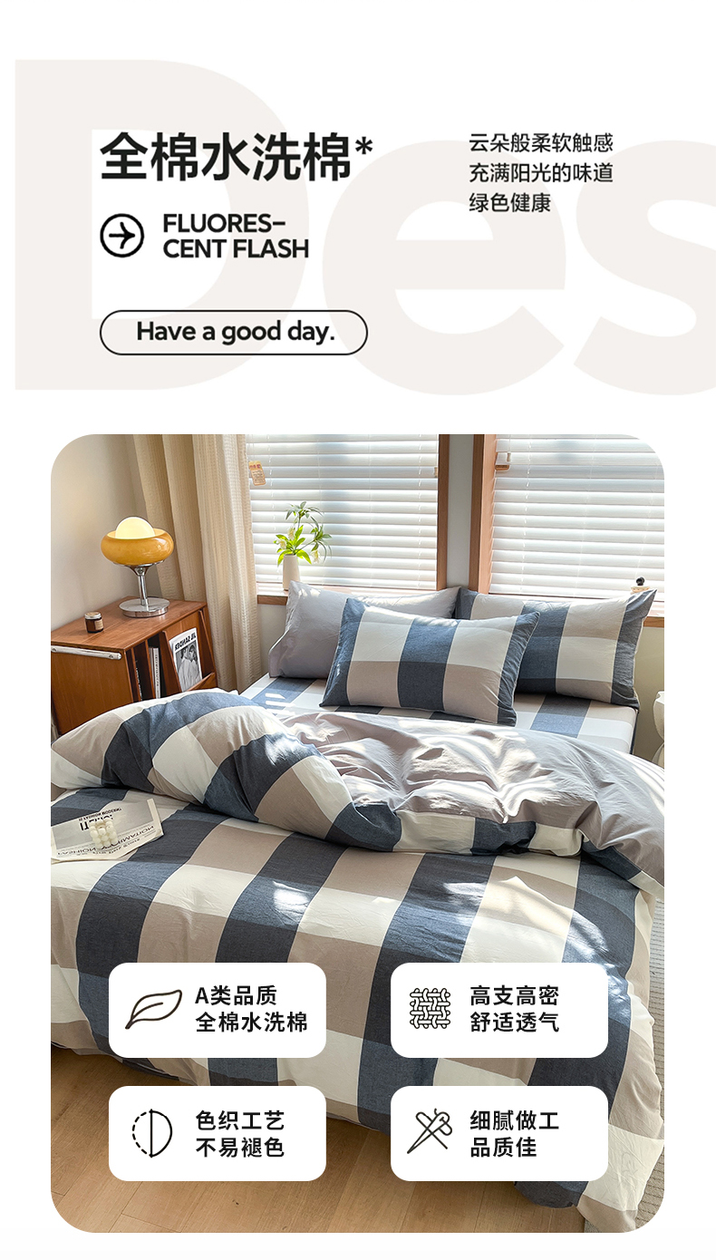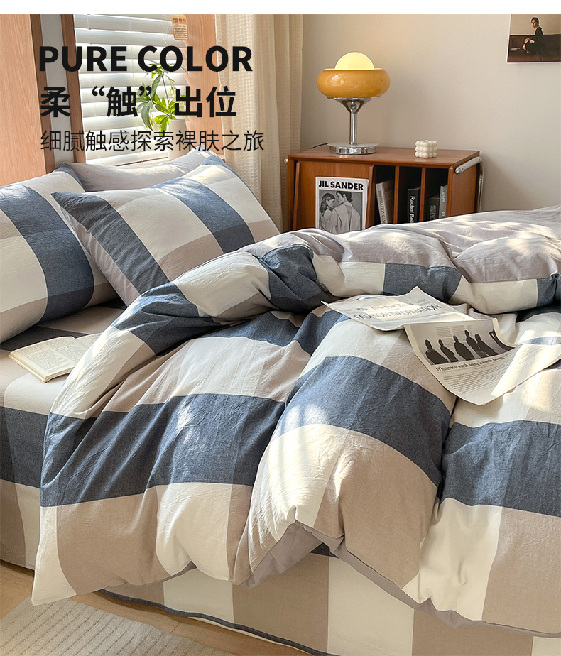 启程家纺 2026新款全棉A类水洗棉多规格四件套单品-四件套 蓝大格