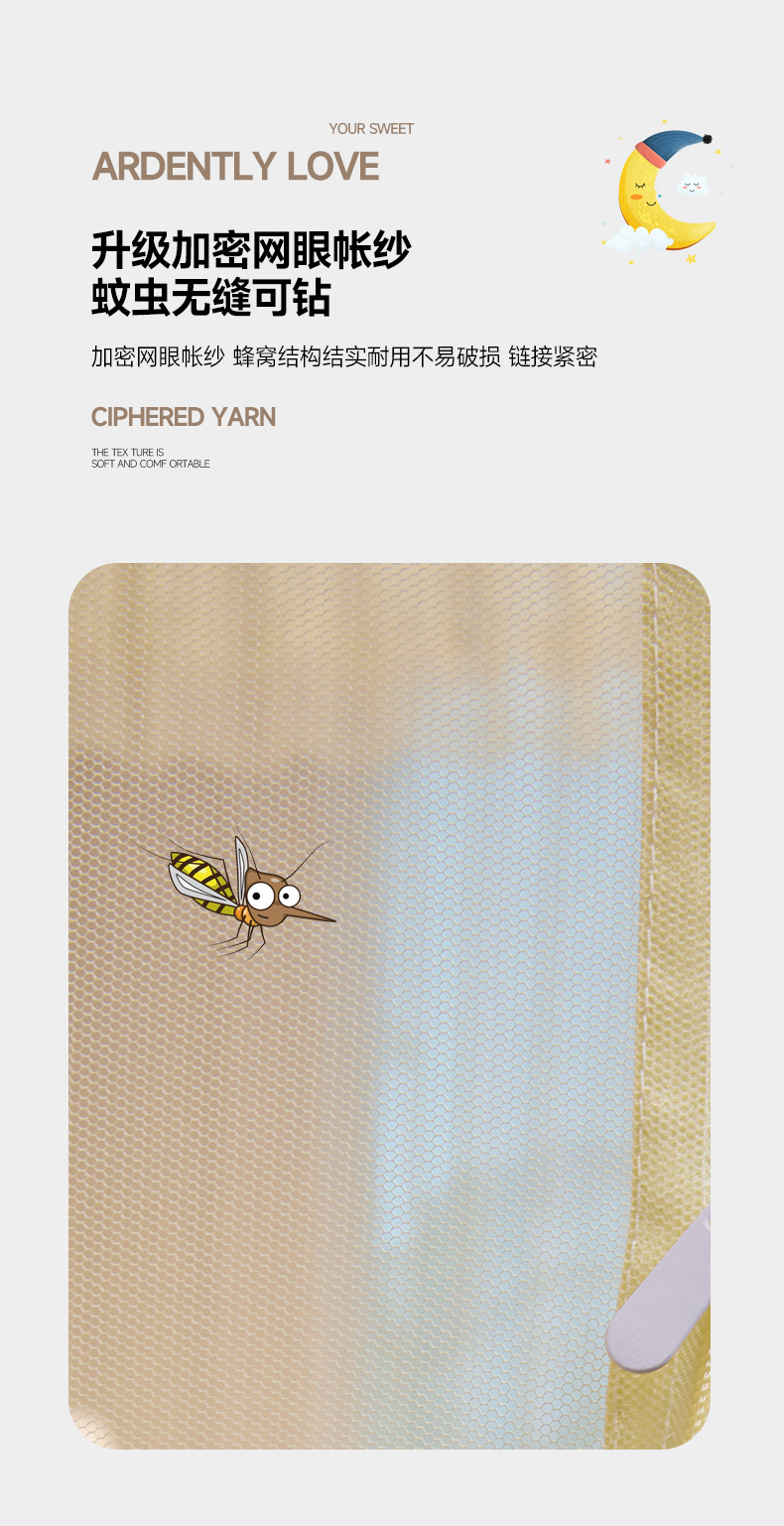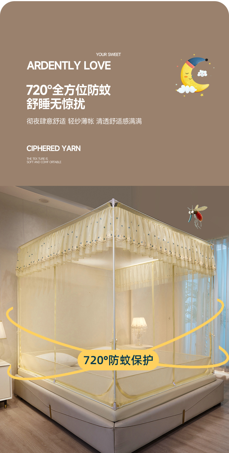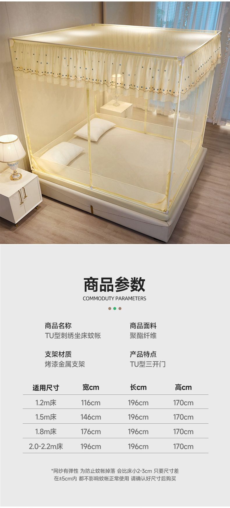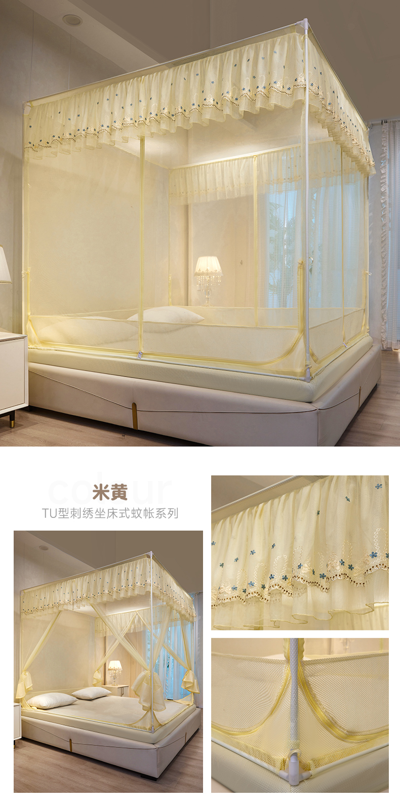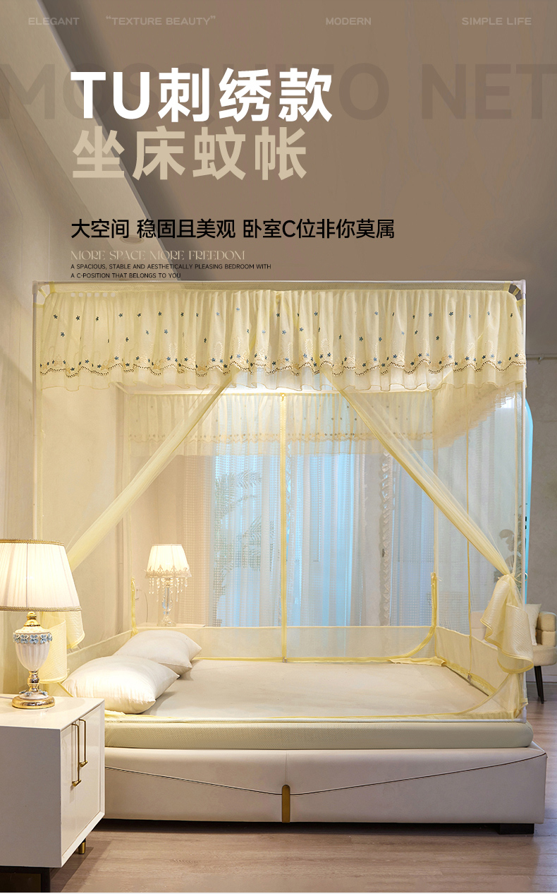 商品名称:富莱星蚊帐 2024新款TU型刺绣坐床蚊帐 TU刺绣-米黄