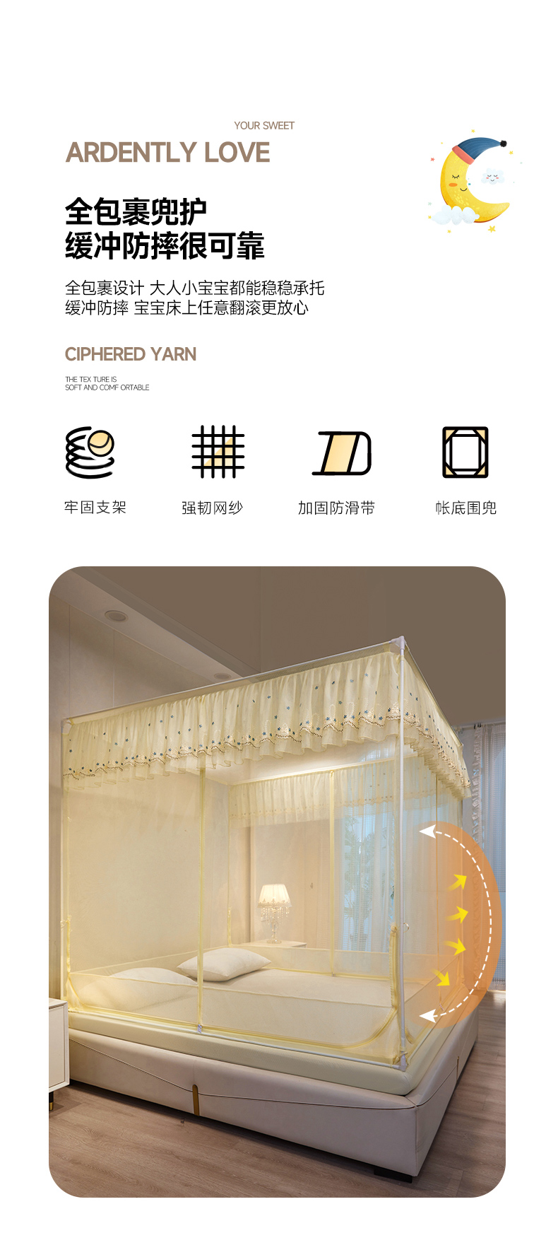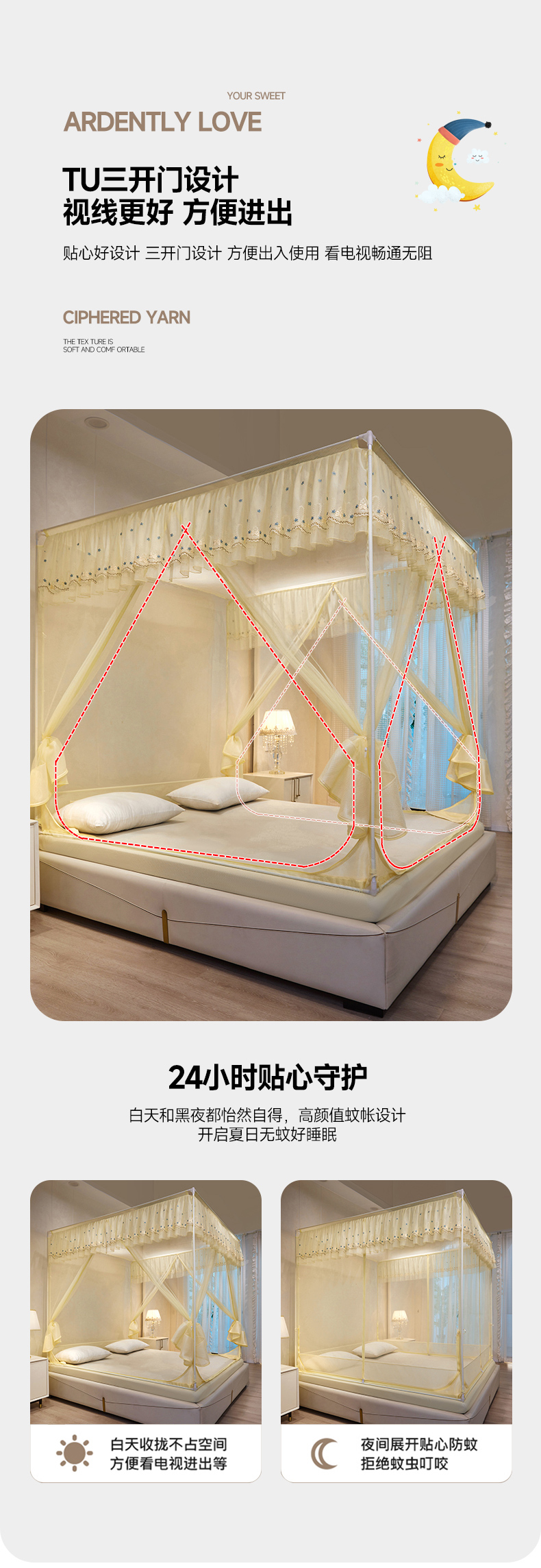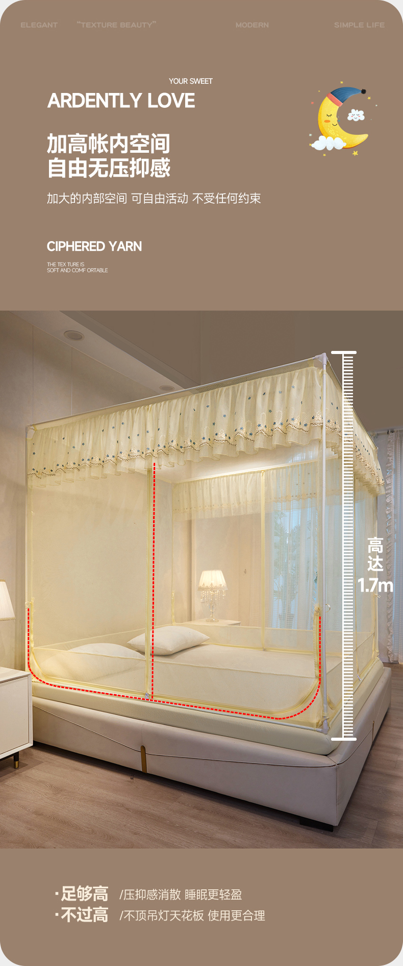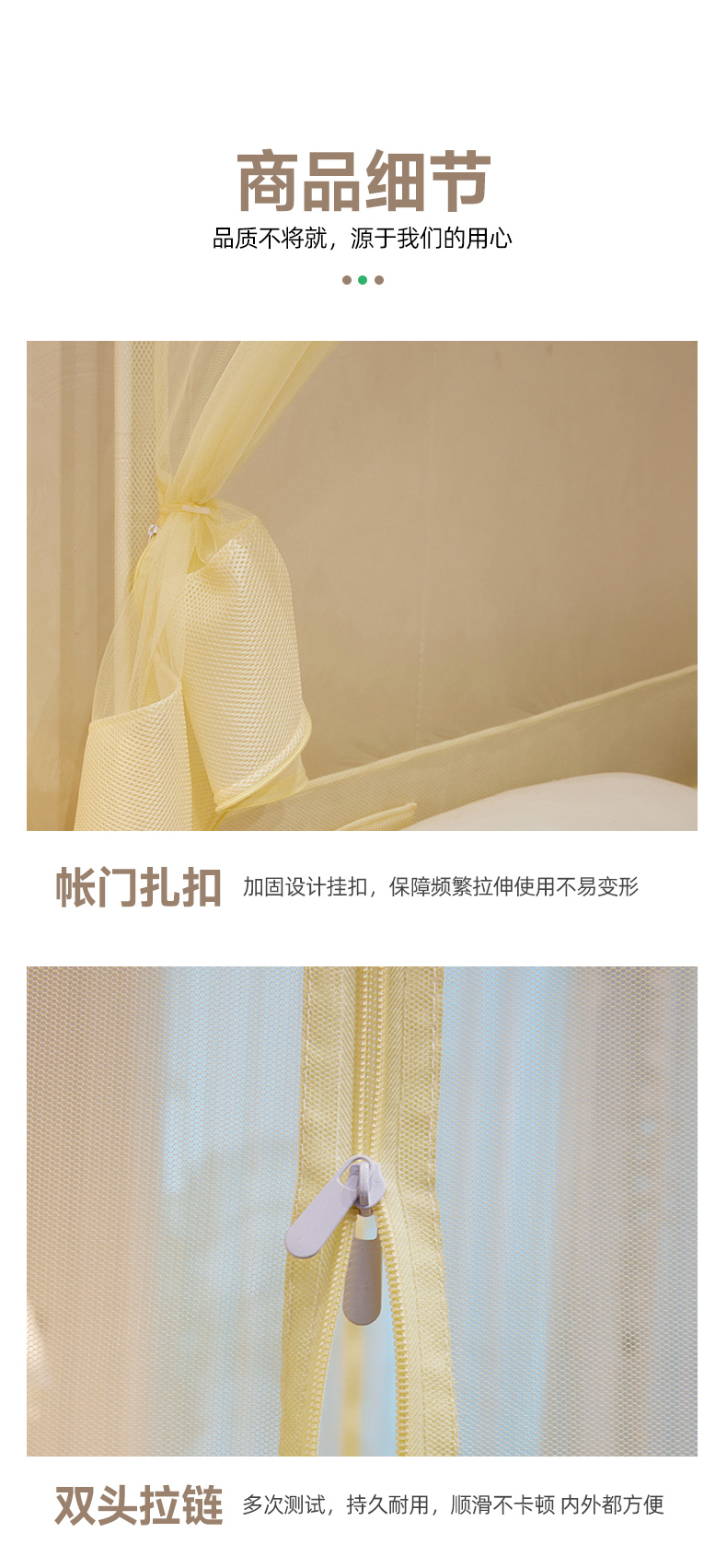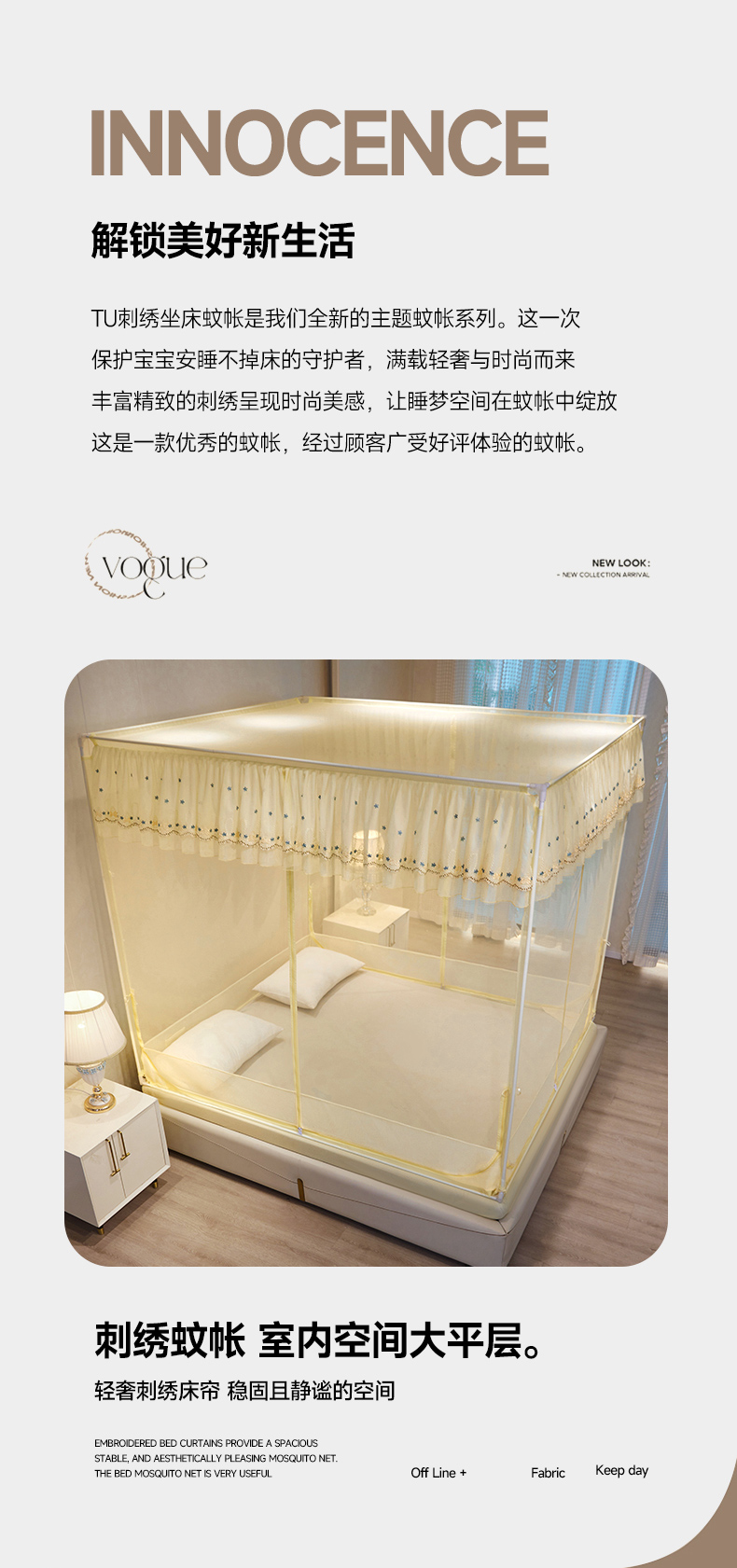 商品名称:富莱星蚊帐 2024新款TU型刺绣坐床蚊帐 TU刺绣-米黄
