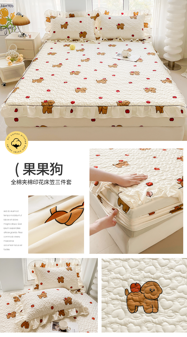 宜凡家纺 2024新款全棉印花夹棉床笠三件套 果果狗
