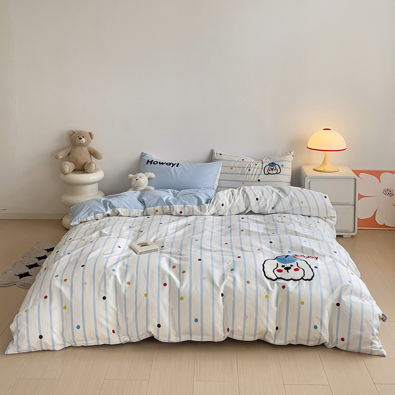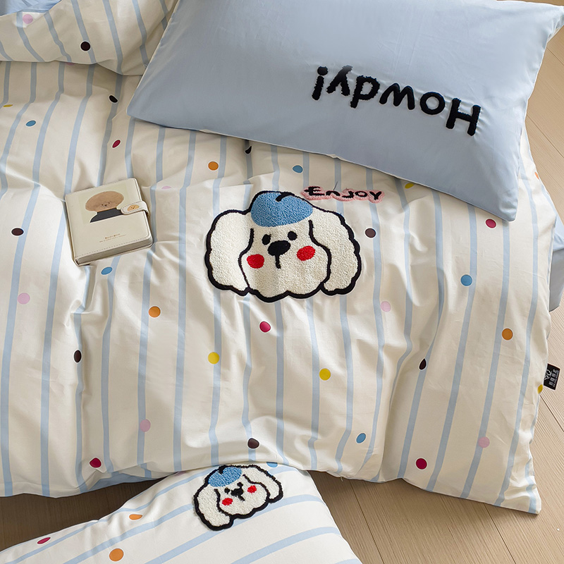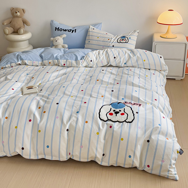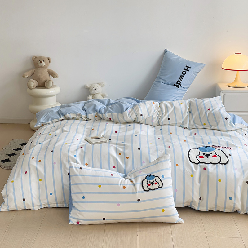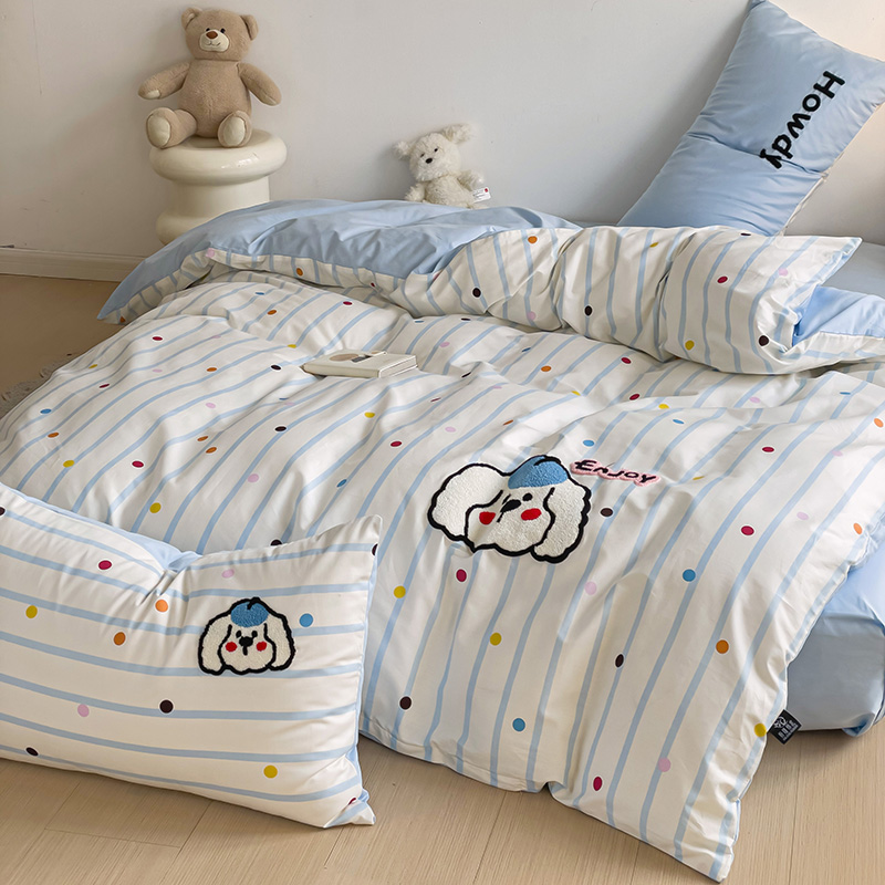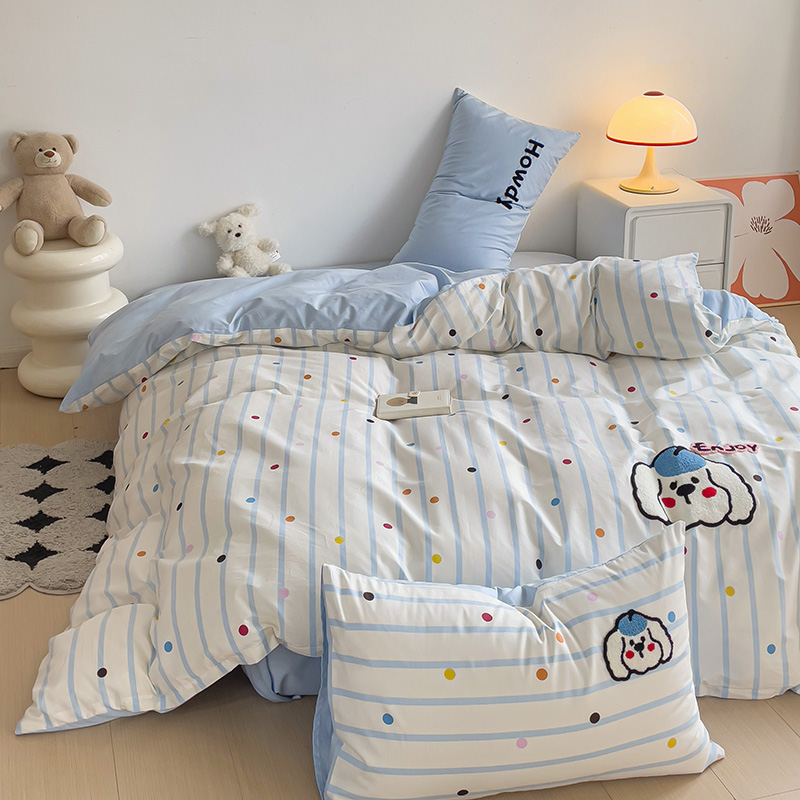 乐童家纺 2024爆款全棉1332呆萌小刺绣系列四件套 蓝帽狗