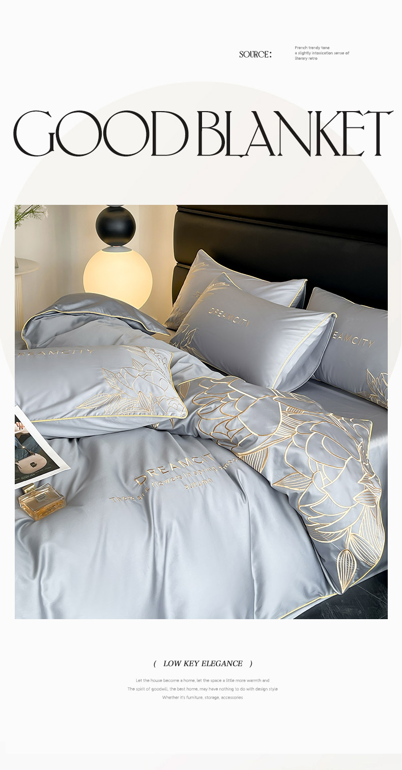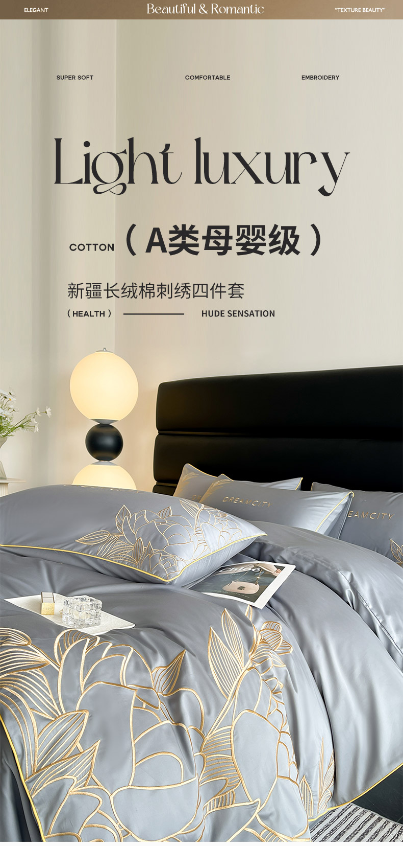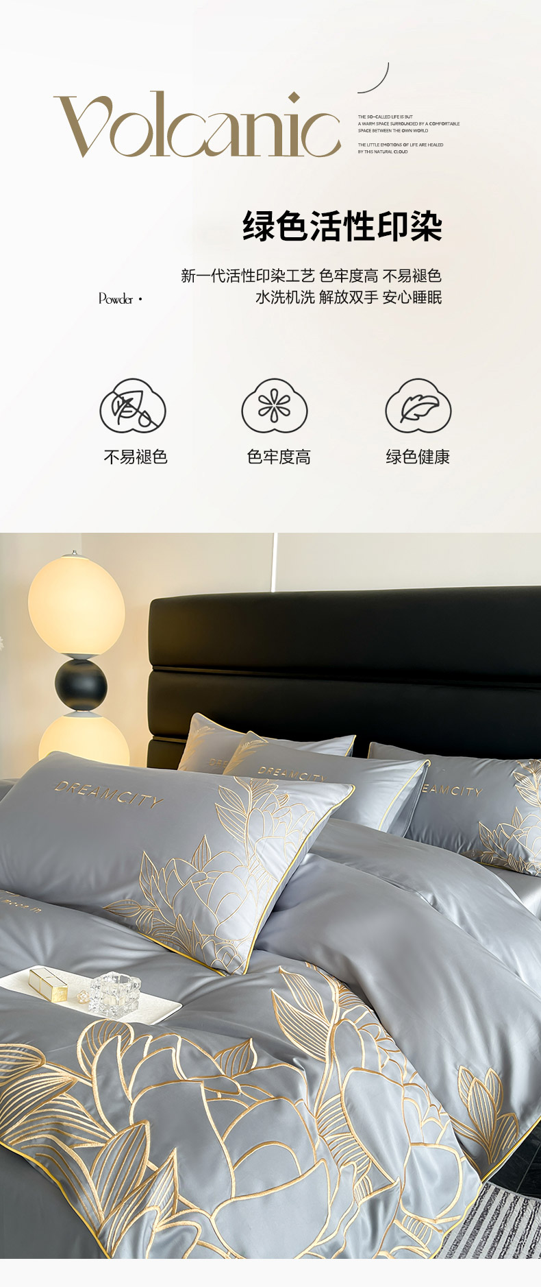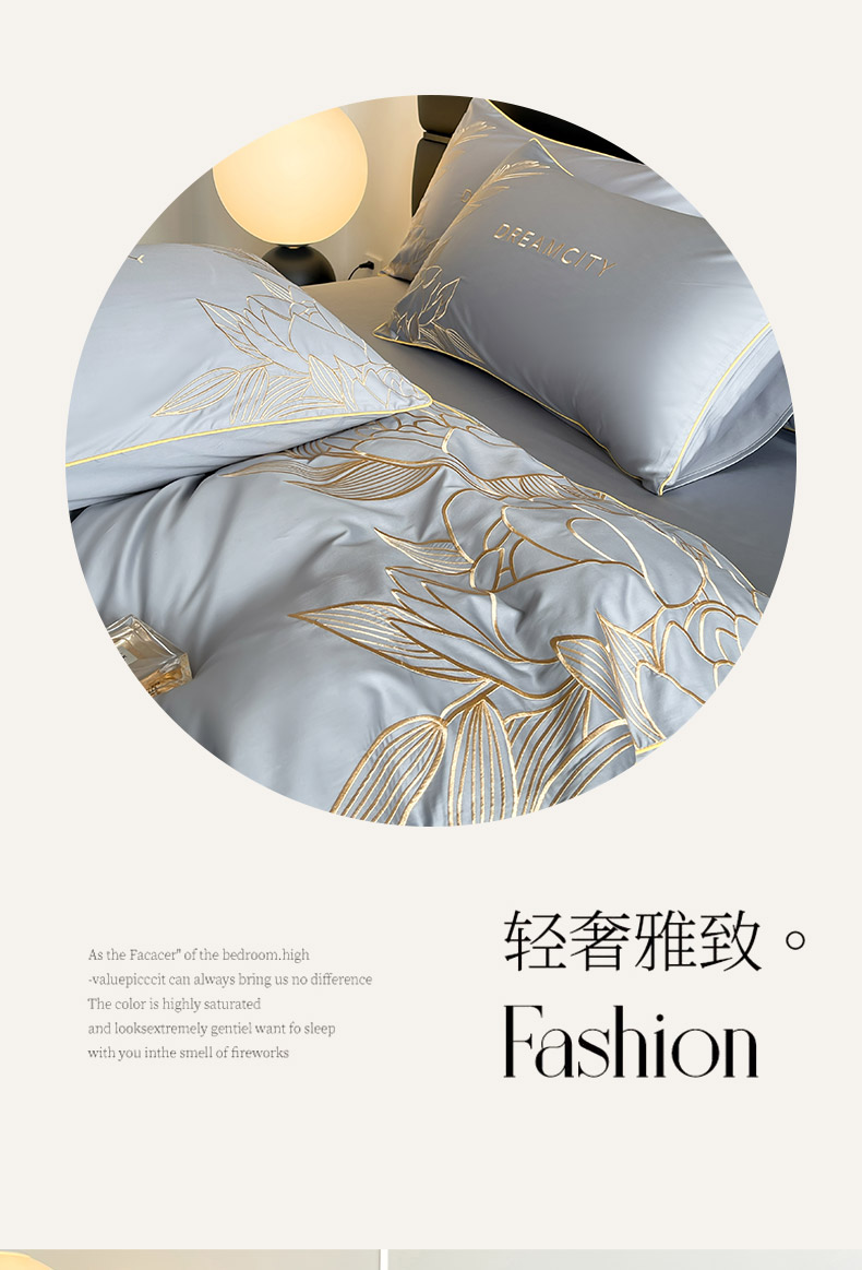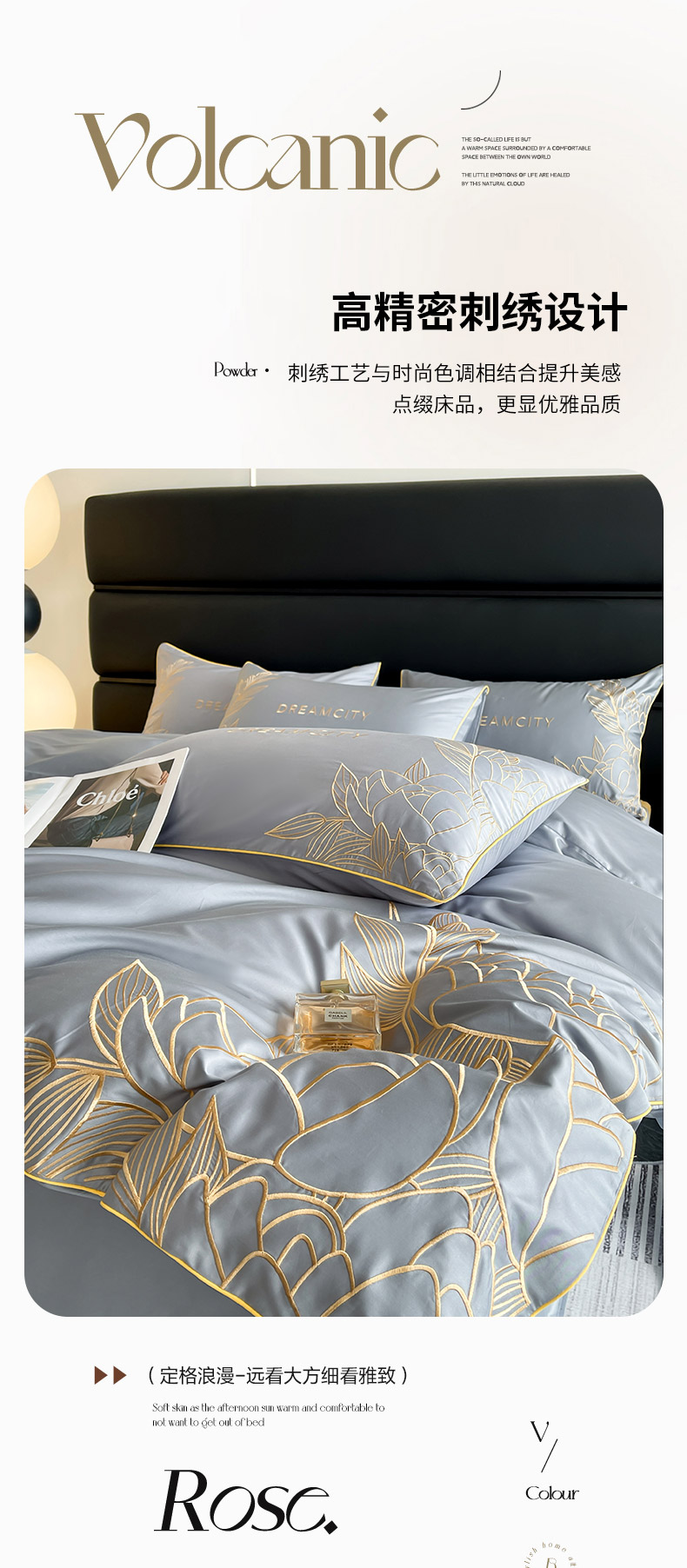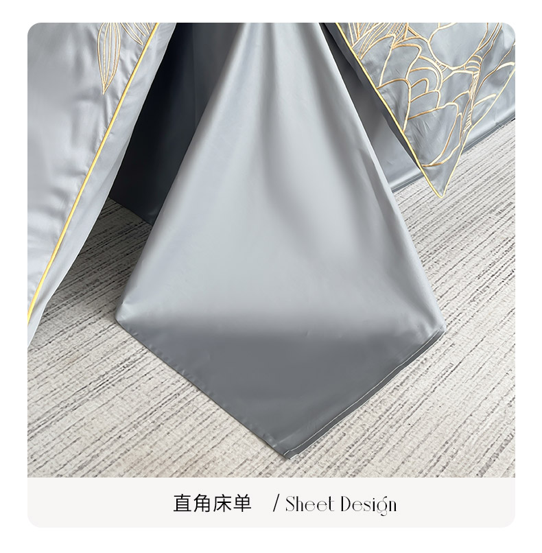【A类母婴级】100支长绒棉四件套全棉纯棉金线刺绣酒店风纯色简约床笠款澳棉天丝棉棉轻奢床上用品 莲芙蓉-银灰色