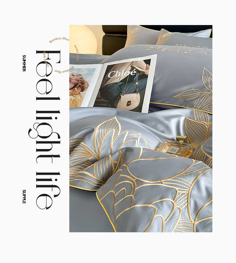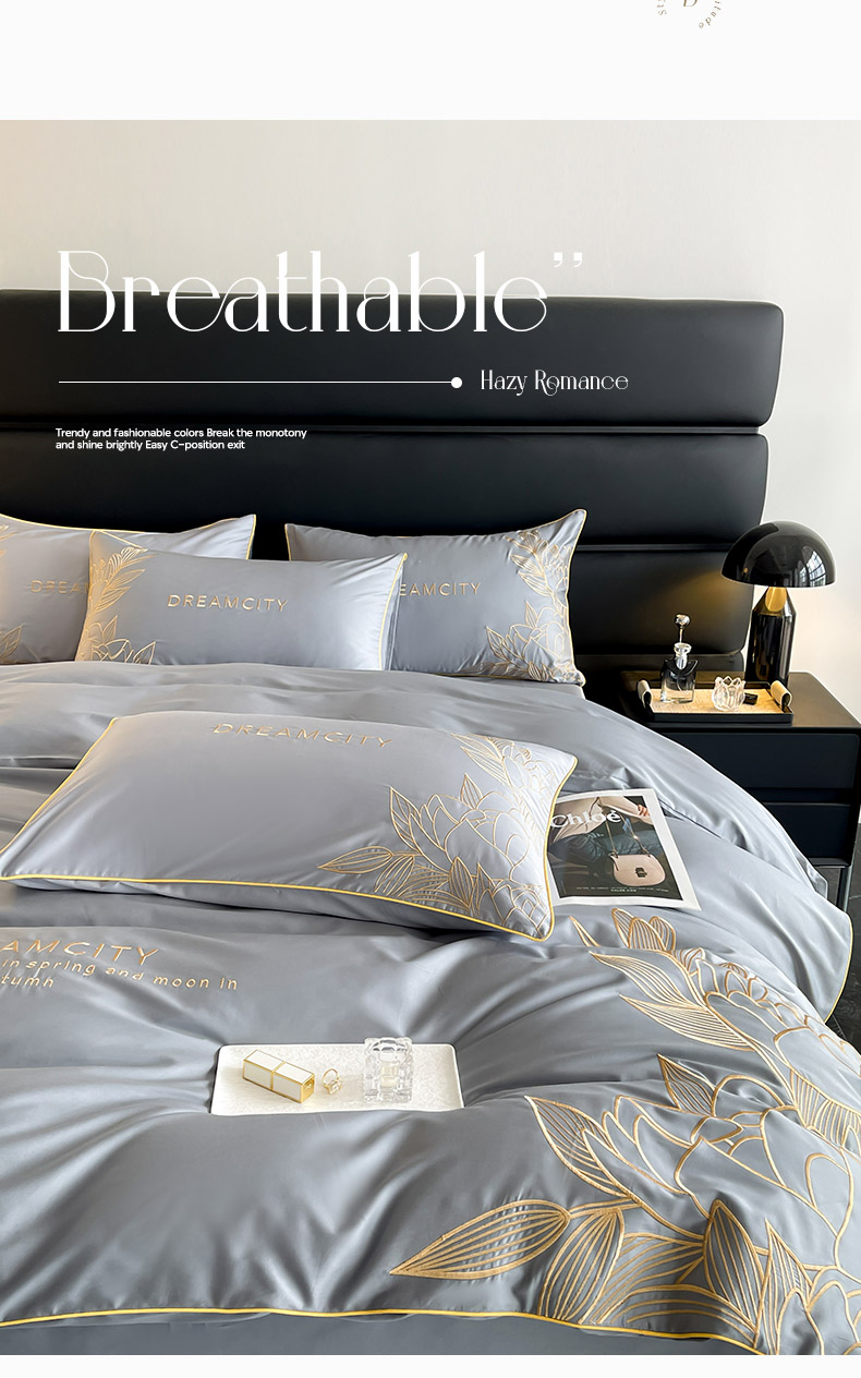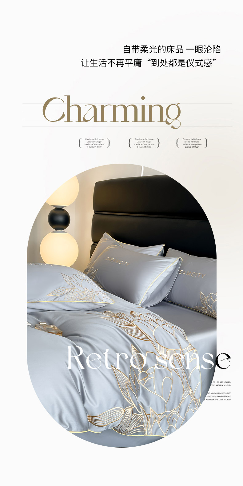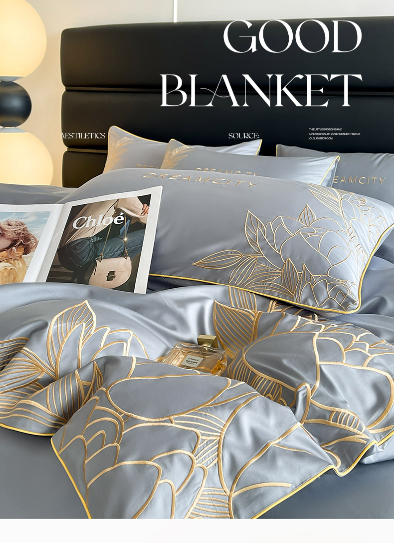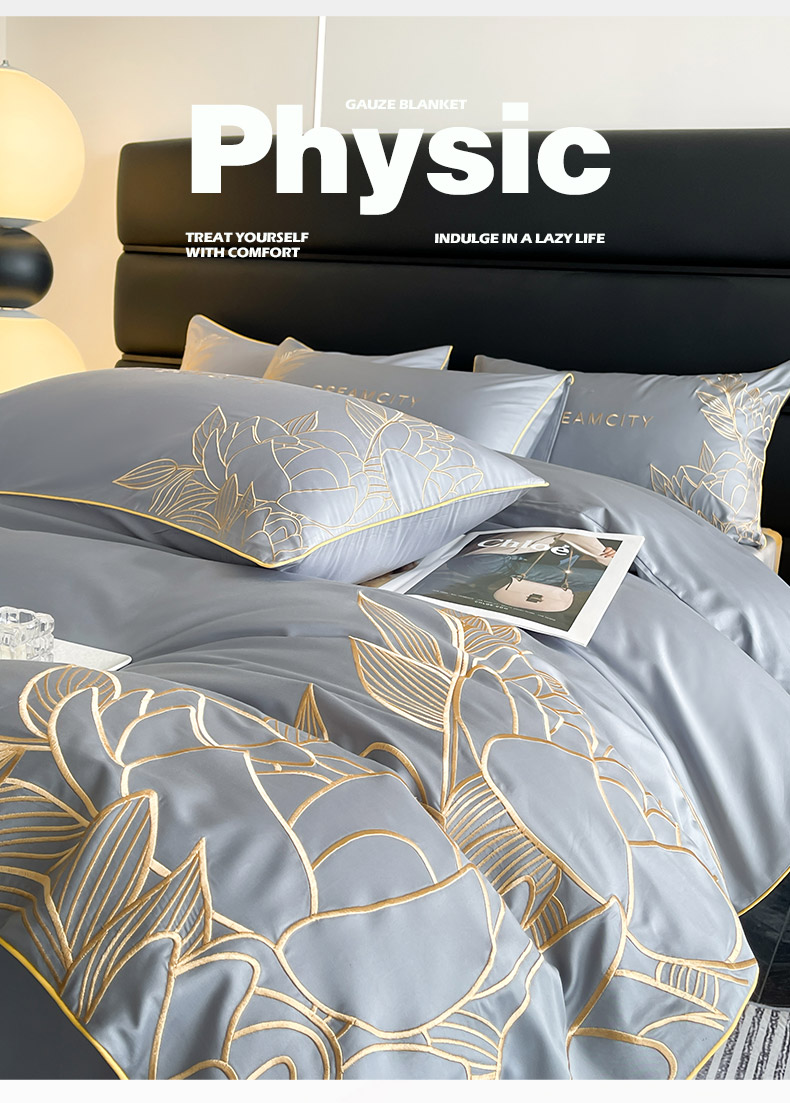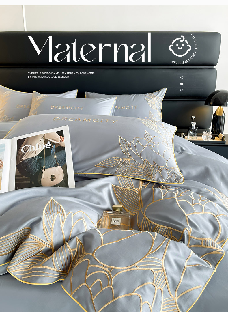 【A类母婴级】100支长绒棉四件套全棉纯棉金线刺绣酒店风纯色简约床笠款澳棉天丝棉棉轻奢床上用品 莲芙蓉-银灰色