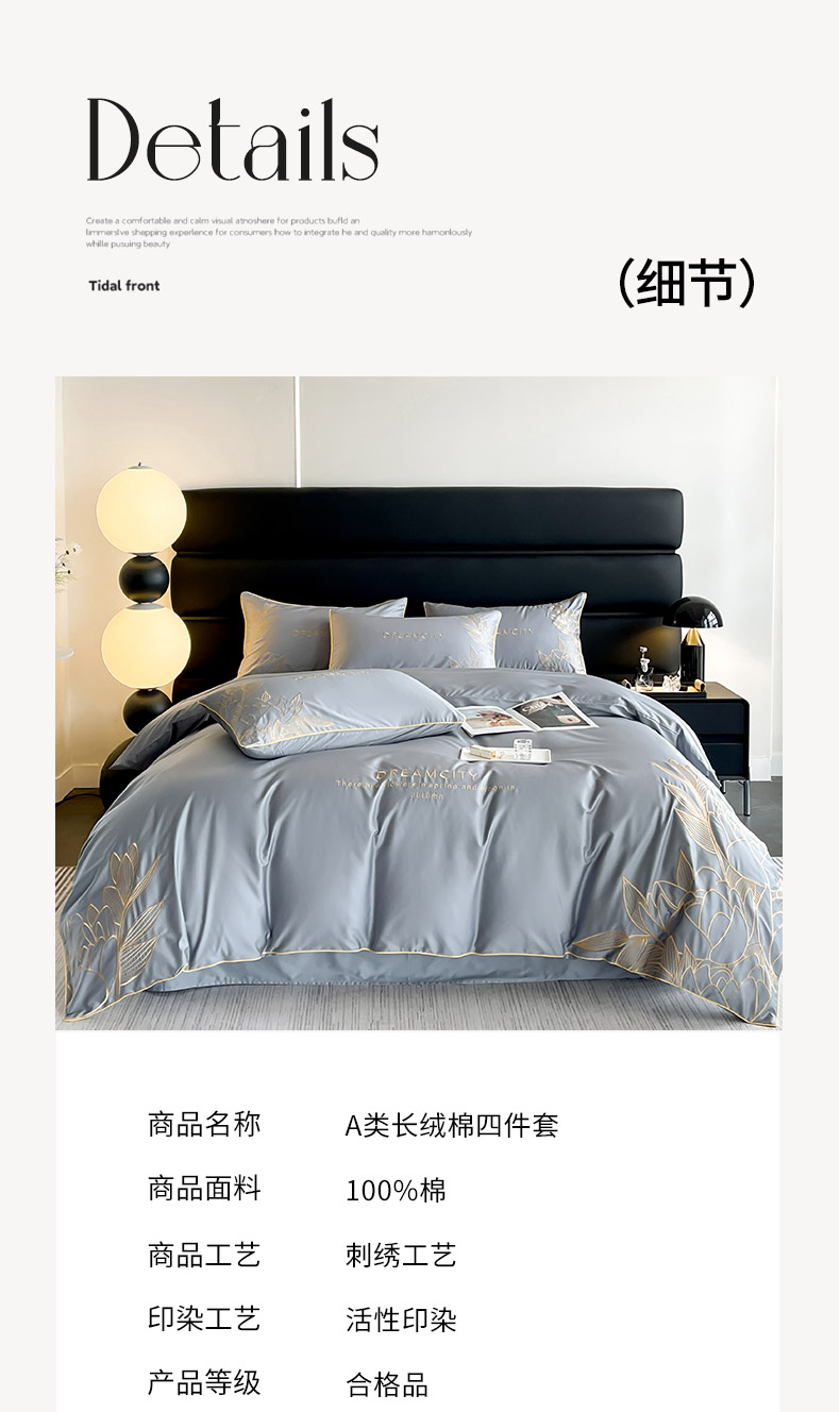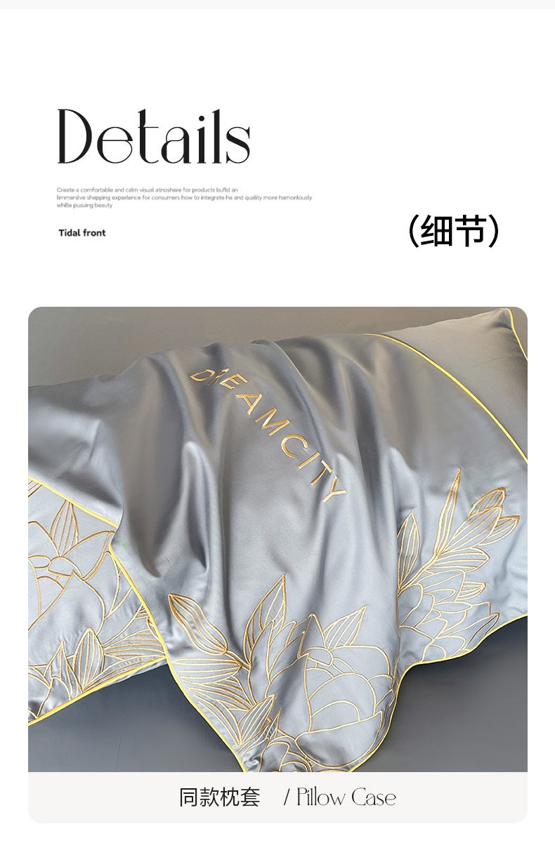 商品名称: 【A类母婴级】100支长绒棉四件套全棉纯棉金线刺绣酒店风纯色简约床笠款澳棉天丝棉棉轻奢床上用品 莲芙蓉-银灰色