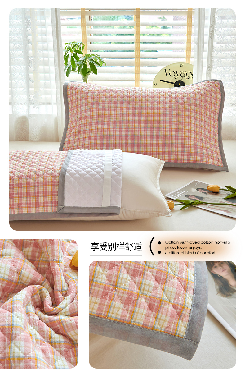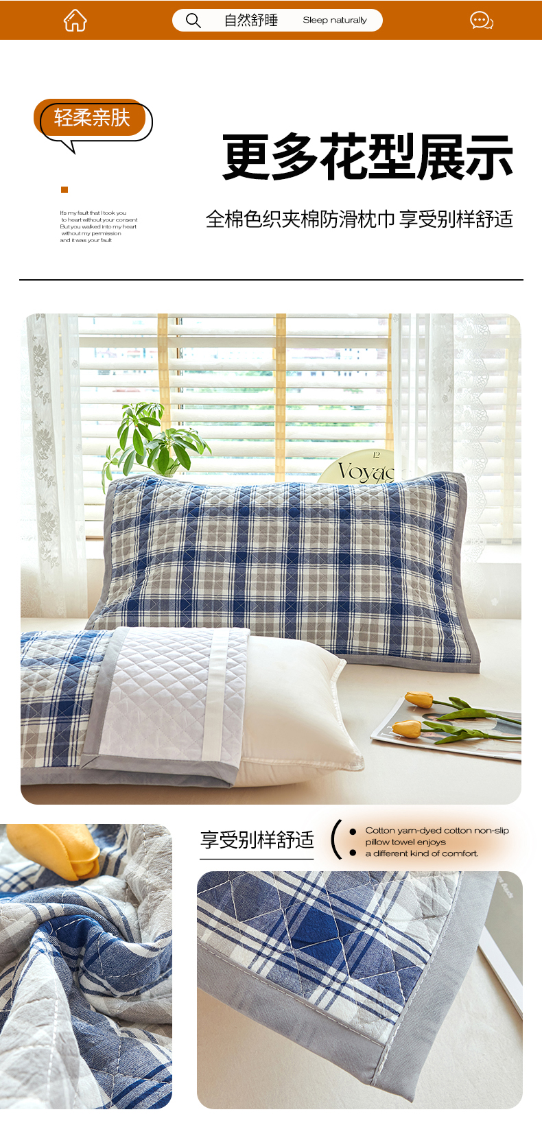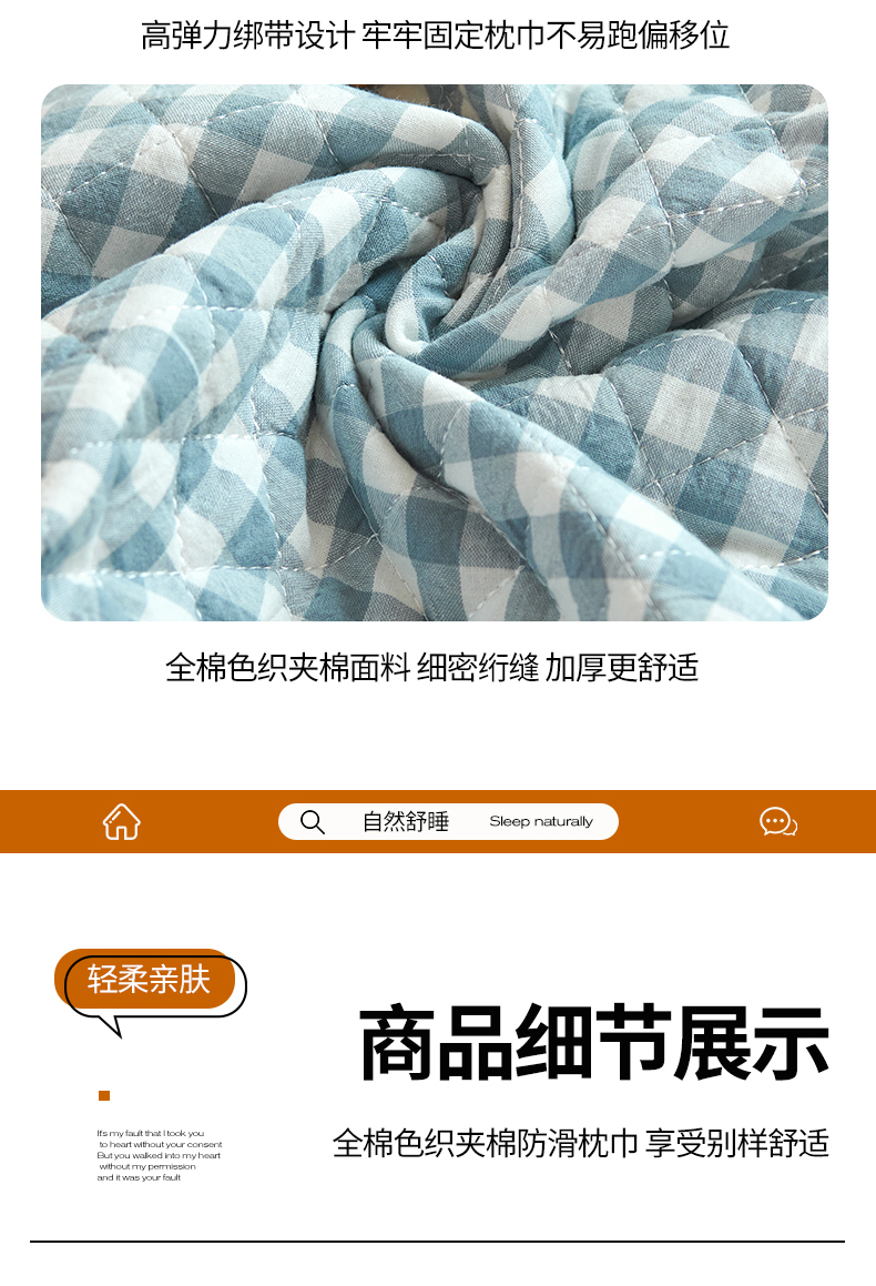 美宜家 2025枕巾全棉水洗色织绗缝绑带防滑枕巾,加厚夹棉透气隔脏防头油拼角枕巾 浅兰小格