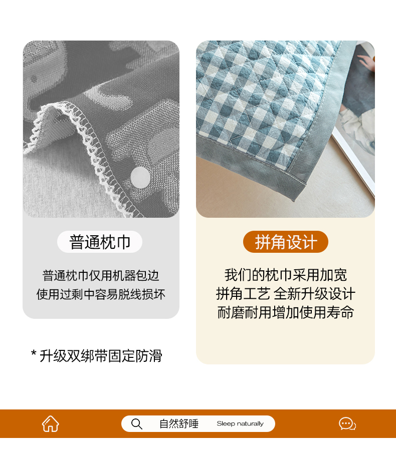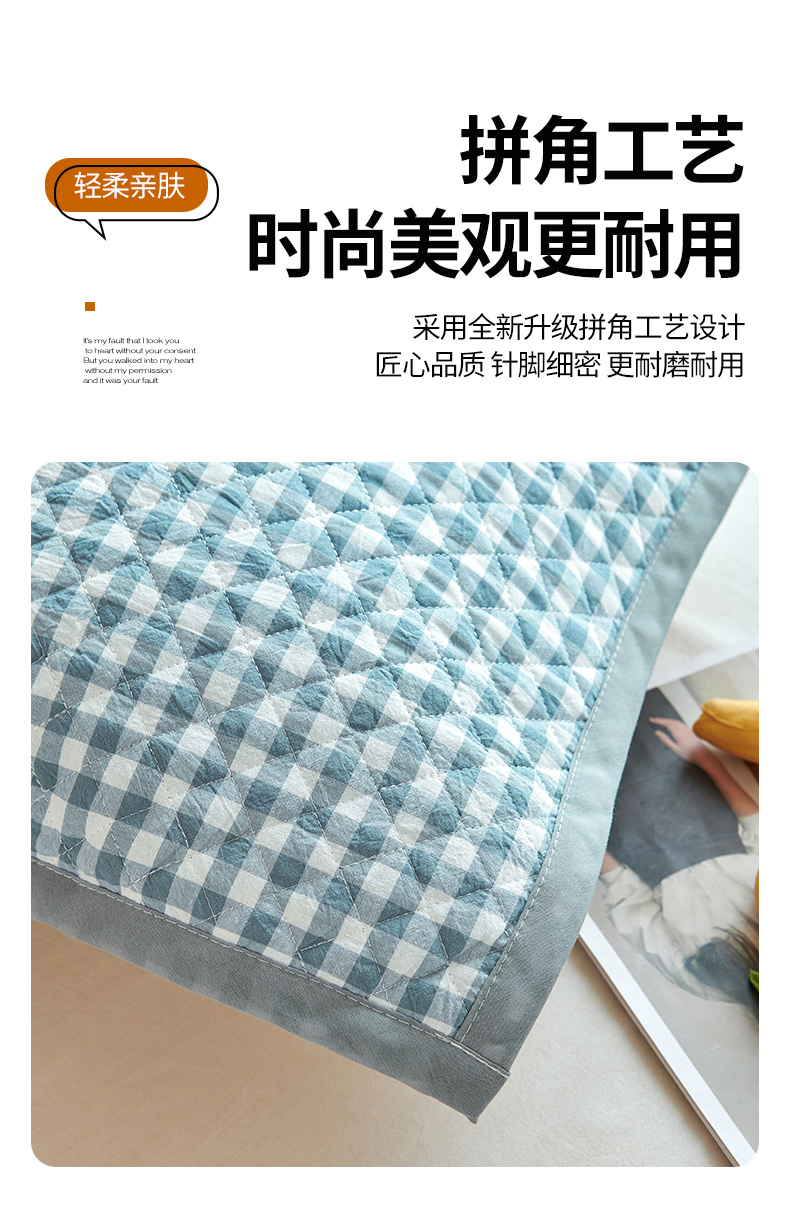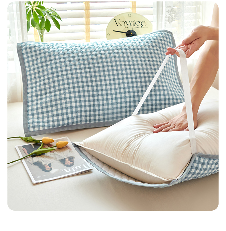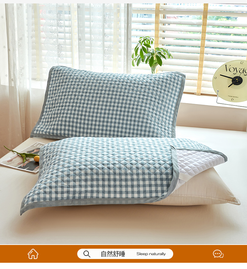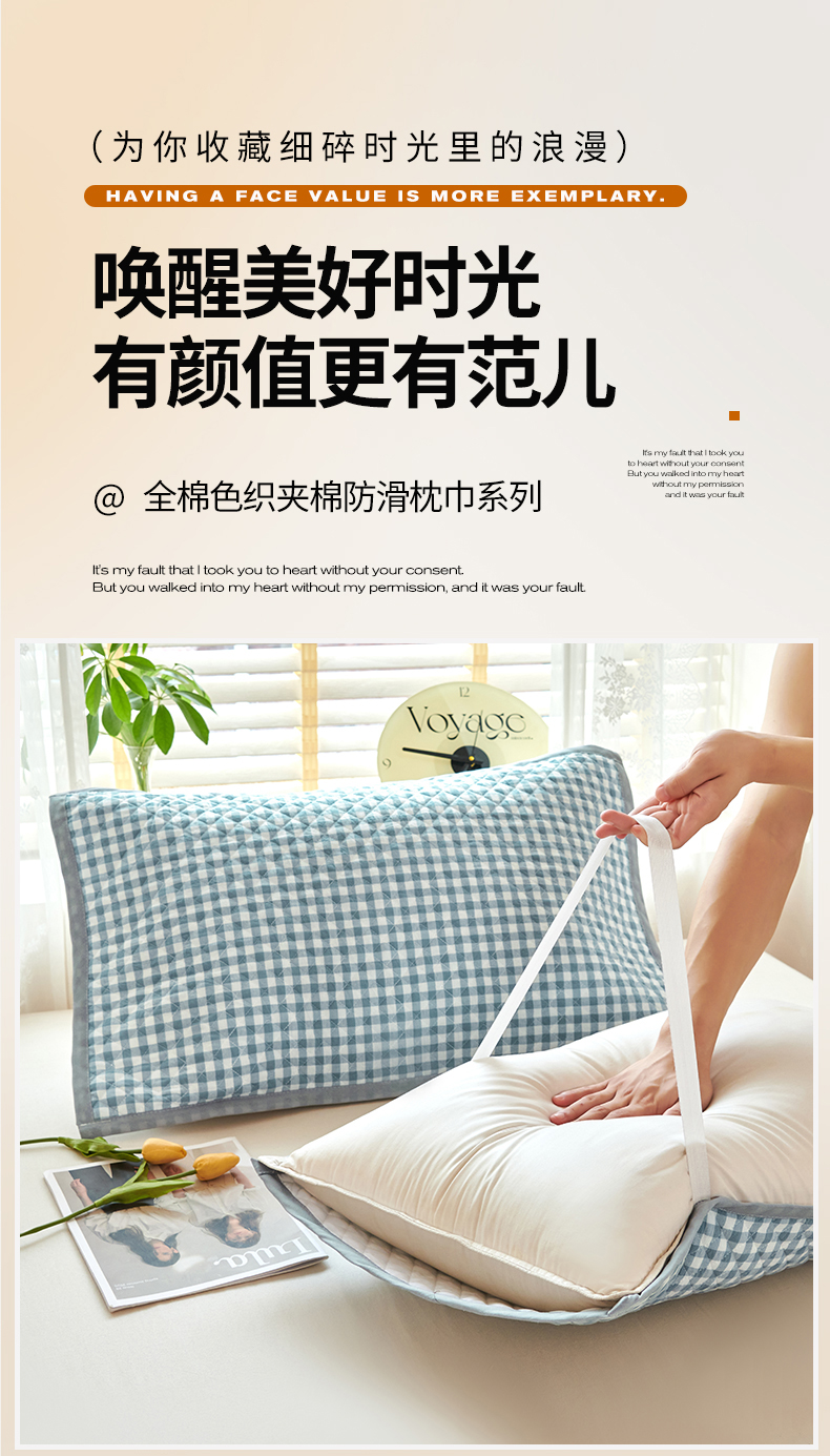 美宜家 2025枕巾全棉水洗色织绗缝绑带防滑枕巾,加厚夹棉透气隔脏防头油拼角枕巾 浅兰小格