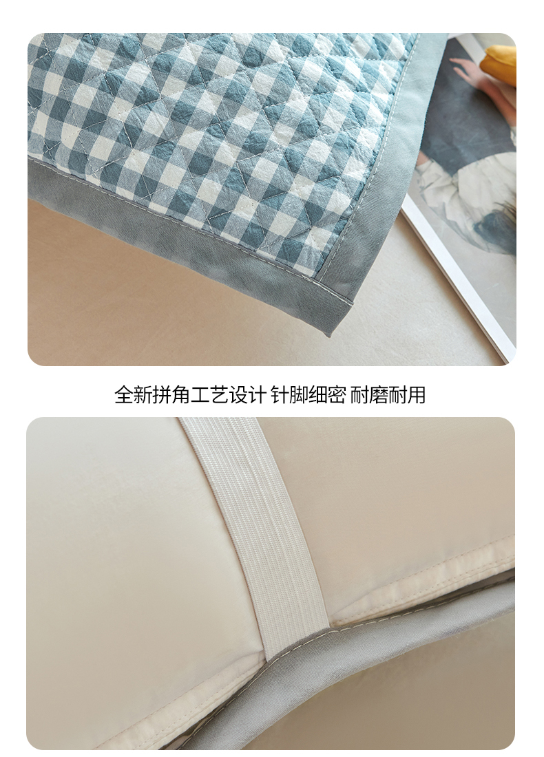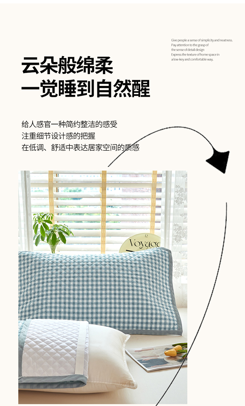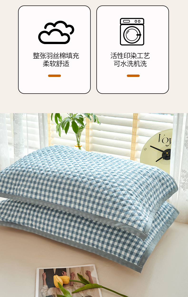 商品名称:美宜家 2025枕巾全棉水洗色织绗缝绑带防滑枕巾,加厚夹棉透气隔脏防头油拼角枕巾 浅兰小格