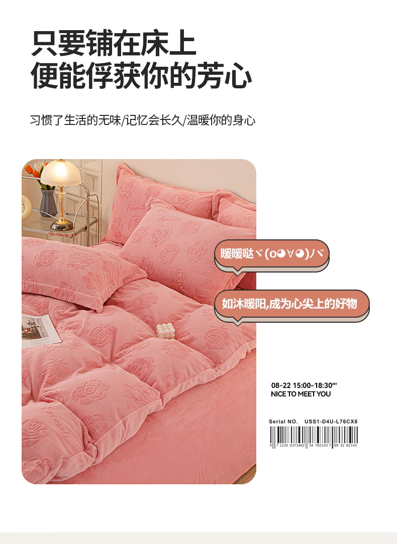 当前位置: 91家纺网 > 商品网购 > 床品套件 > 四件套 > 牛奶绒四件套 > 锦罗绣 2024新款全消光230克牛奶绒烂花绒提花四件套 粉玫瑰