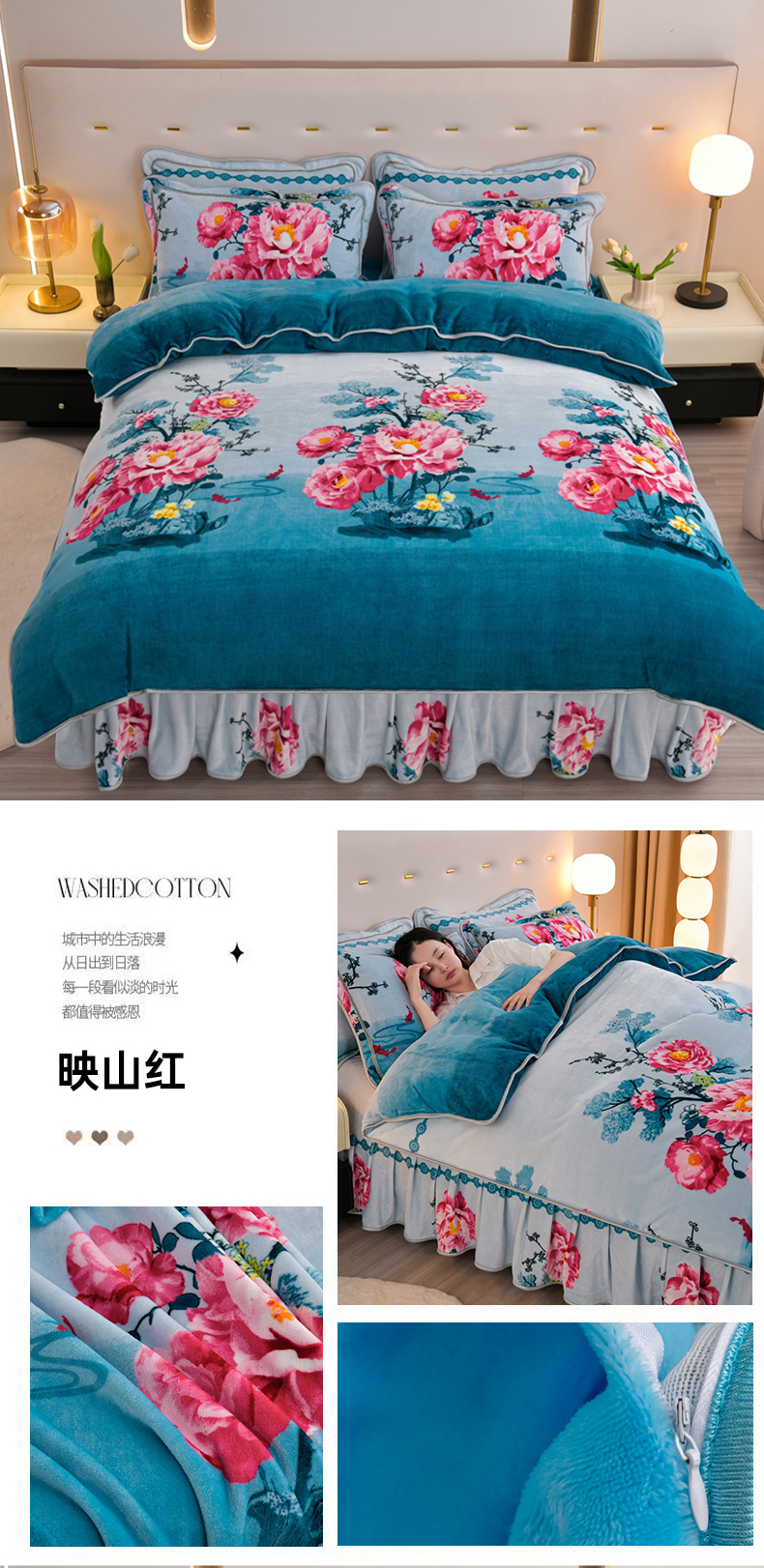 商品名称:绒耀 2025新款高克重牛奶绒四件套保暖四件套直播爆款电商爆款 映山红