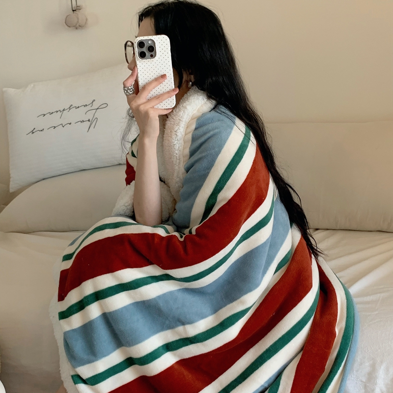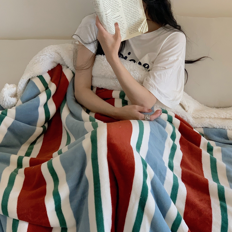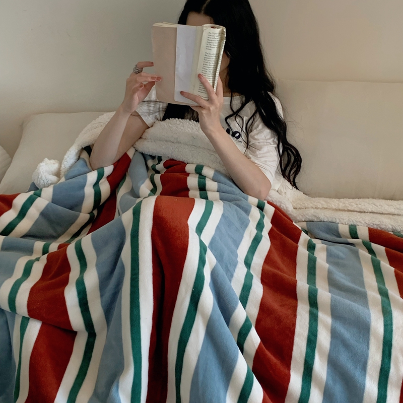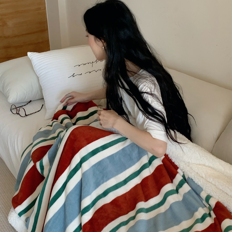 (总)桃喜 2024新款牛奶绒羊羔绒条纹系列盖绒毛毯午休毯多功能毛毯-场景二,多巴胺彩条,蓝咖条纹,栗子粉条纹,美式复古红蓝条,美式复古黄蓝条
