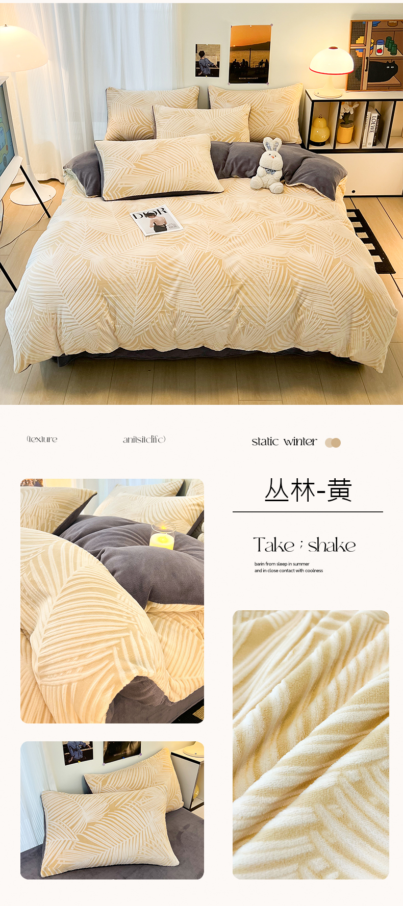 当前位置: 91家纺网 > 商品网购 > 床品套件 > 四件套 > 牛奶绒四件套 > 2024新款原创白色小清新场景雕花牛奶绒单被套四件套 丛林-黄