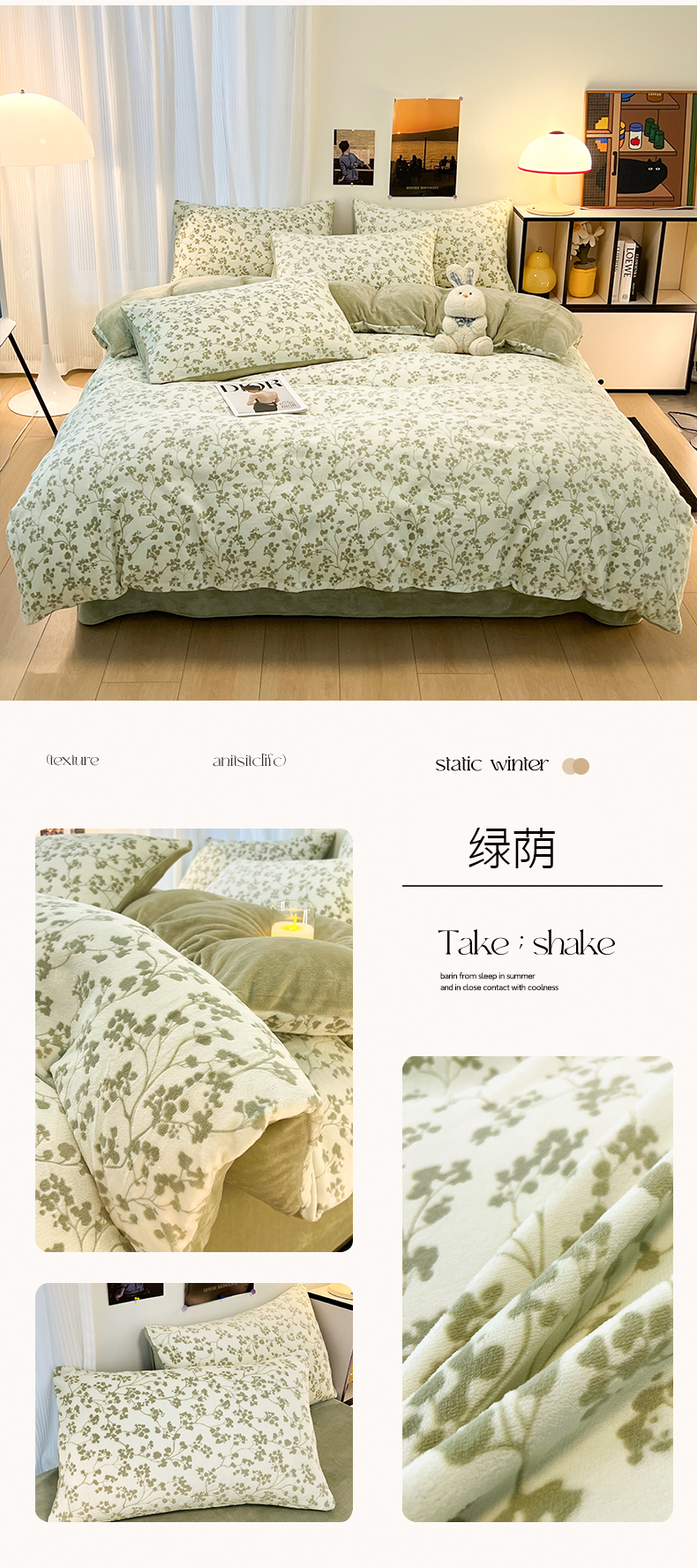 当前位置: 91家纺网 > 商品网购 > 床品套件 > 四件套 > 牛奶绒四件套 > 2024新款原创白色小清新场景雕花牛奶绒单被套四件套 绿荫