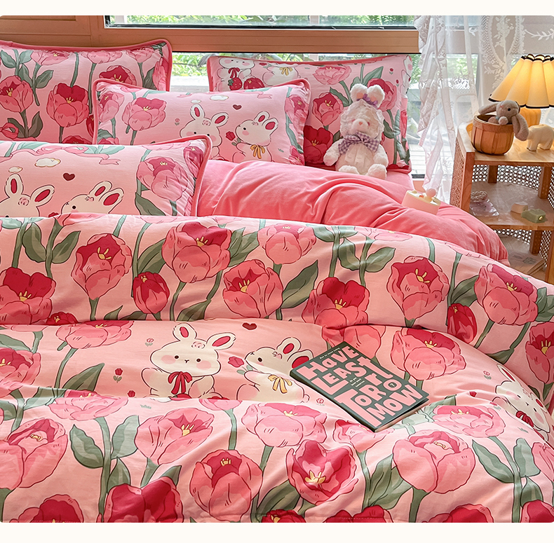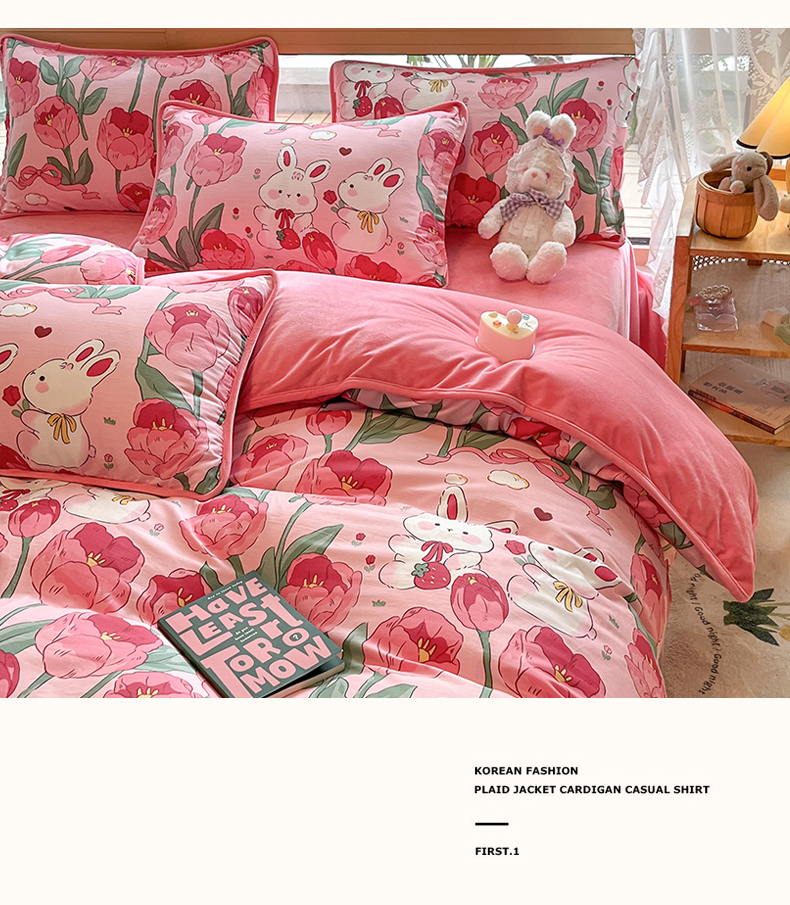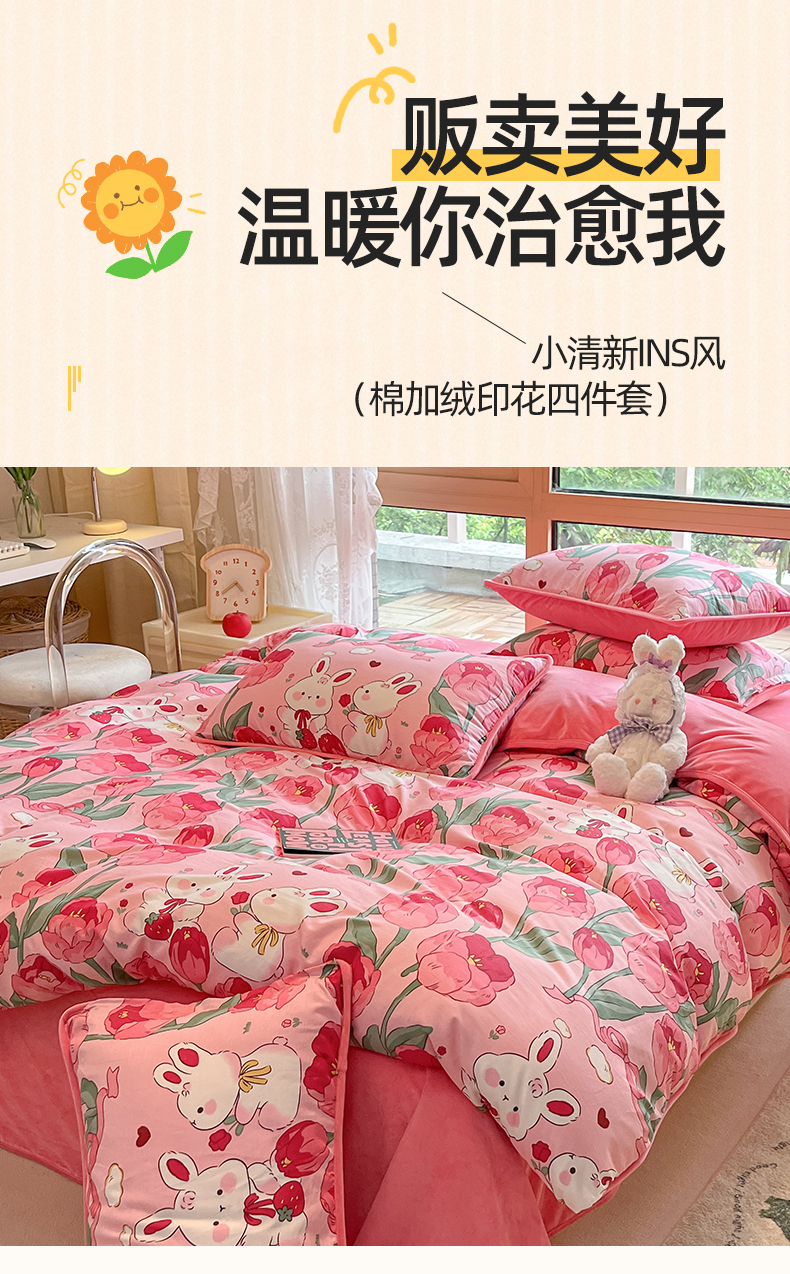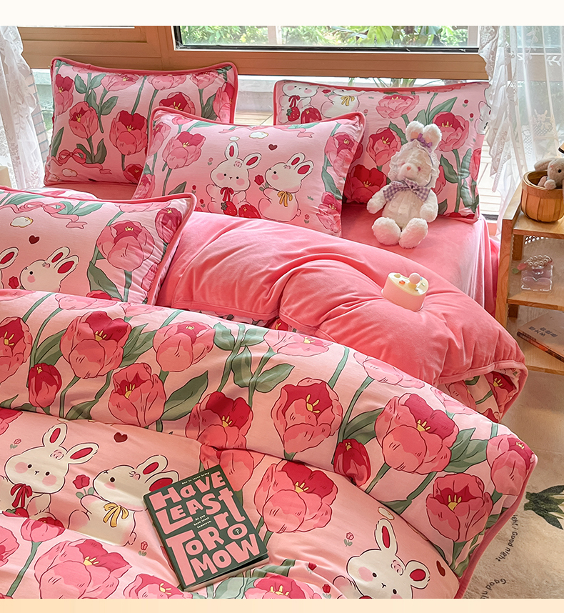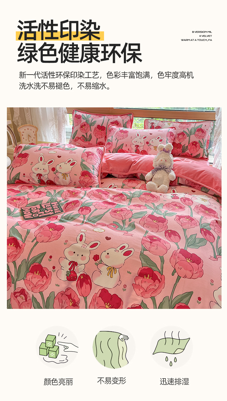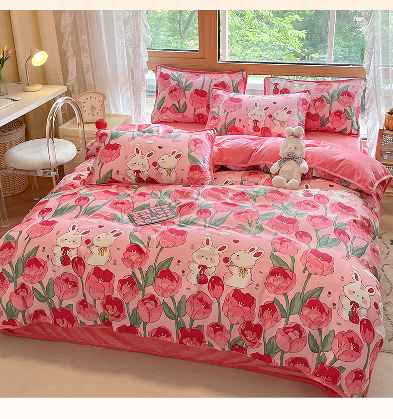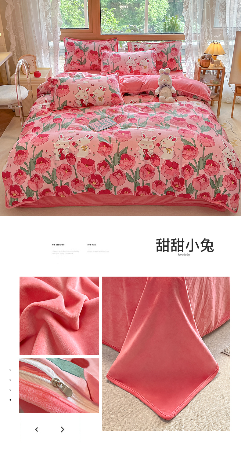 当前位置: 91家纺网 > 商品网购 > 床品套件 > 四件套 > 牛奶绒四件套 > 红粉佳人 2025新款棉加绒印花四件套 甜甜小兔