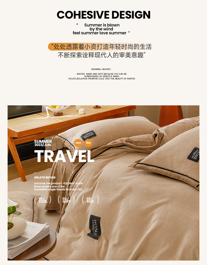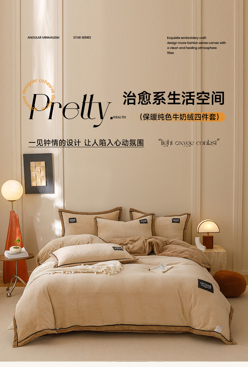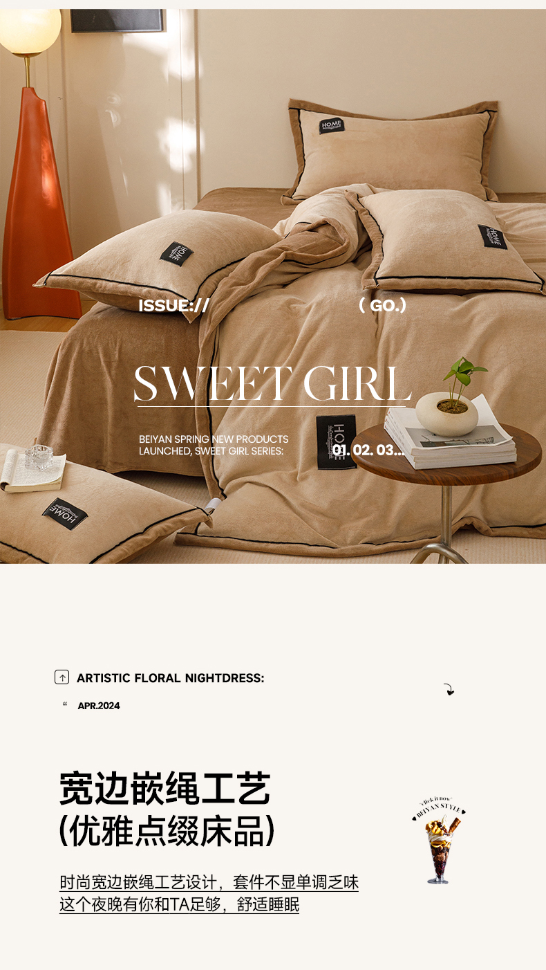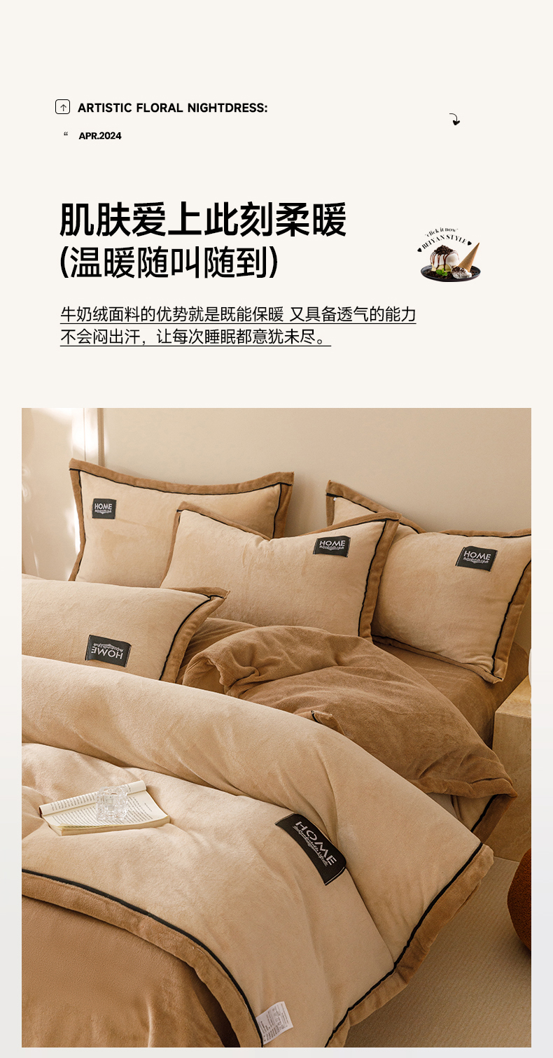 当前位置: 91家纺网 > 商品网购 > 床品套件 > 四件套 > 牛奶绒四件套 > 蜜柚 2024新款纯色简约双拼高克重牛奶绒包边四件套 奶茶+可可咖
